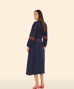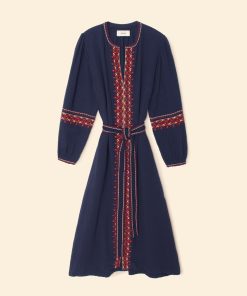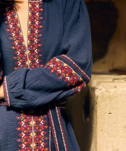 It’s all in the details. Gabriella is new this season in our washed double faced cotton gauze for a soft, gently crinkled feel. This long sleeve midi dress features multicolor arrow design embroidery, raglan blouson sleeves, side seam pockets, and a self-tie belt.