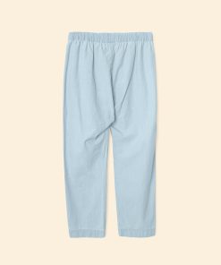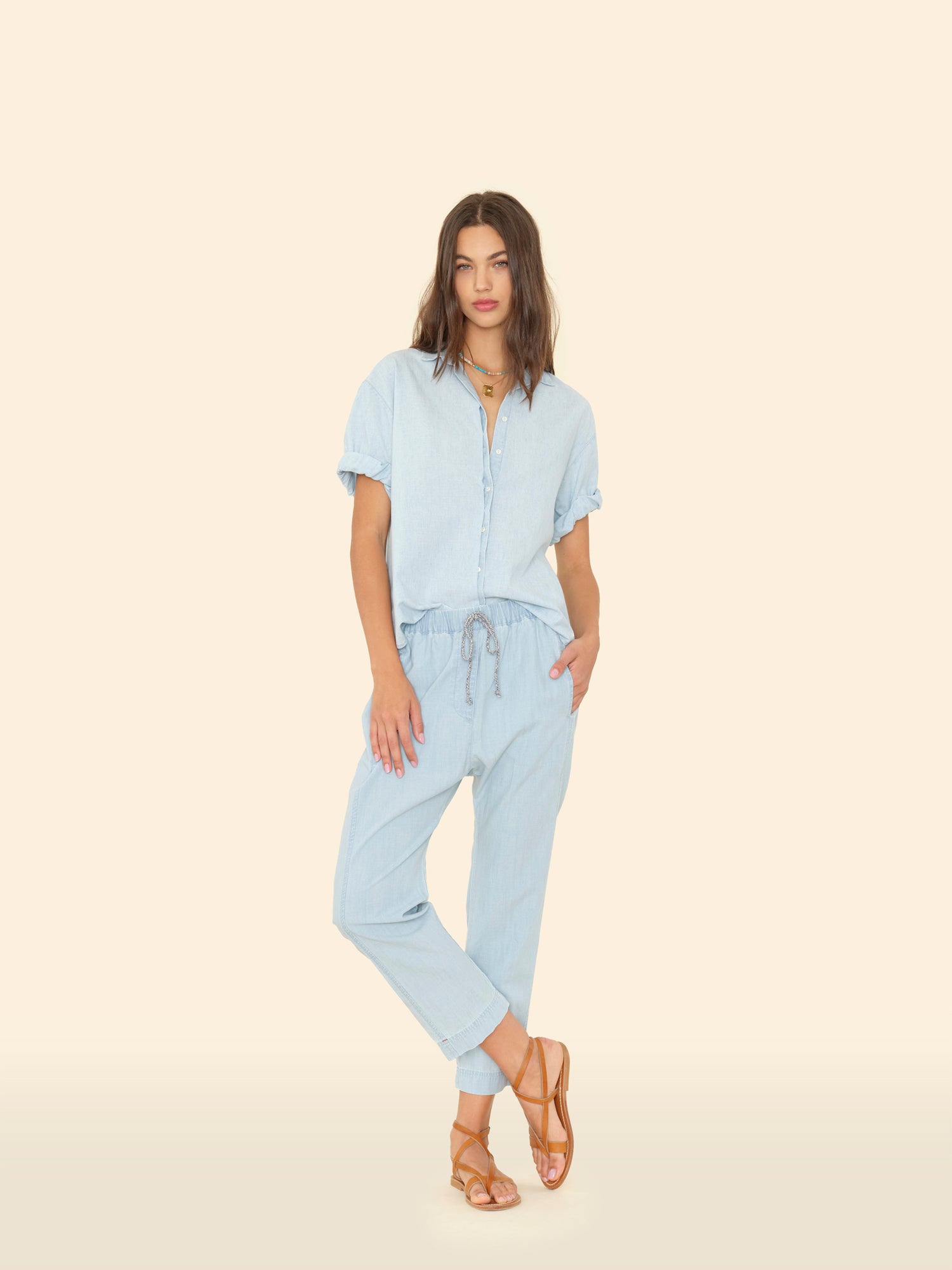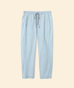 Vacation Mode. Draper is updated this season in our lightweight, soft-woven cotton chambray in a classic light blue wash. Draper is an easy pull-on pant with a drawstring waist and side seam pockets.