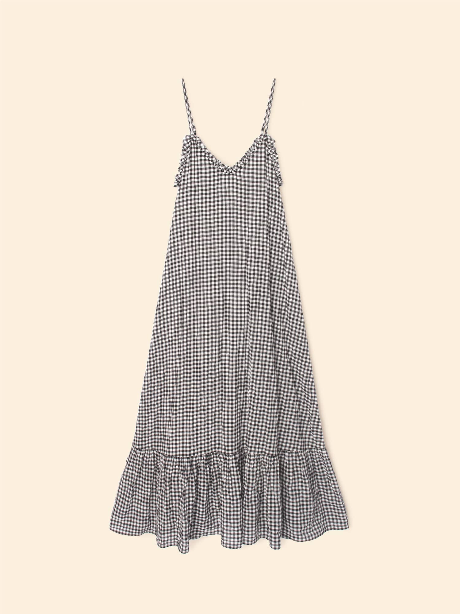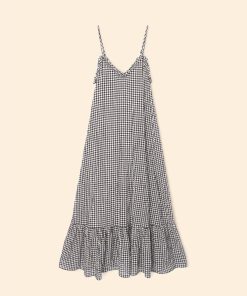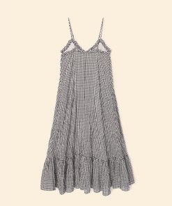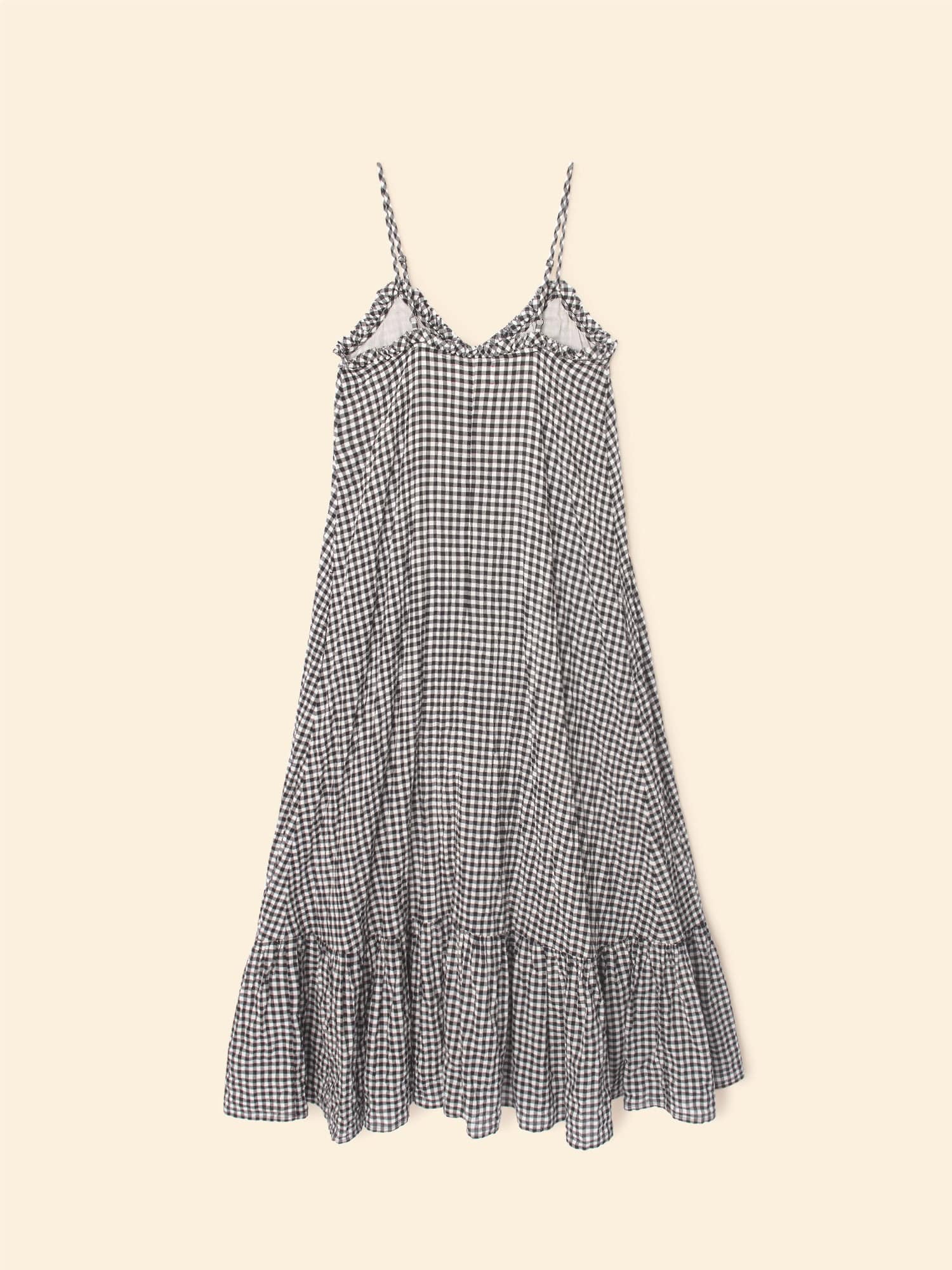 Checkmate. Taytum is new this season in our cotton gingham check with added stretch for ease of comfort. This fully lined midi dress features a tiered skirt, spaghetti straps, side seam pockets, and a raw edge ruffle hem.