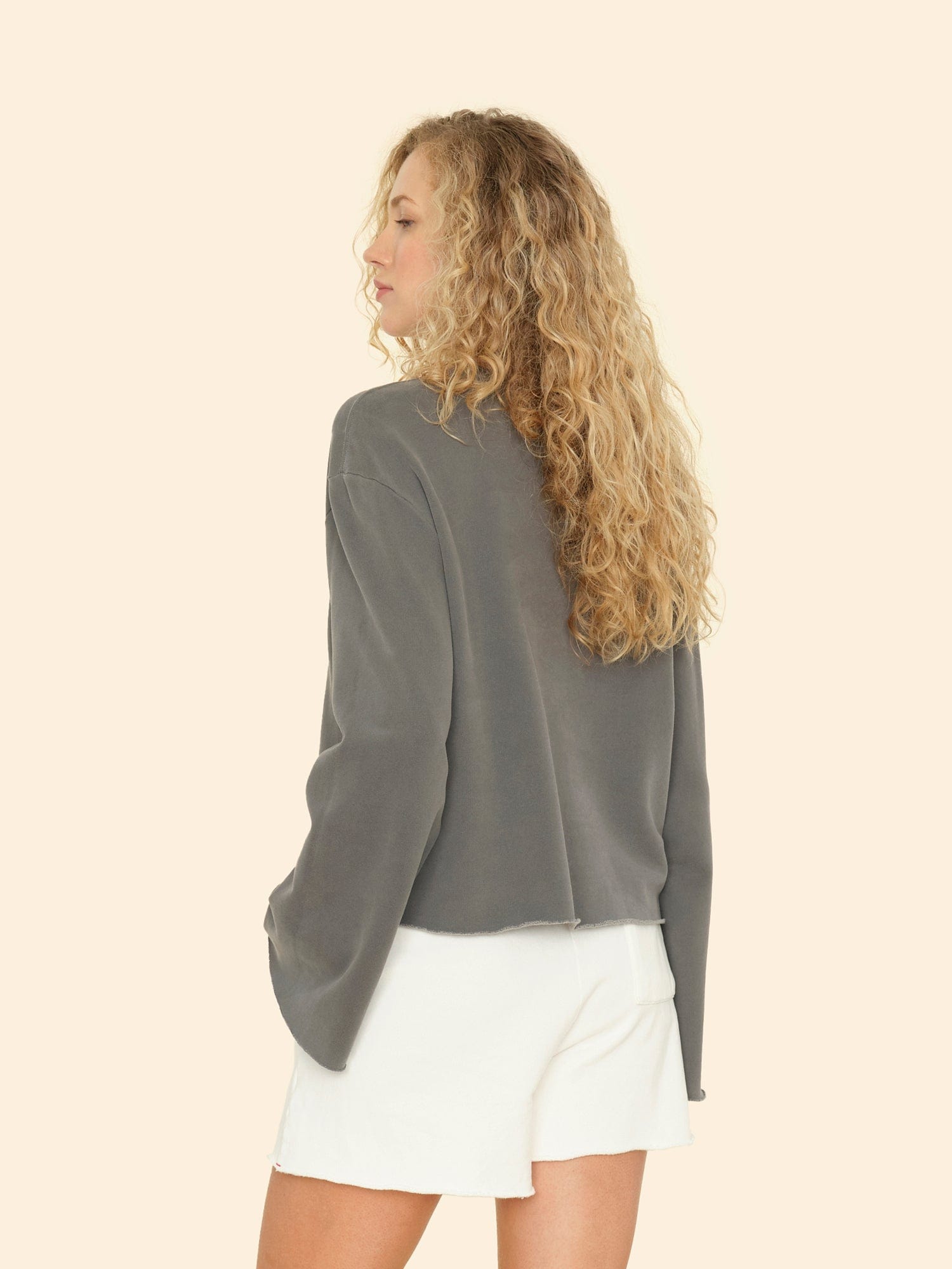 Make a (Cozy) Statement. Duke is new this season in our organic mineral wash terry, utilizing an eco-friendly dyeing process with natural dyes. This pullover sweatshirt features a crew neck, raw edge bell sleeves, and a raw edge hem.