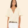 Pretty Please. Astryde is made in our classic lightweight woven cotton poplin for a lived-in look and feel. Astryde is a femme V-neck blouse that features a singular button-closure, short puff raglan sleeves with elastic ruffles, and shirred details throughout.