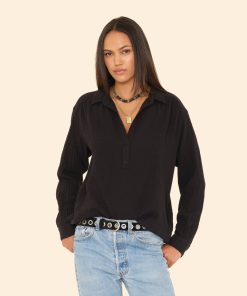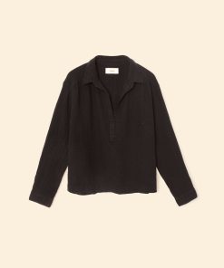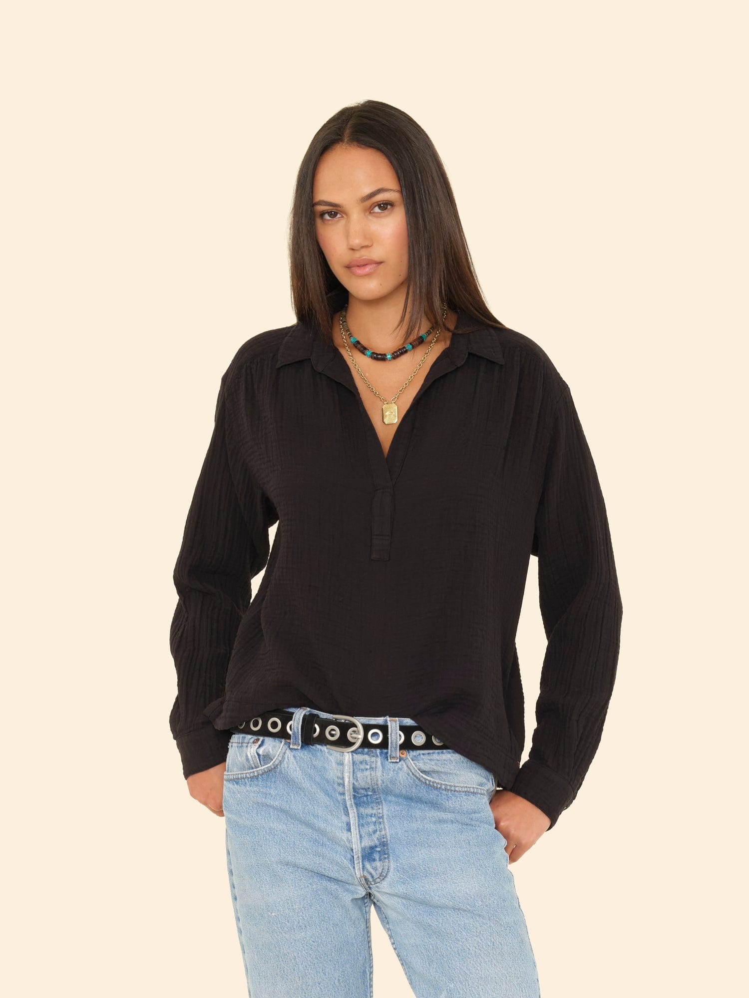 Bare Necessities. Brody is new this season in our washed double faced cotton gauze for a soft, gently crinkled feel. This easy popover top has a Johnny collar, shirred split neck, button cuffs, and a back yoke.