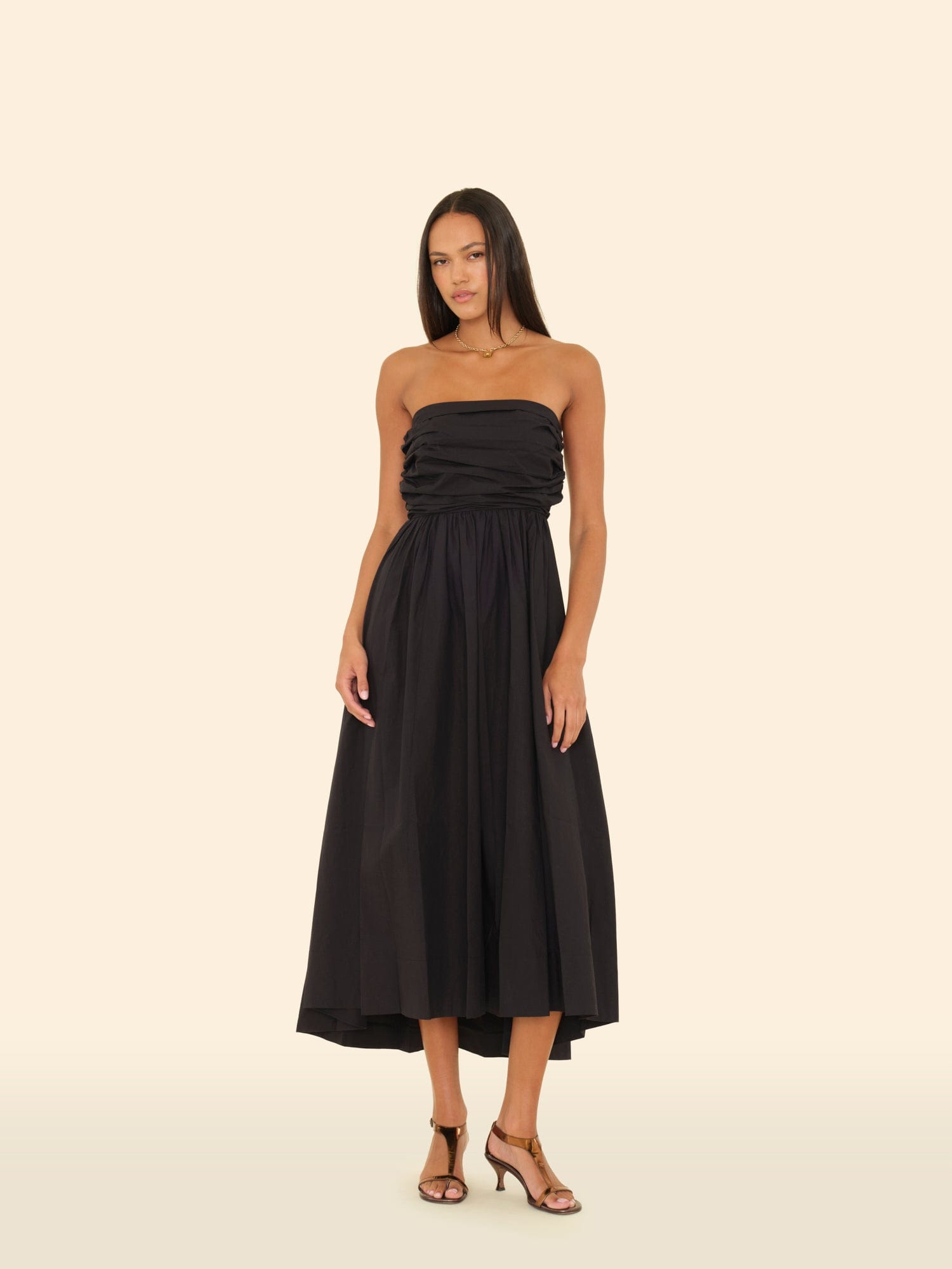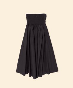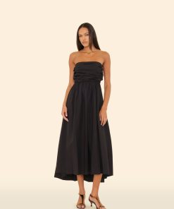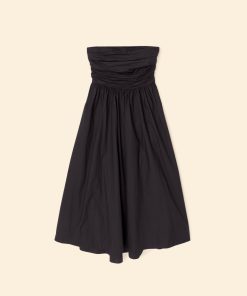 Pretty Please. Clea is made in our new crisp paper poplin with a refined feel. This strapless midi sundress features a gathered bodice with a smocked back, side seam pockets, and high low hem.