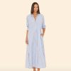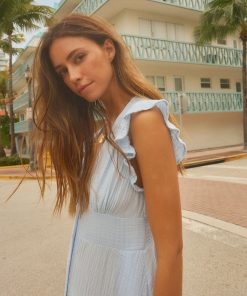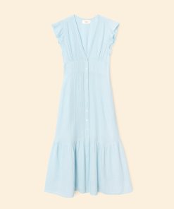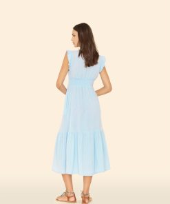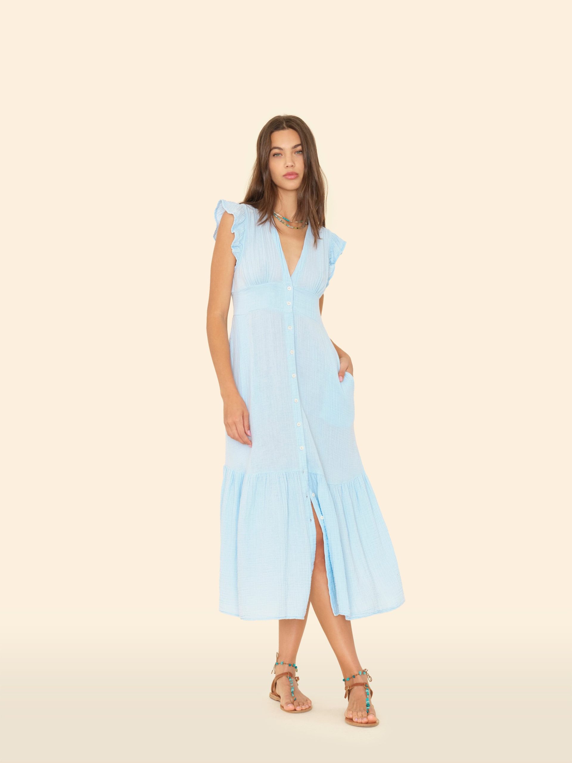 Pretty Please. Davana is new this season in our washed double faced cotton gauze for a soft, gently crinkled feel. This button-front midi dress features a V-neck, ruffle sleeves, side seam pockets, and a flounce ruffle hem.
