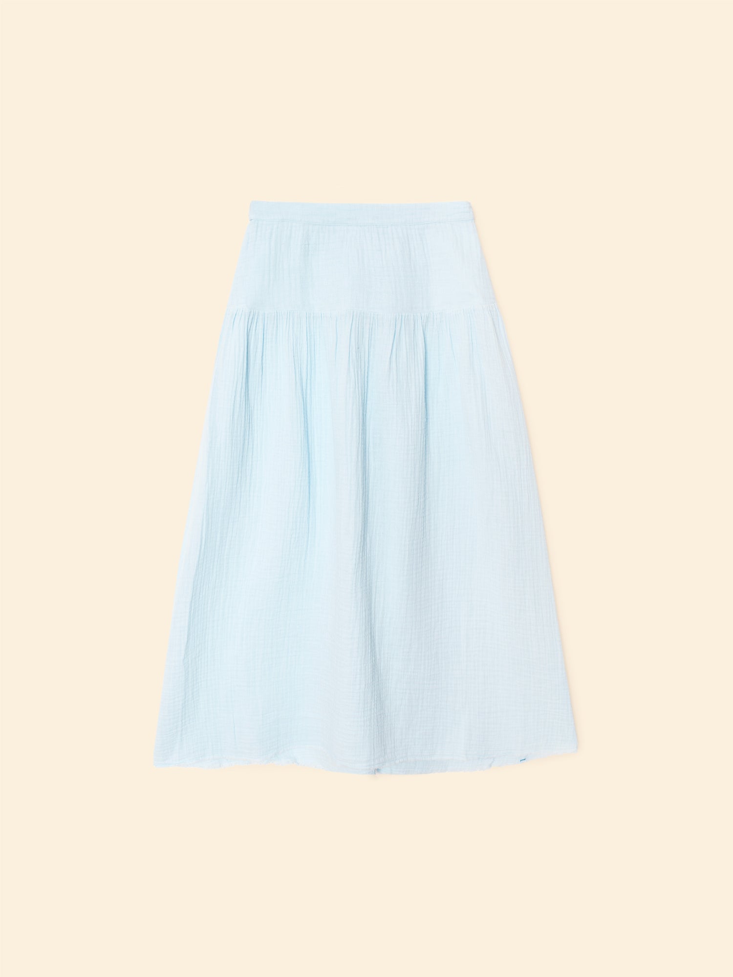 Easy Breezy. Evelyn is new this season in our washed double faced cotton gauze for a soft, gently crinkled feel. Evelyn is an A-line pull on skirt with a flat front waistband and elasticized back waist, front and back yokes, and raw edge hem. Pair back with our Rosie top for easy elegance.
