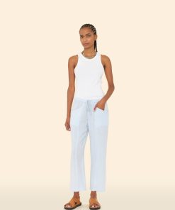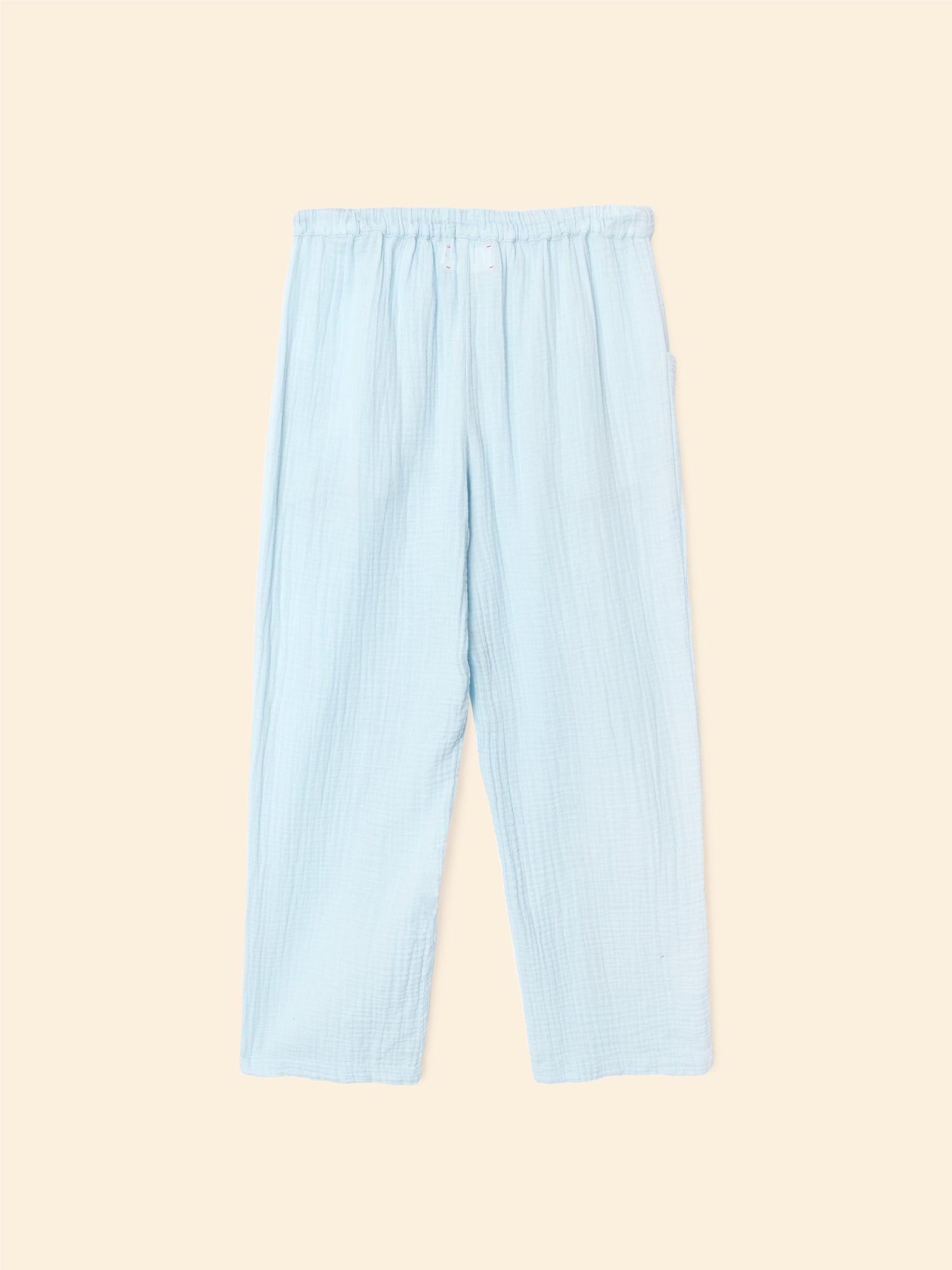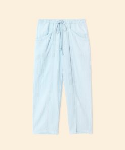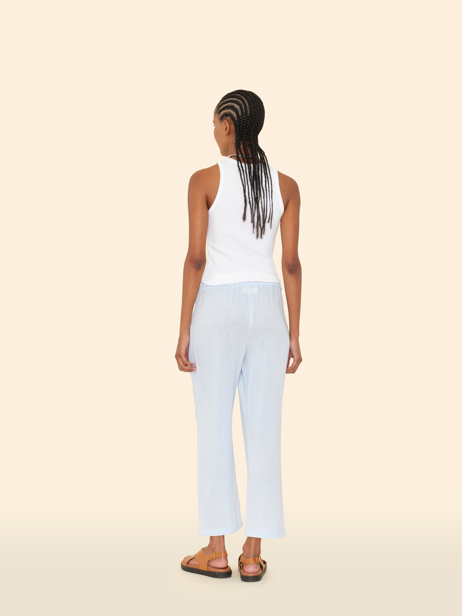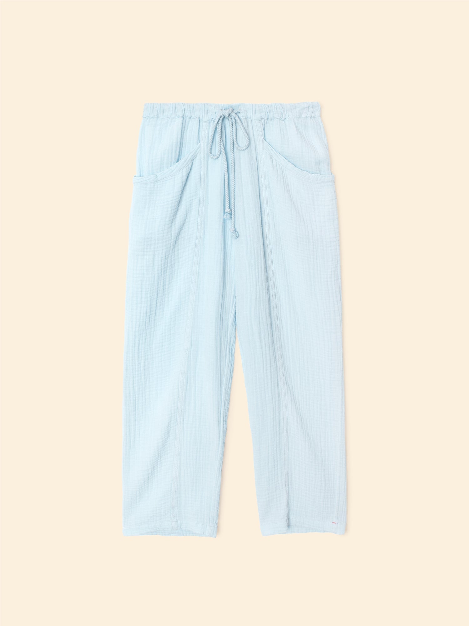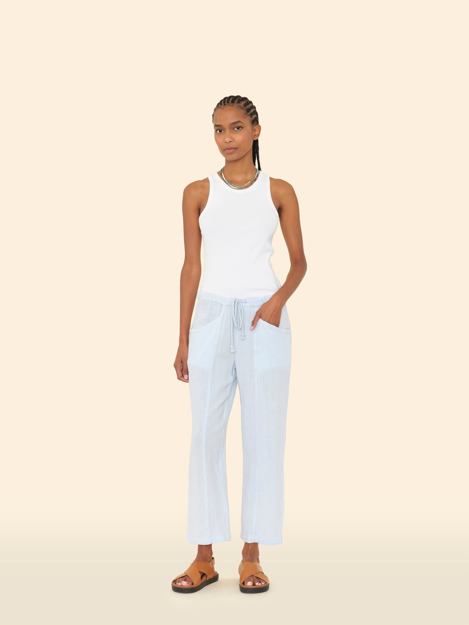 Sitting Pretty. Ozzie is new this season in our washed double faced cotton gauze for a soft, gently crinkled feel. Ozzie is a cropped pull on pant with an elasticized drawstring waist, slant pockets, and a center-front seam.