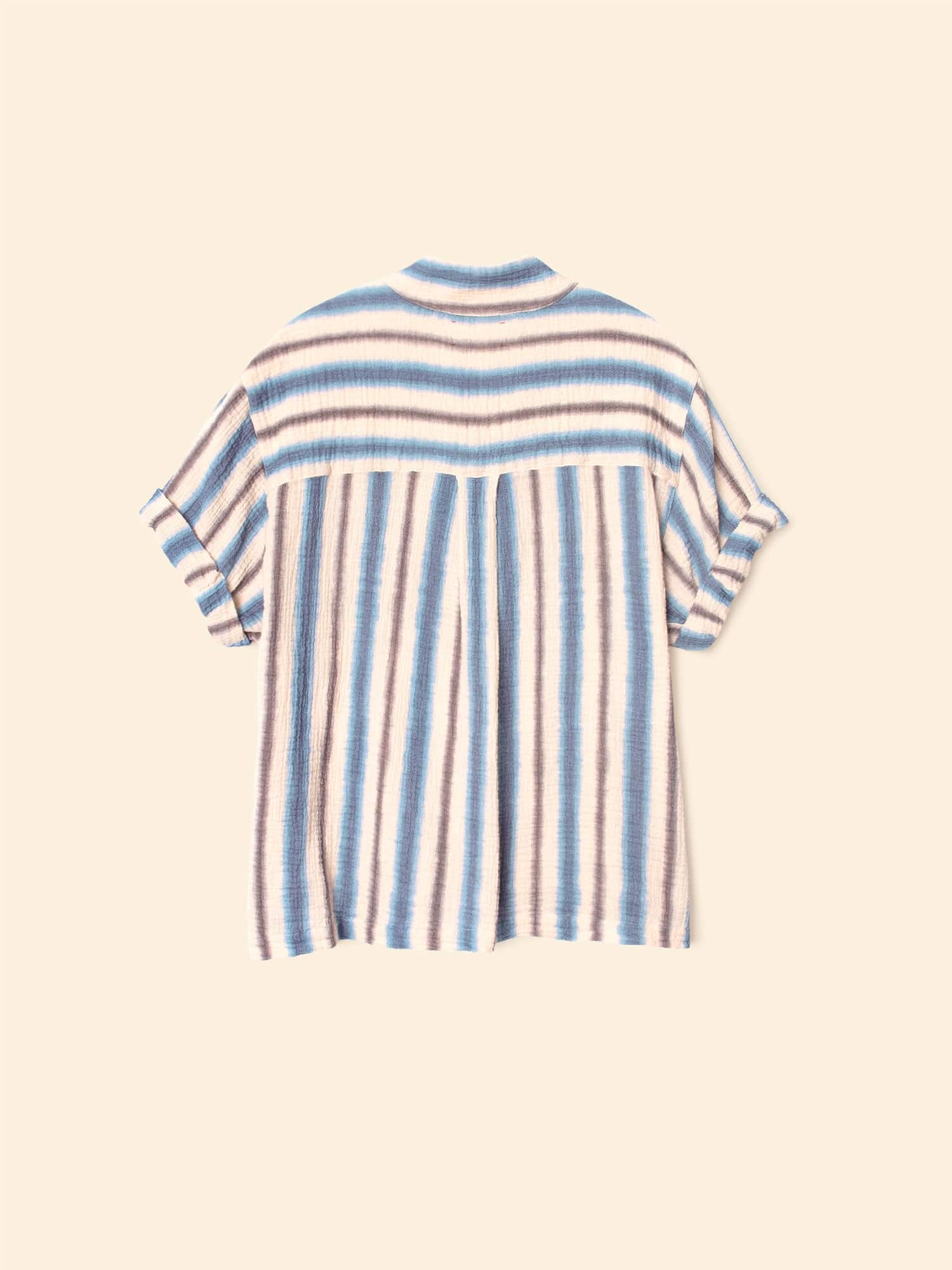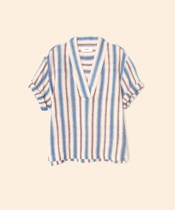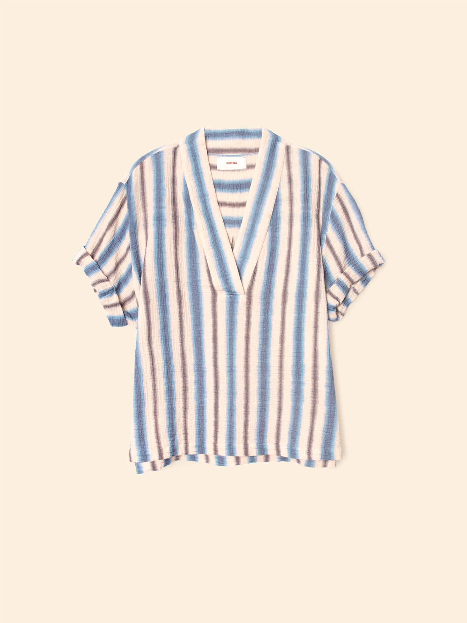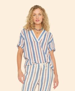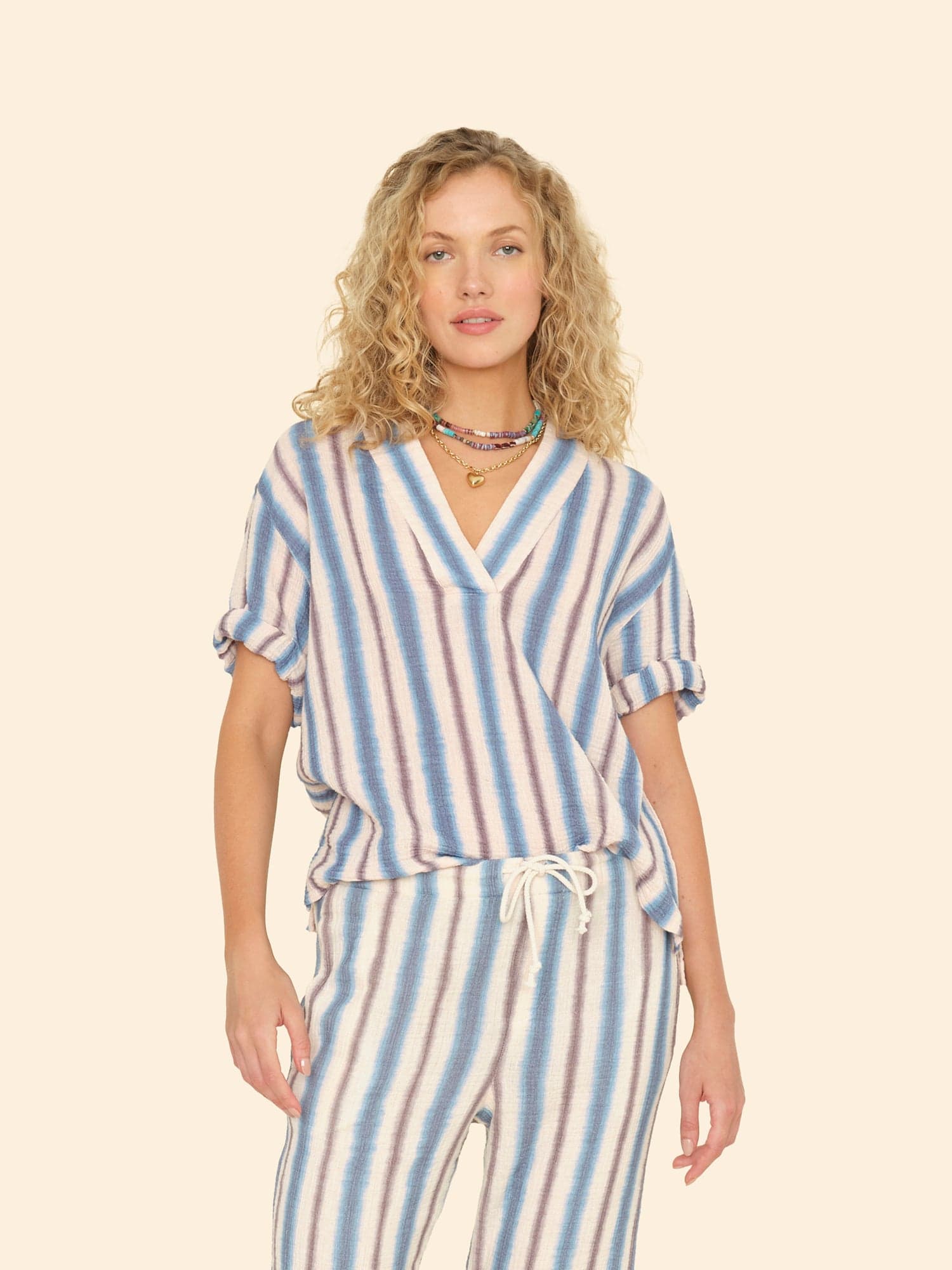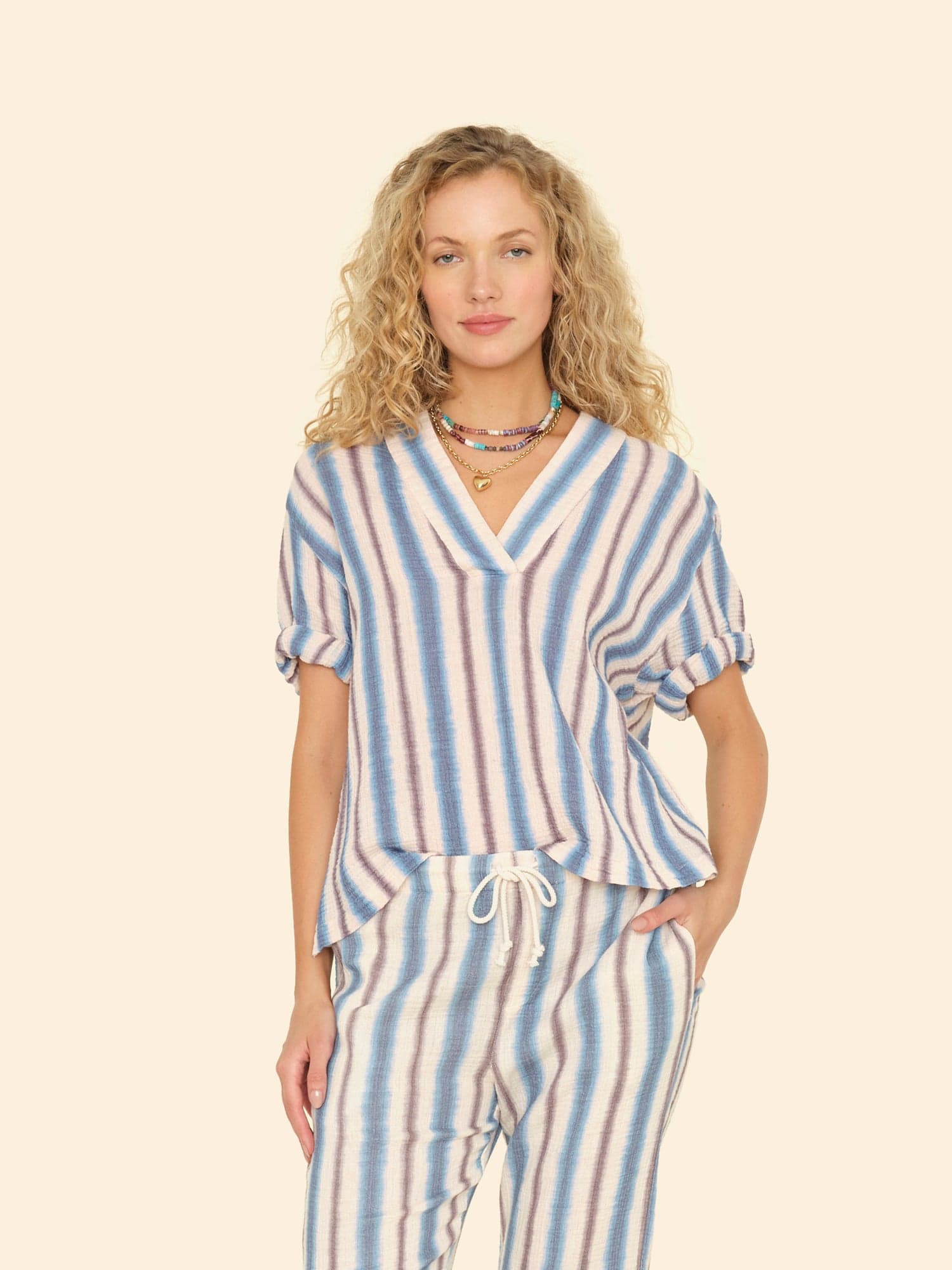 Striped Delight. Avery is updated this season in our washed double faced stripe cotton gauze for a soft, gently crinkled feel. This lightweight pullover top has a deep V-neck and rolled sleeves for an easy, effortless feel.