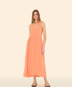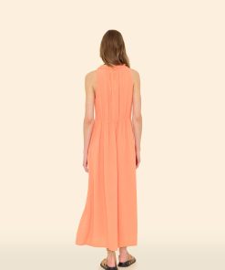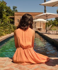 Easy Breezy. Liza is new this season in our washed double faced cotton gauze for a soft, gently crinkled feel. Liza is a sleeveless midi dress with a raw edge collar, split neck with stitched seam detail, elasticized back waist, and side seam pockets.