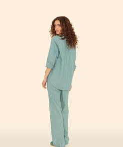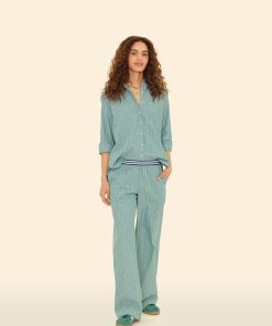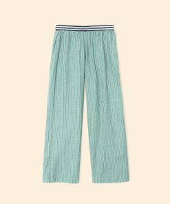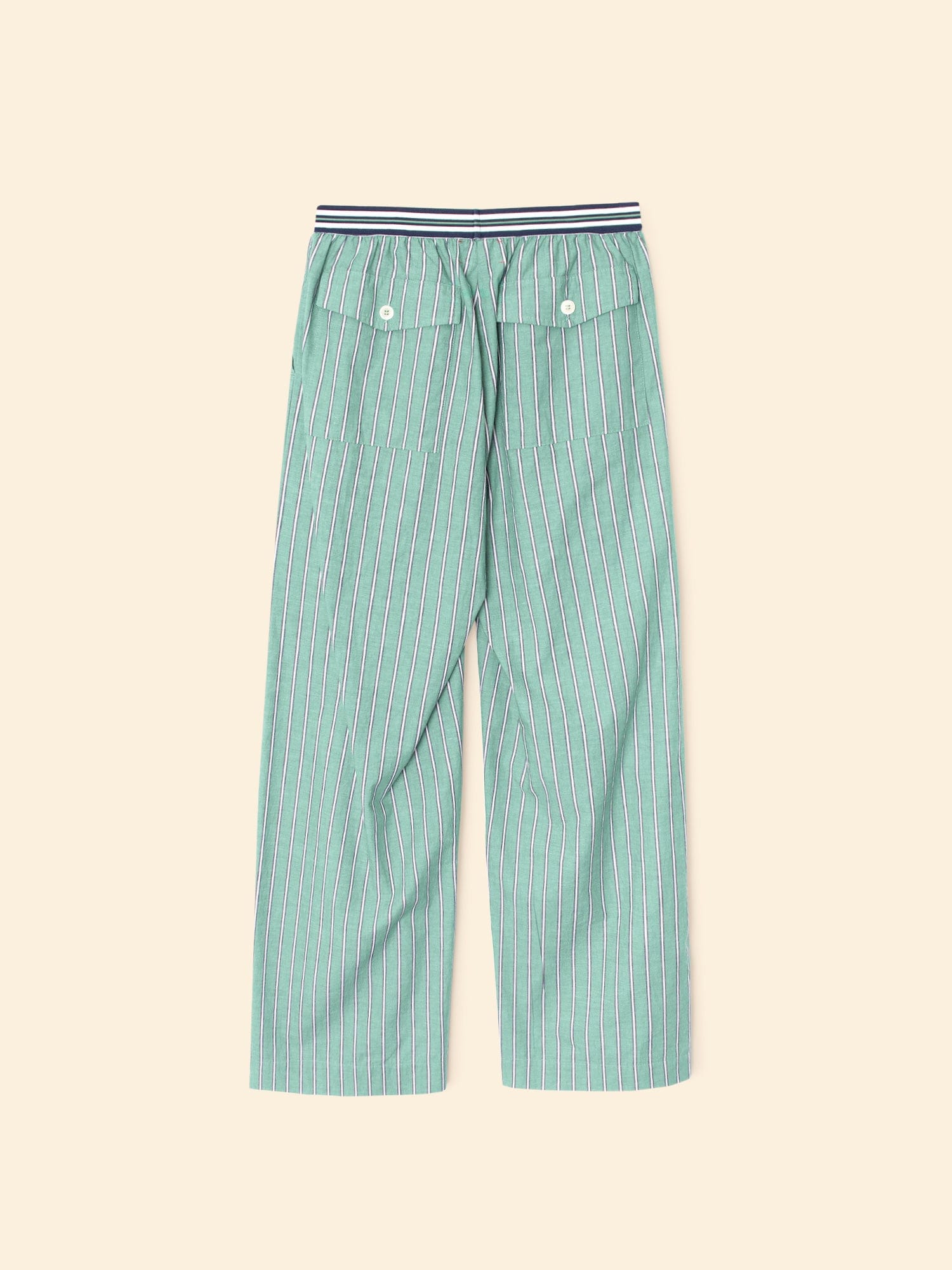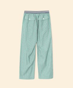 Earn your stripes. Made in our crisp cotton pencil stripe, Alto is a wide leg pull on pant with a contrast color stripe elasticized waist, side seam pockets, and back pockets with button closures.