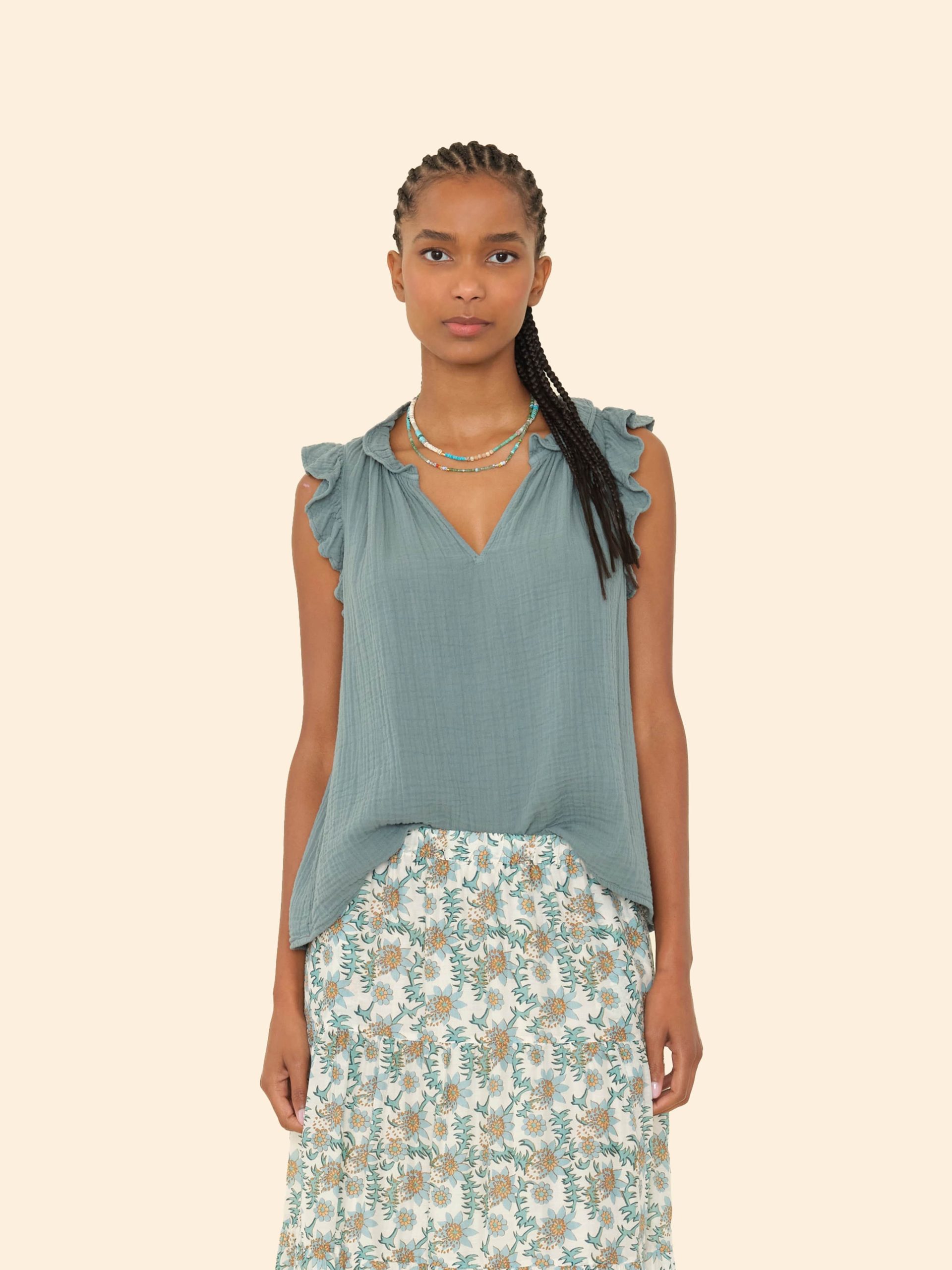 Ruffle Up. Bex is updated this season in our washed double faced cotton gauze for a soft, gently crinkled feel. This bestselling popover top has a deep V-neck, ruffle detailing and shirring throughout.