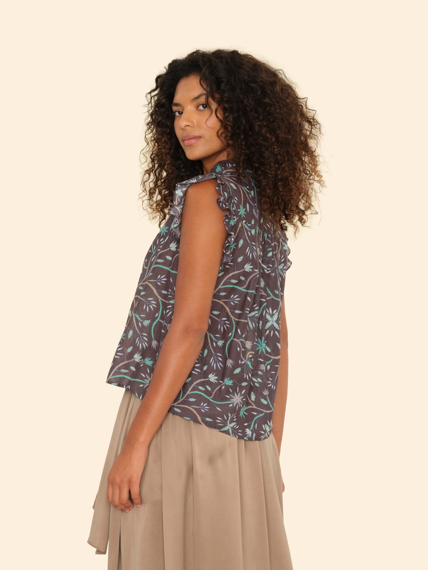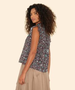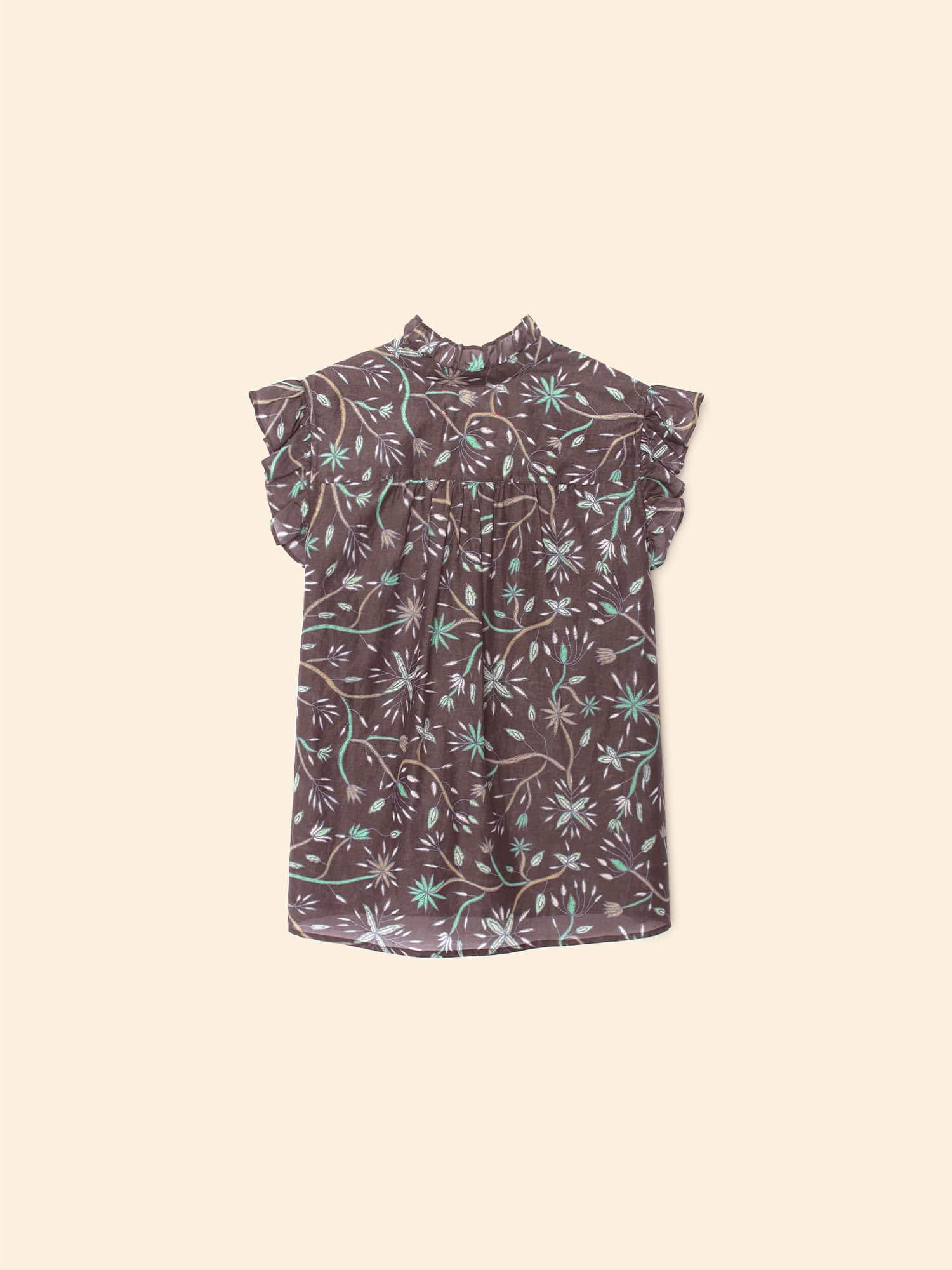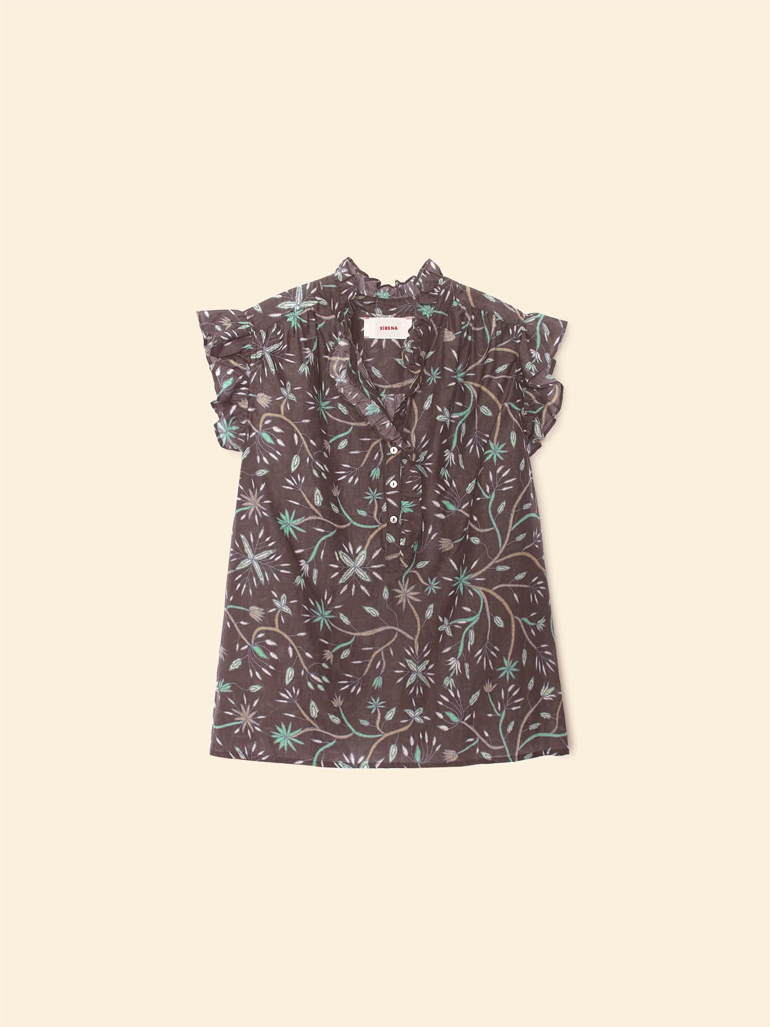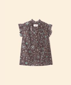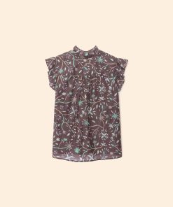 Blooming Marvelous. Brenna is updated this season in our vintage-inspired cotton silk voile floral print. Brenna combines all of our favorite elements from our bestselling Caspian and Bex tops with its ruffle details throughout the neck, front placket, and sleeves. This relaxed button-front top also features a band collar and ruched back yoke.