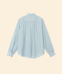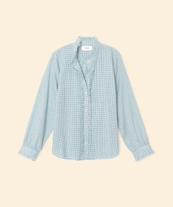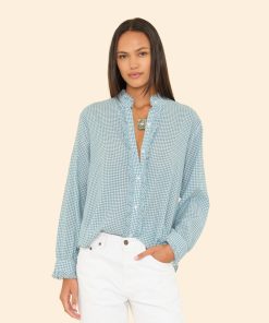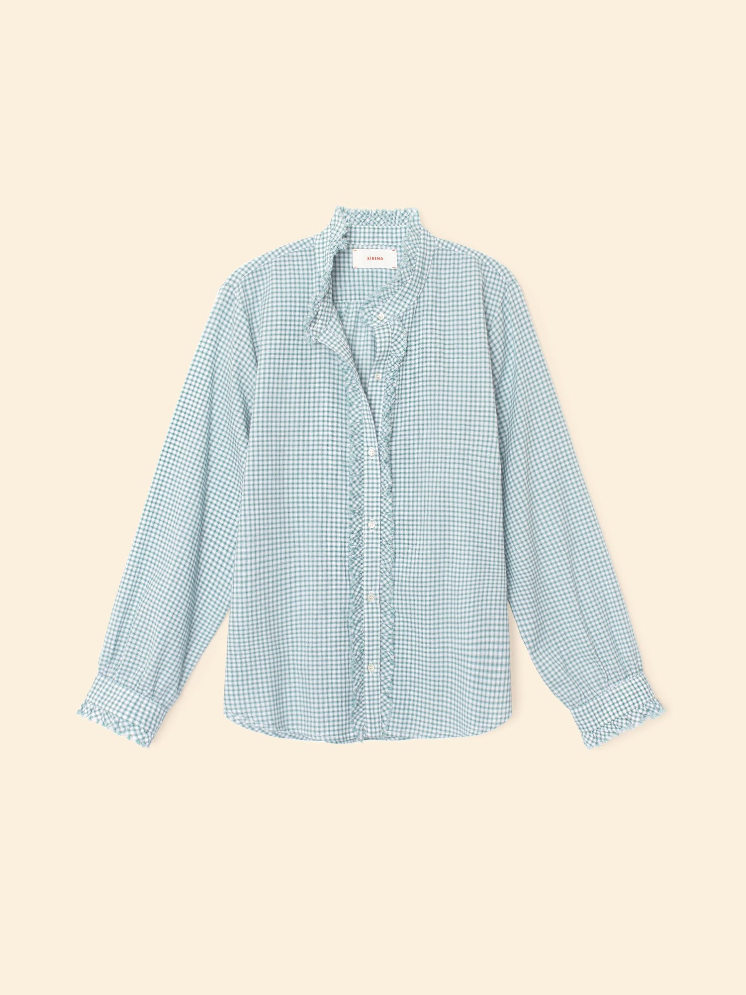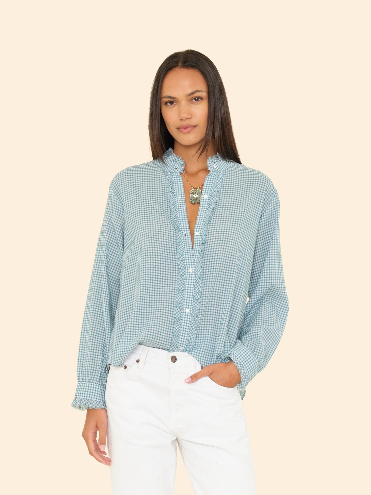 Checkmate. Amelie is new this season in our cotton gingham check with added stretch for ease of comfort. This button-front shirt features raw edge ruffle details throughout the neck, front placket, and cuffs.
