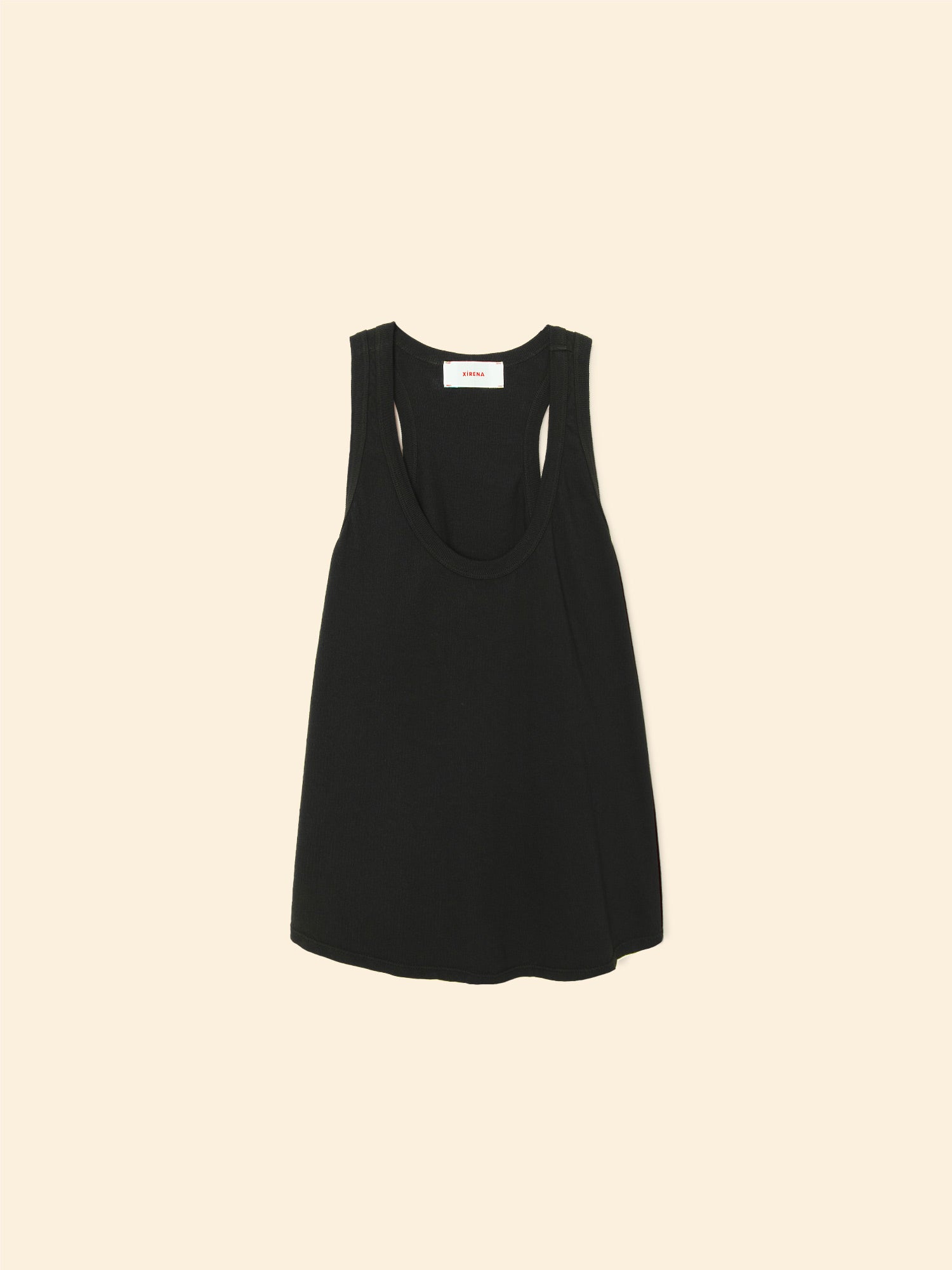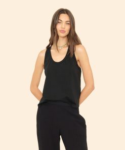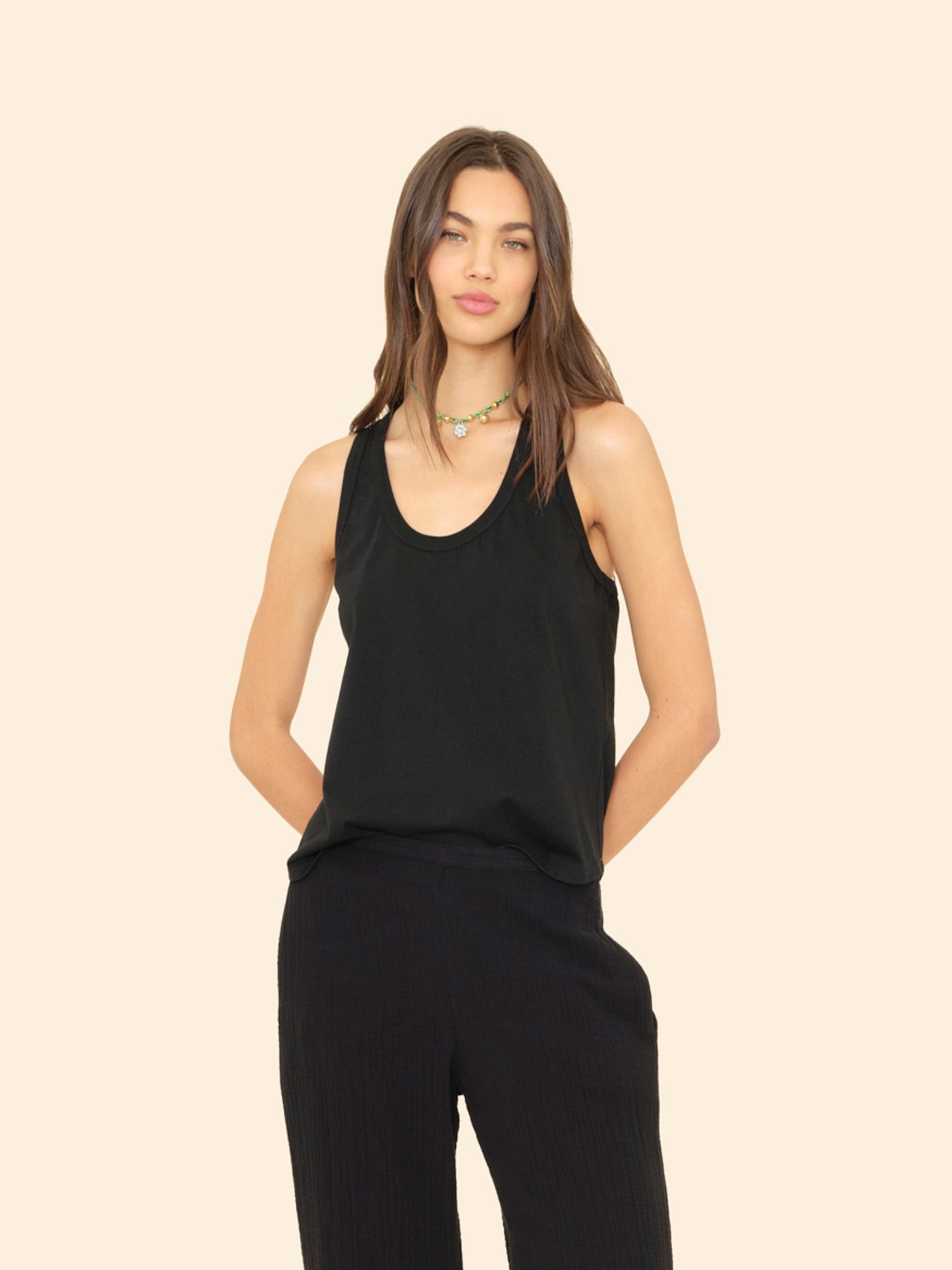 Back to Basics. Jett is back this season in our ultra-soft cotton jersey. This racerback tank features wide self-binding along the neck and a curved high low shirttail hem. Pair back with the Crispin pant for ultimate ease and comfort.