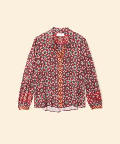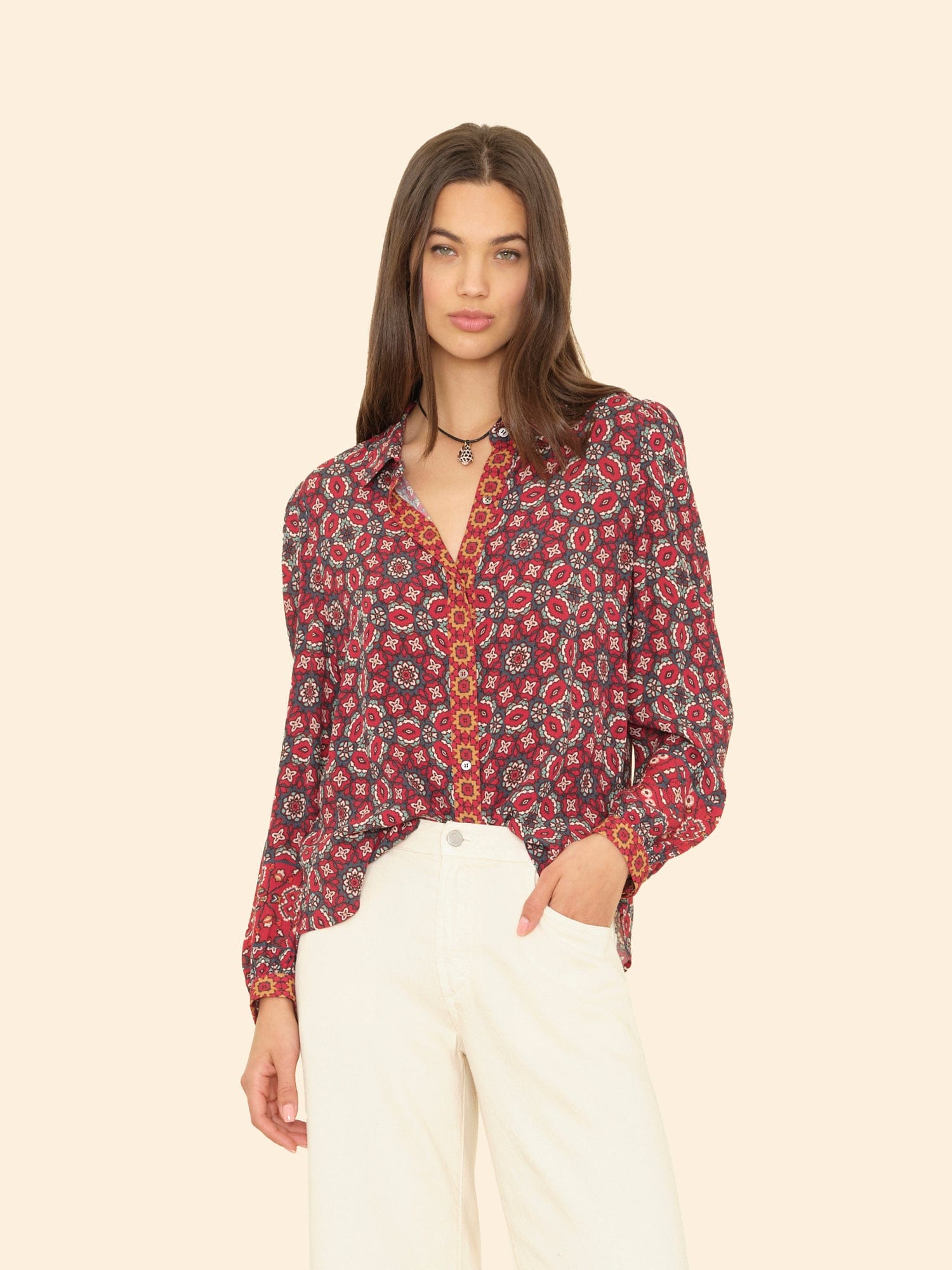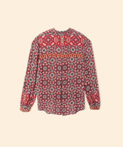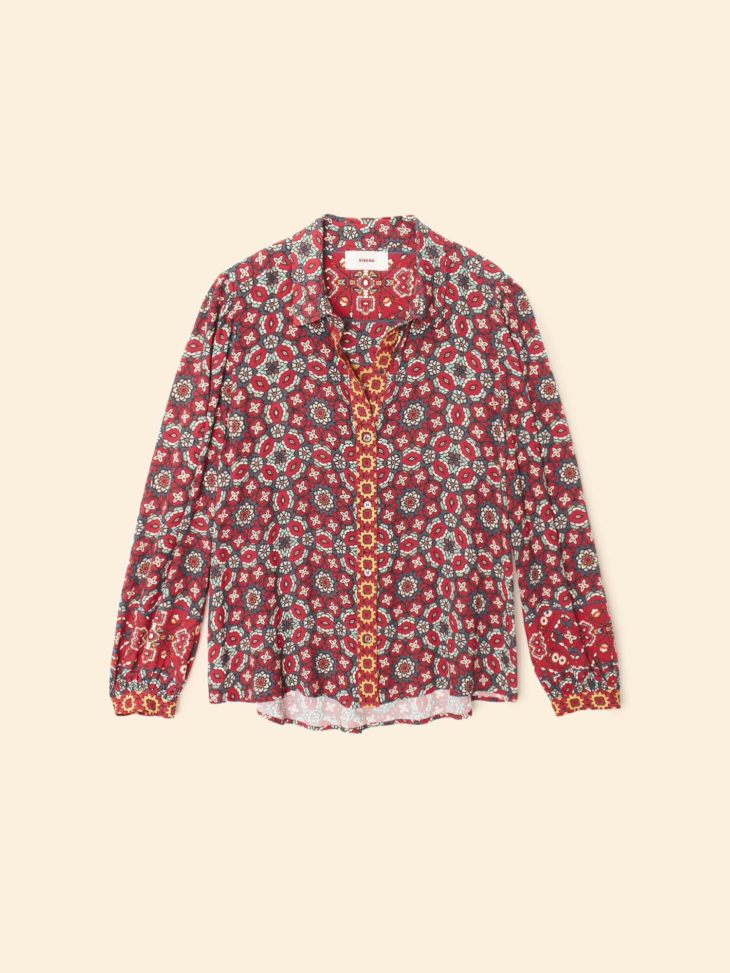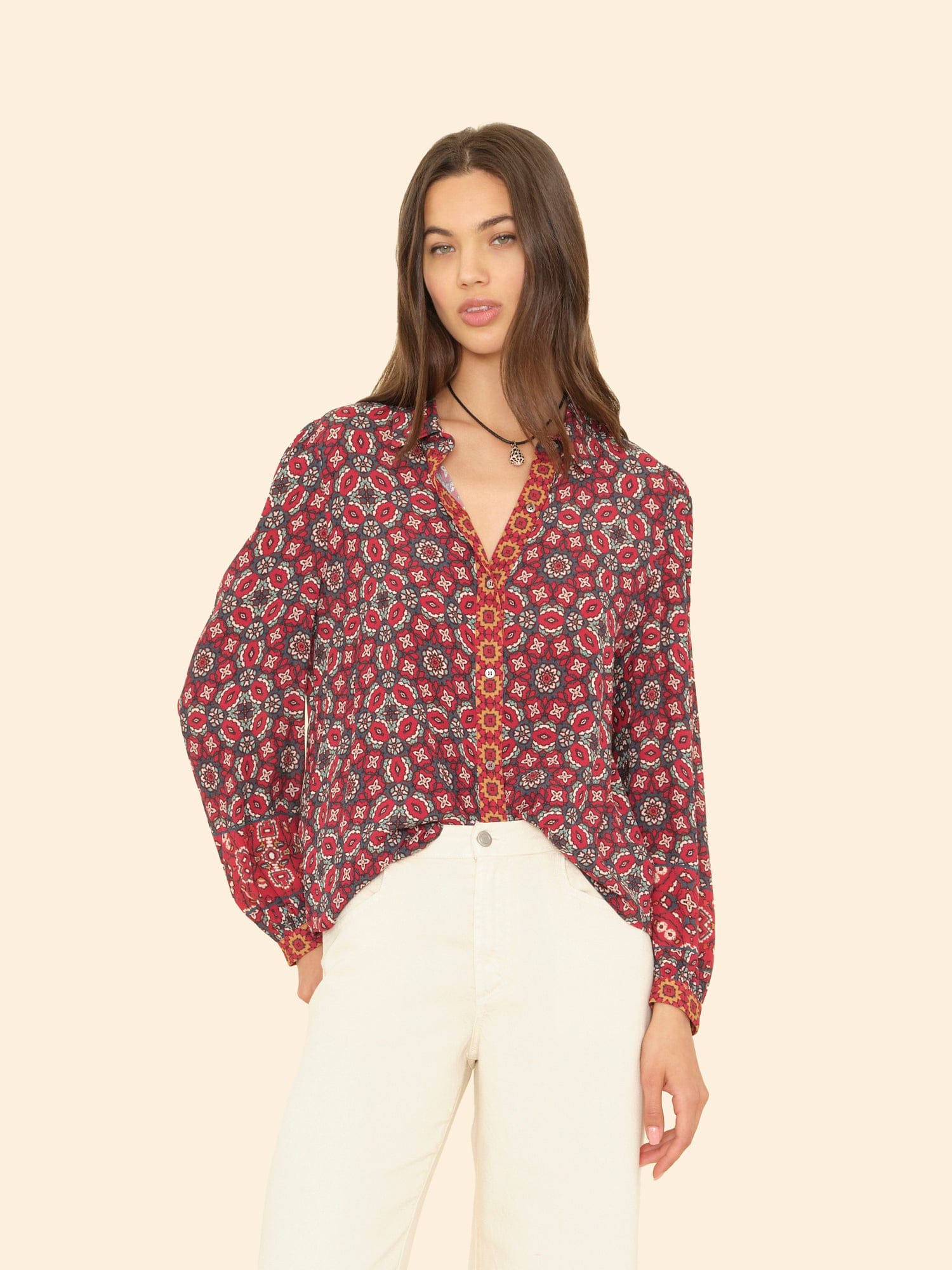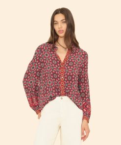 Mosaic Medley. Gaby is new this season in our mosaic tile print viscose rayon. This button-front shirt features shirred blouson sleeves, button cuffs, and an inverted pleat back yoke.