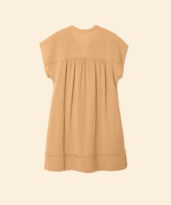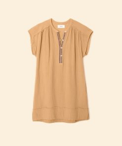 French allure meets California ease. Talula is made in our washed double faced cotton gauze for a soft, gently crinkled feel. This mini shift dress features an extended shoulder, multi-colored embroidery trim at the neck with a rouleau button-front, side seam pockets, and raw edge details.