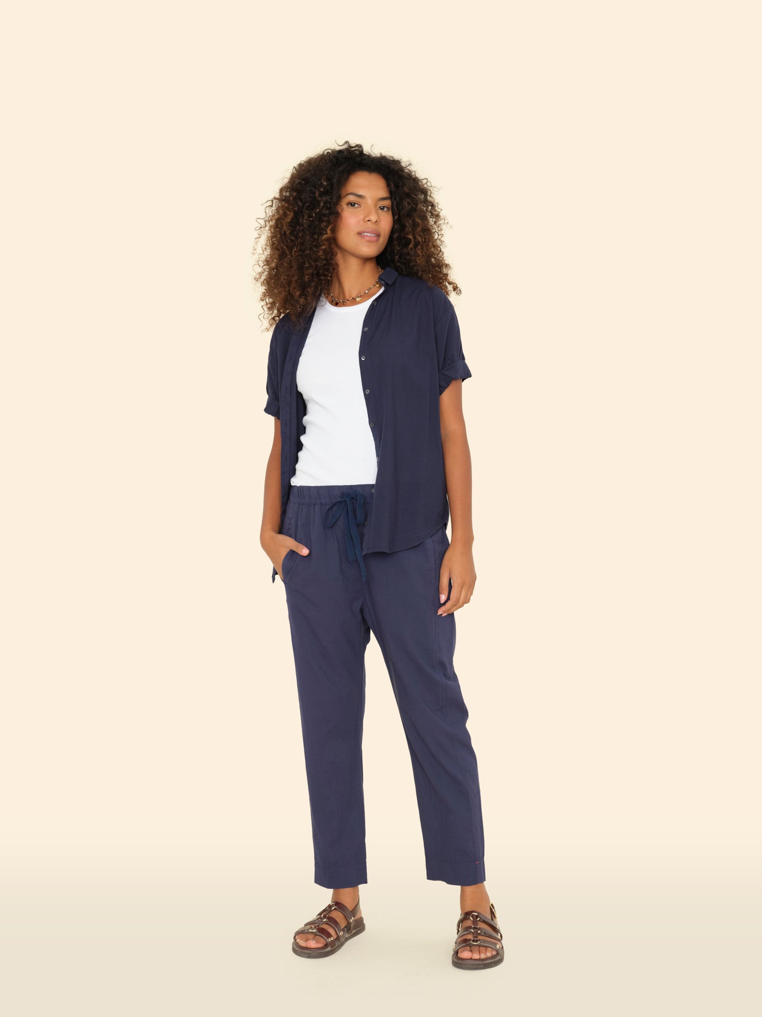 Easy does it. Draper is made in our classic lightweight woven cotton poplin for a lived-in look and feel. Draper is an easy pull-on pant with a drawstring waist and side seam pockets.
