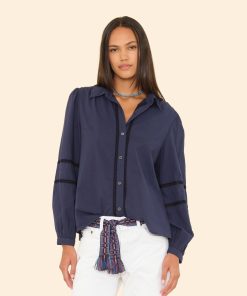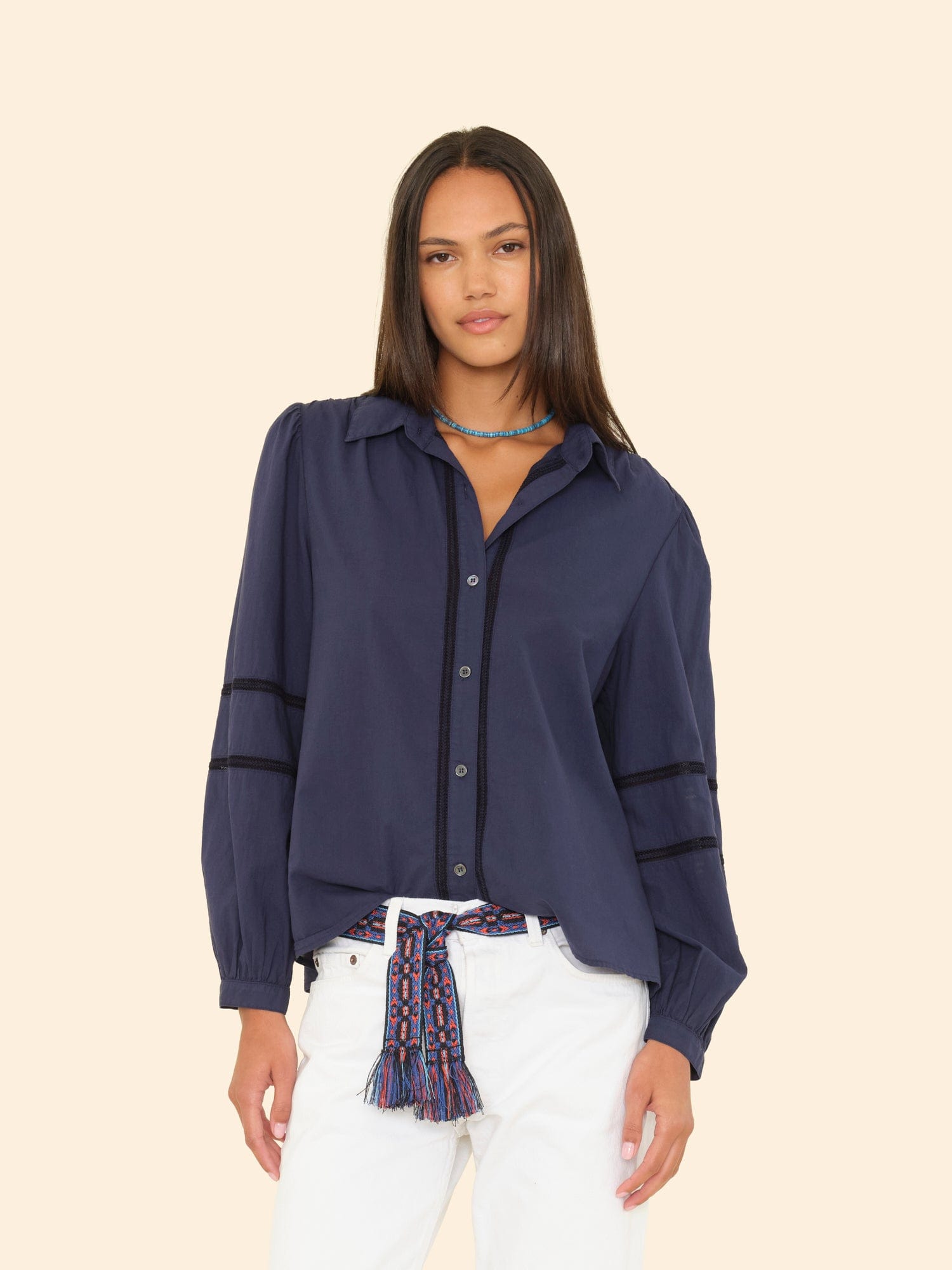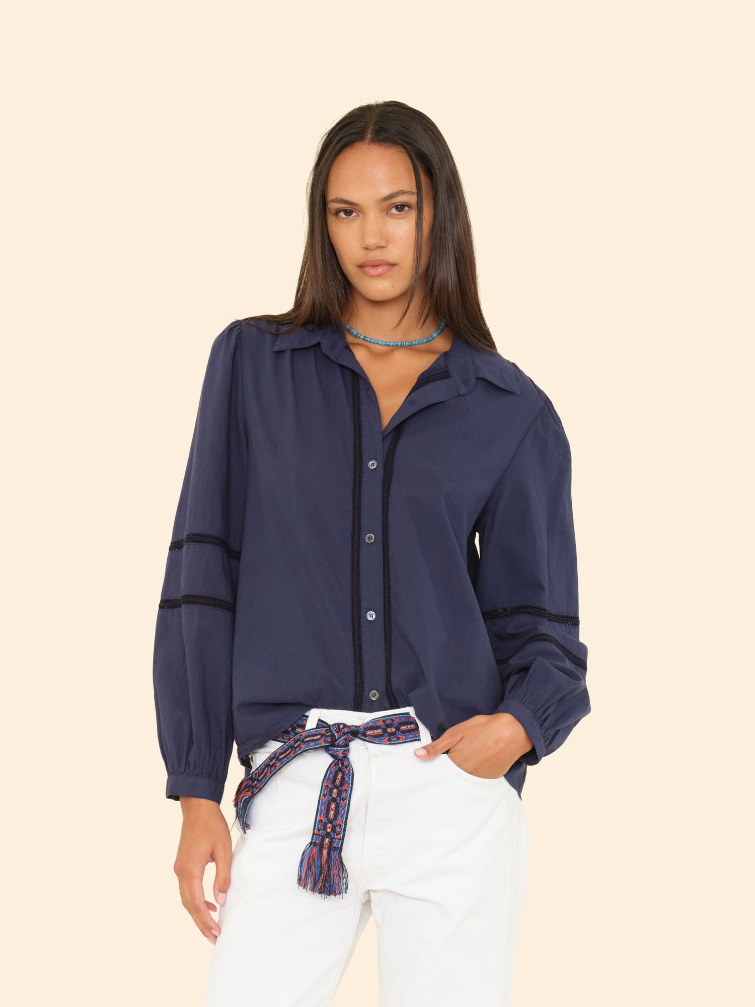 It’s all in the details. Renata is new this season in our classic lightweight woven cotton poplin for a lived-in look and feel. This femme button-front shirt features lattice trim details, blouson sleeves, and a shirred back yoke.