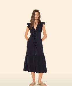 Pretty Please. Davana is new this season in our washed double faced cotton gauze for a soft, gently crinkled feel. This button-front midi dress features a V-neck, ruffle sleeves, side seam pockets, and a flounce ruffle hem.