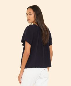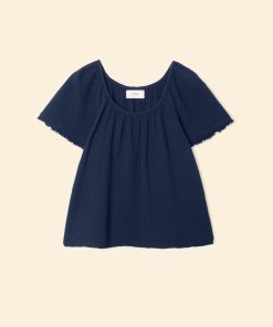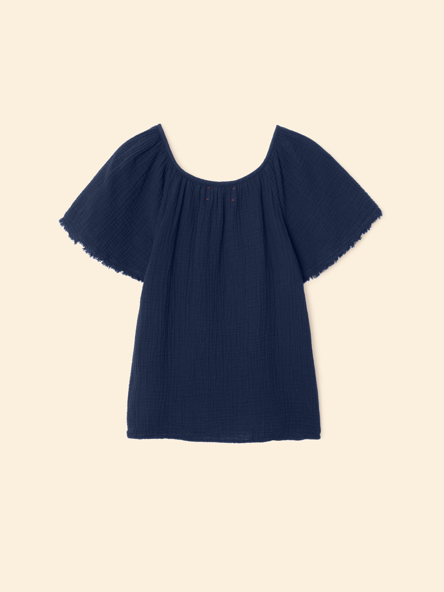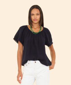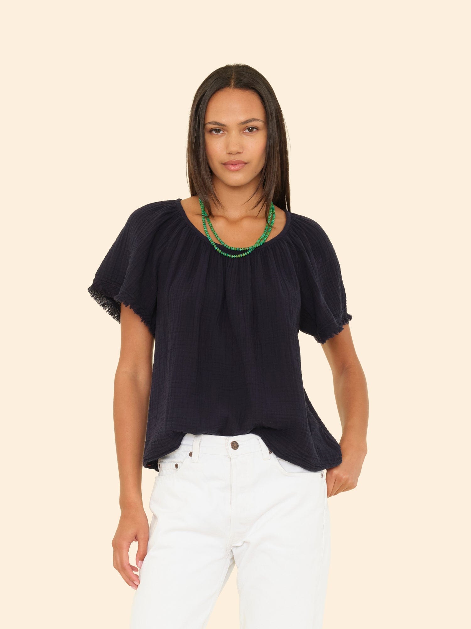 Pretty Please. Macie is new this season in our washed double faced cotton gauze for a soft, gently crinkled feel. This shirred pullover top features a scoop neck, raw edge sleeves, and a clean finished hem.