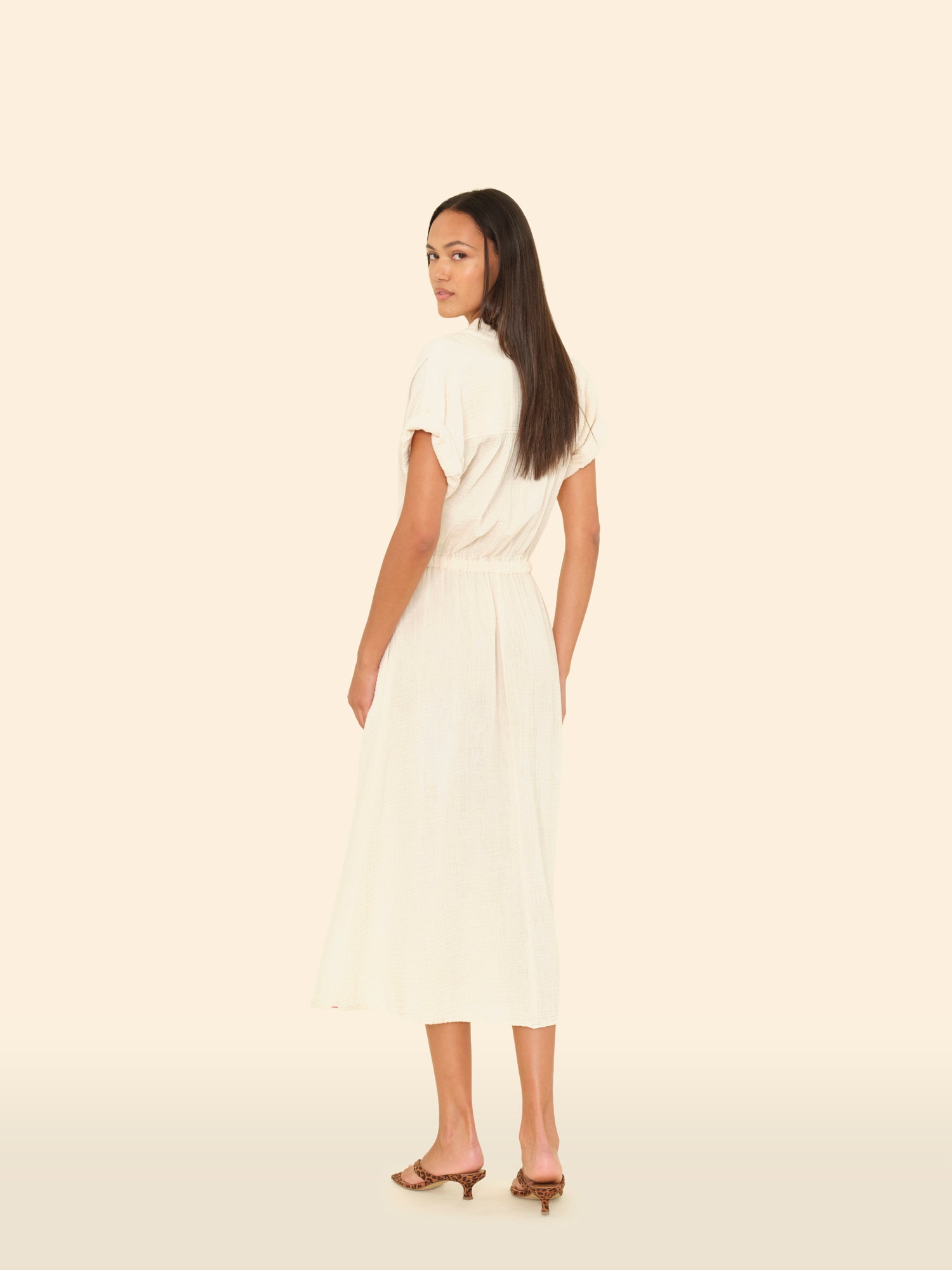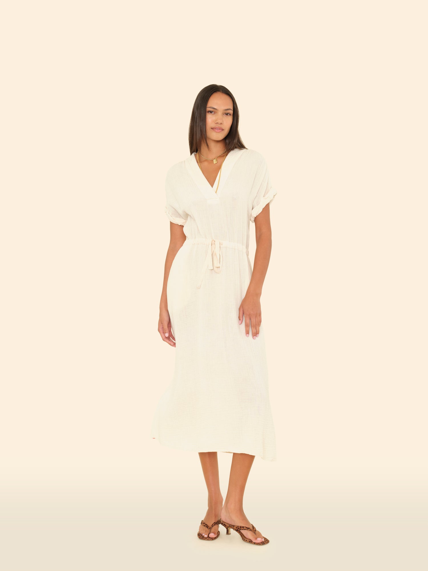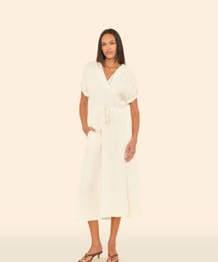 Best Dressed. Adeline is made in our washed double faced cotton gauze for a soft, gently crinkled feel. Inspired by our bestselling Avery Top, this short sleeve midi dress features a deep V-neck, rolled sleeves, elasticized drawstring waist, and side seam pockets.