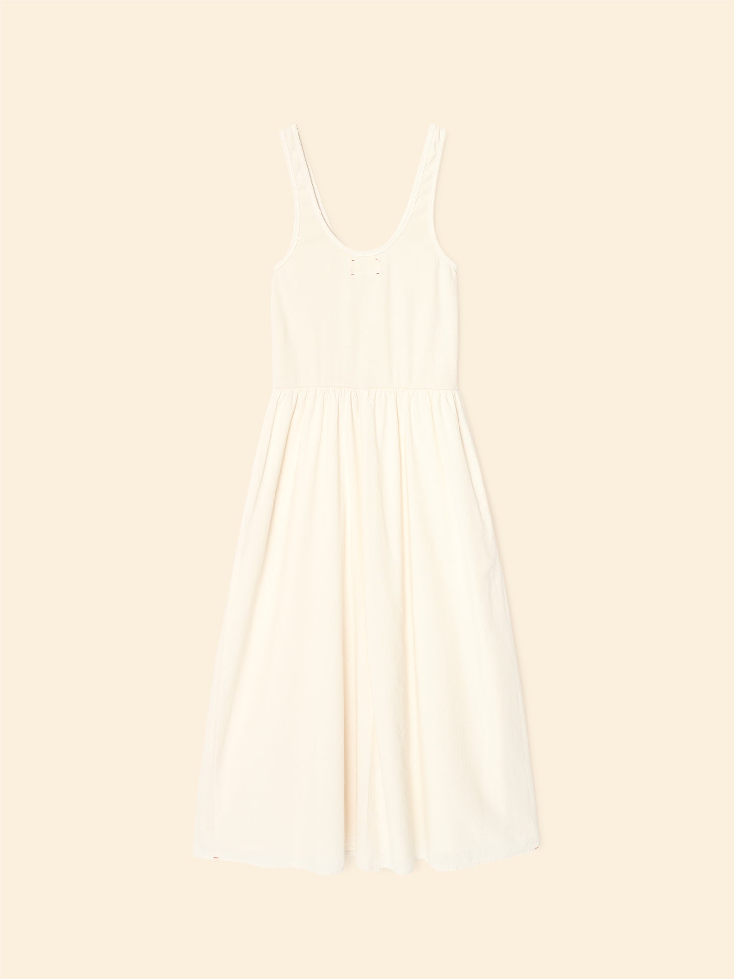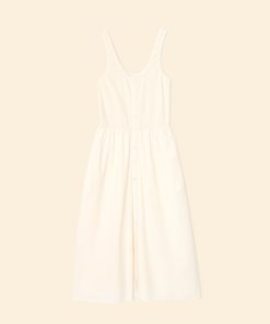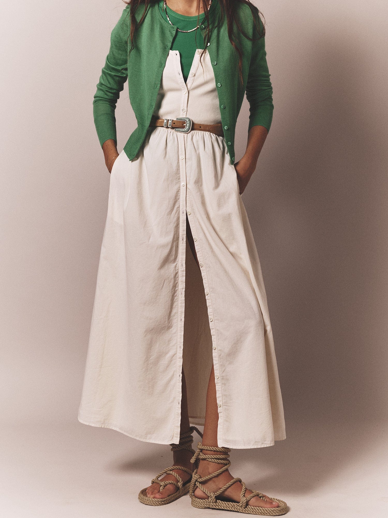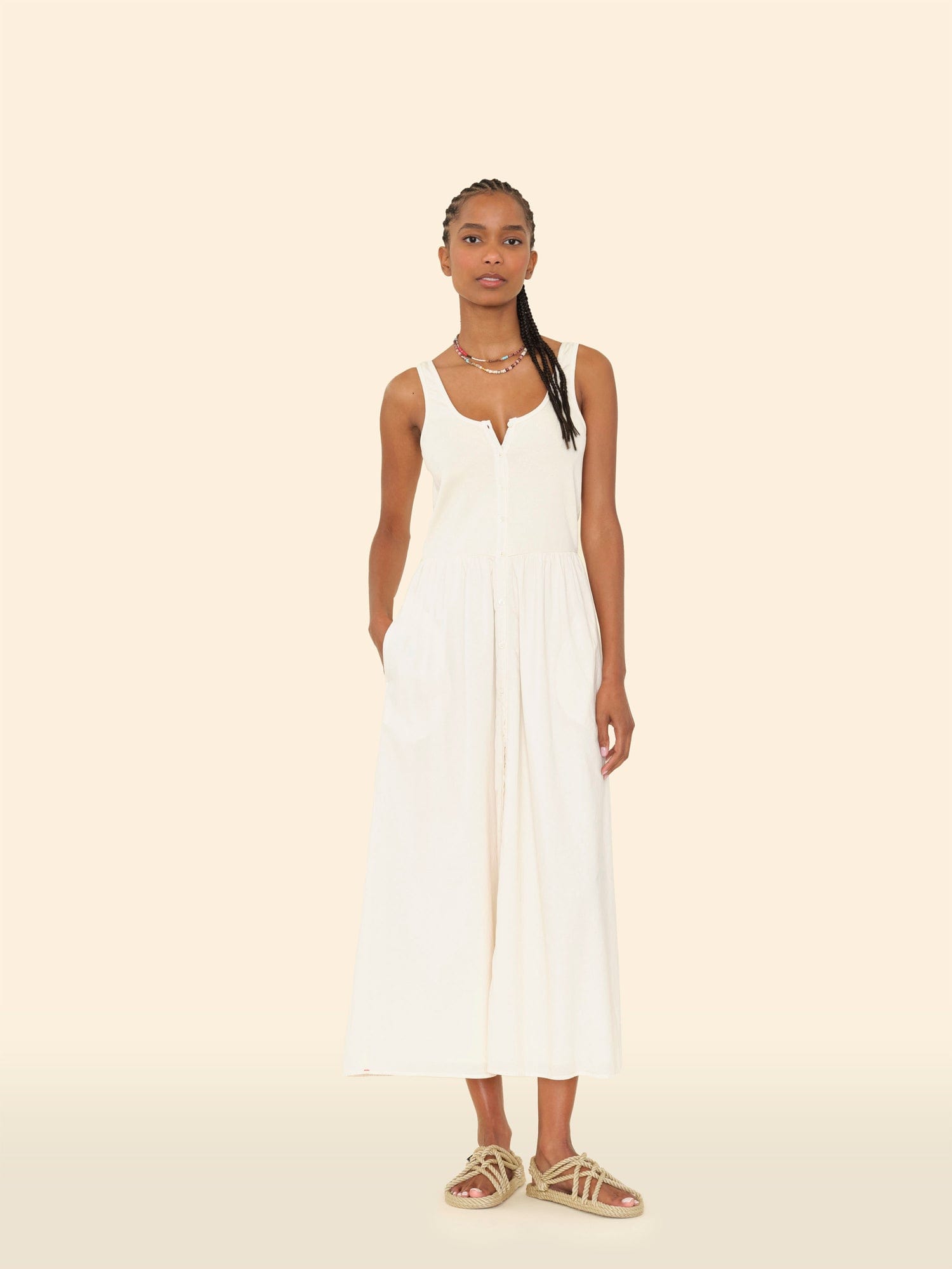 Best of Both Worlds. Fenix is new this season in our classic lightweight woven cotton poplin for a lived-in look and feel. This sleeveless maxi dress is fully lined and features a button-front, contrast cotton rib knit top, full skirt, and side seam pockets.