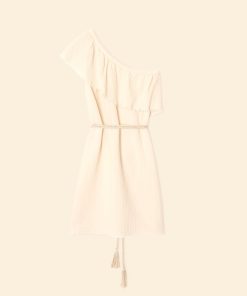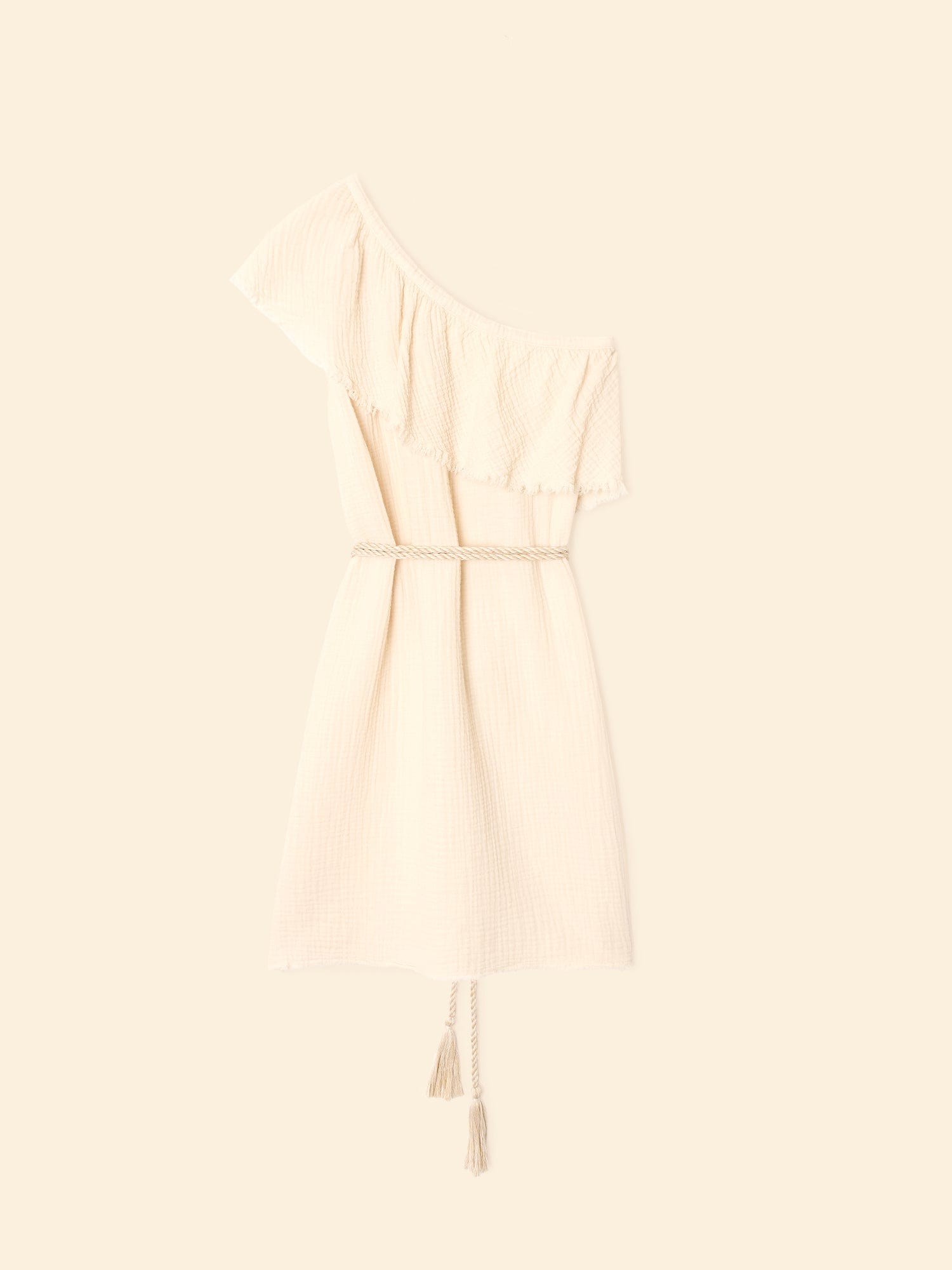 French allure meets California ease. India is made in our washed double faced cotton gauze for a soft, gently crinkled feel. This mini femme dress features a one-shoulder ruffle neck, raw edge details, and a natural colored twisted rope belt with tassels.