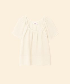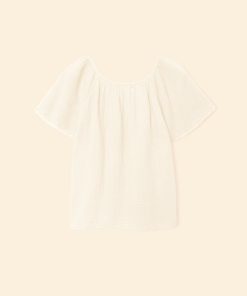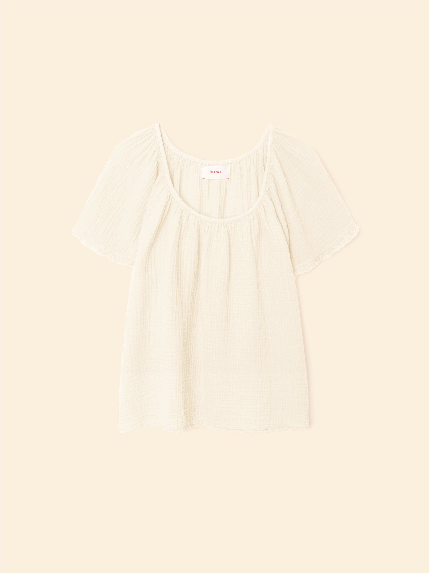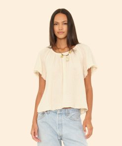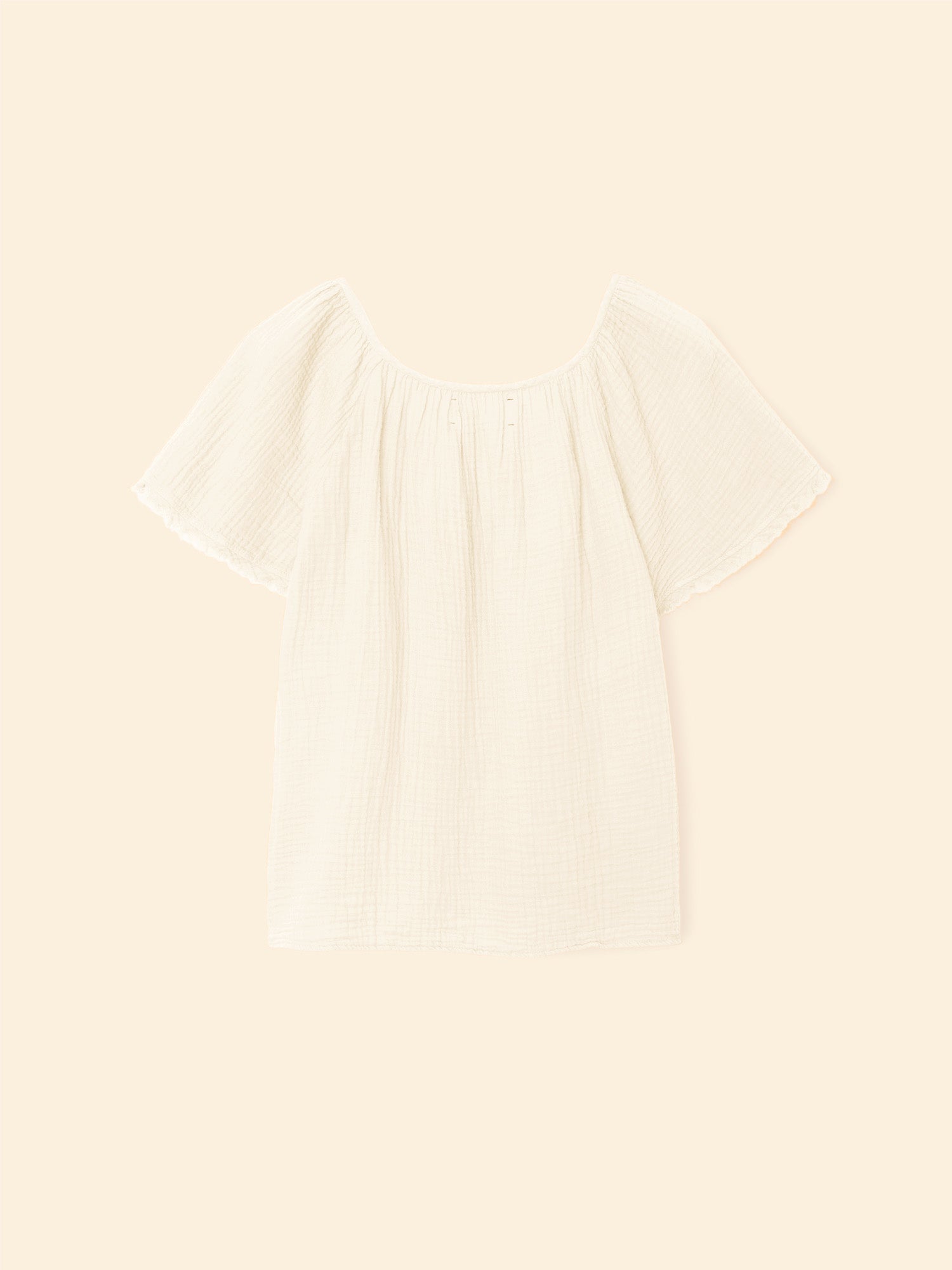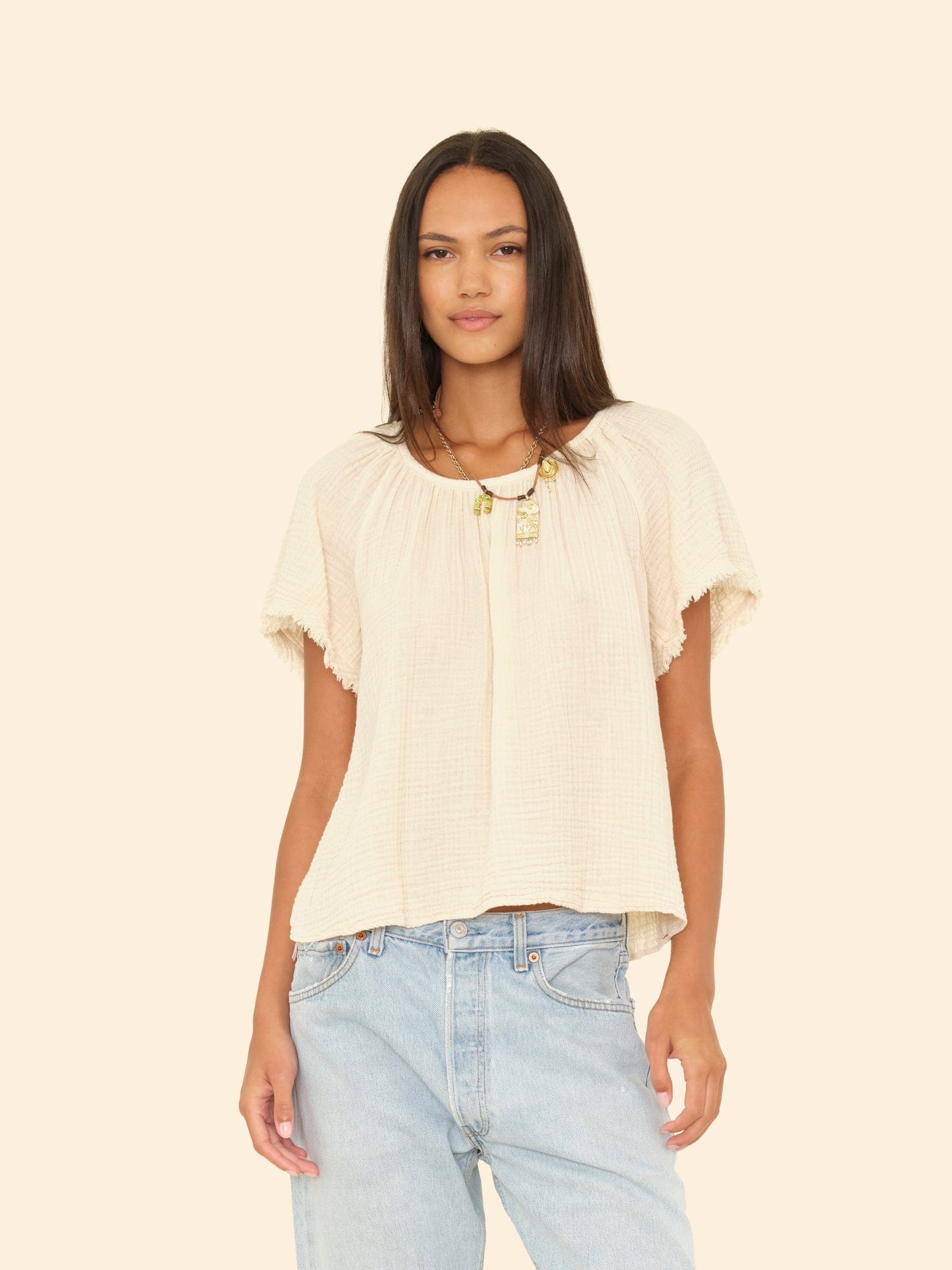 Pretty Please. Macie is new this season in our washed double faced cotton gauze for a soft, gently crinkled feel. This shirred pullover top features a scoop neck, raw edge sleeves, and a clean finished hem.