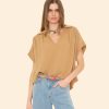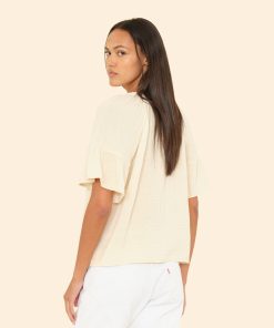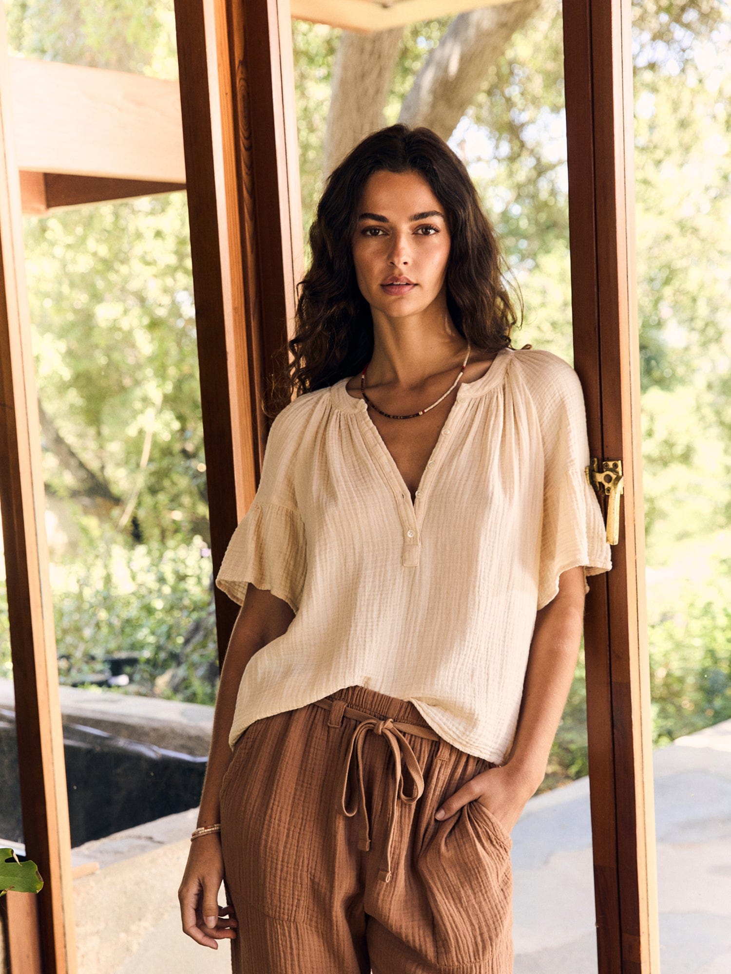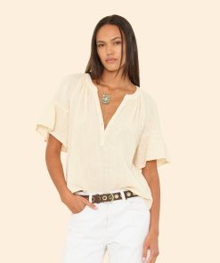 Pretty Please. Nia is new this season in our washed double faced cotton gauze for a soft, gently crinkled feel. This femme popover top has a shirred split neck and flutter sleeves.