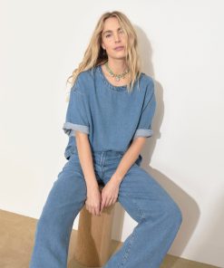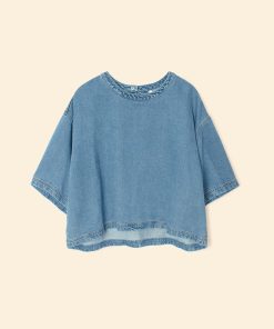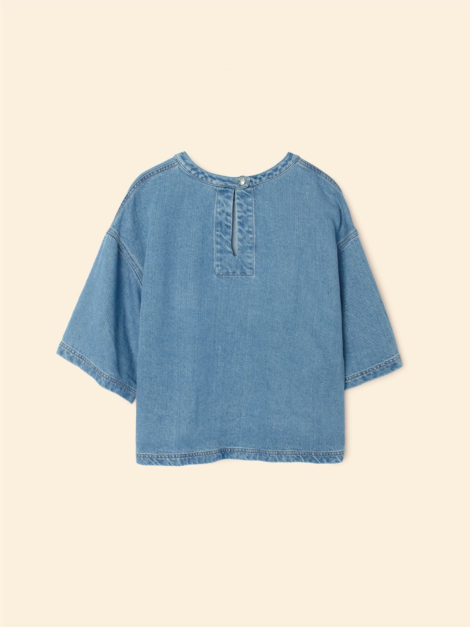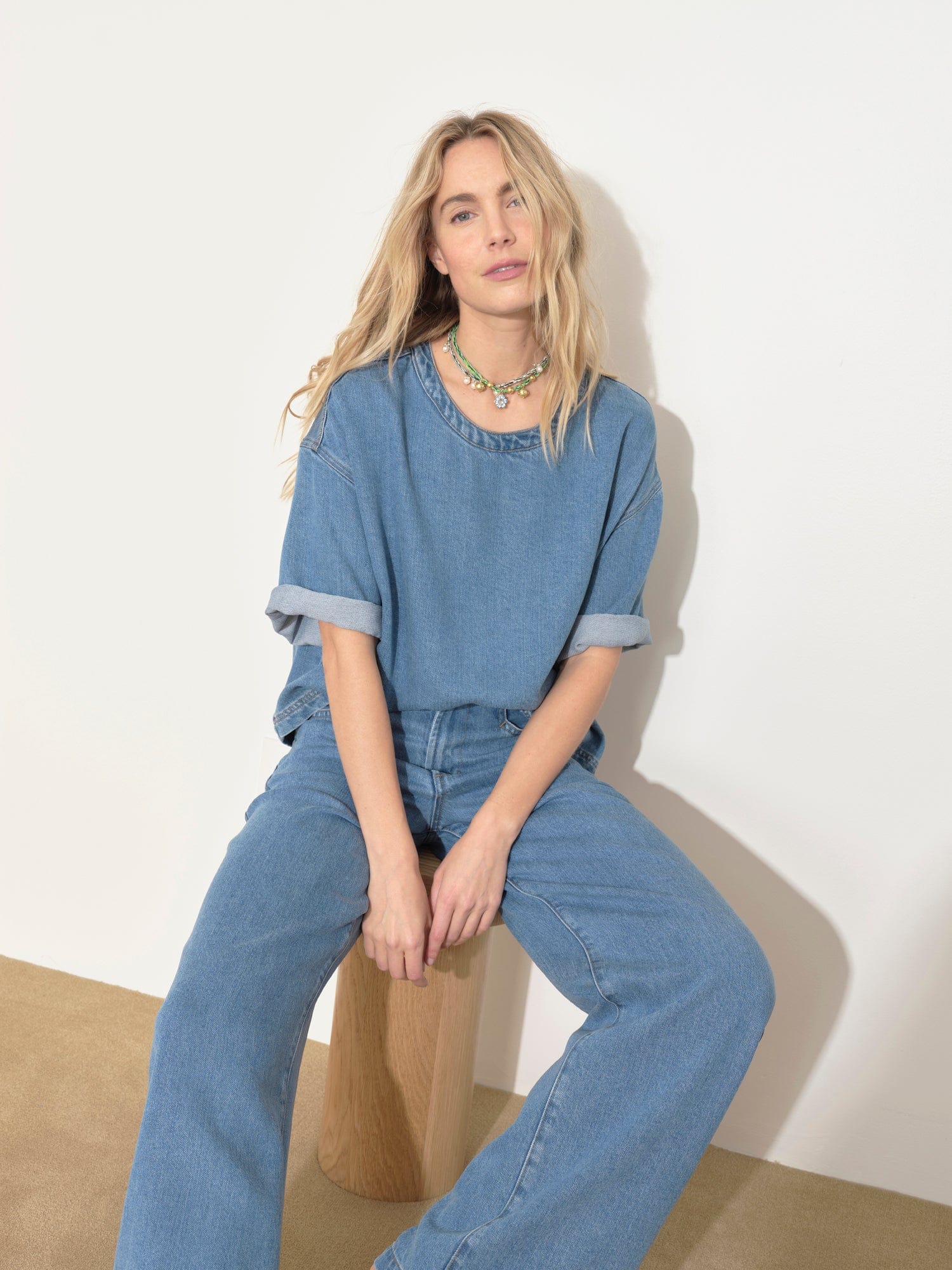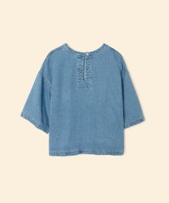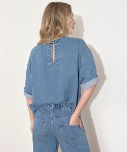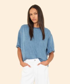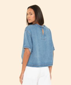 Forever Denim. Austin is new this season in our drapey, ultra-soft lyocell denim. Austin is a wide-sleeve top with a boxy fit, keyhole back with snap button detail, and a high low hem.