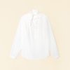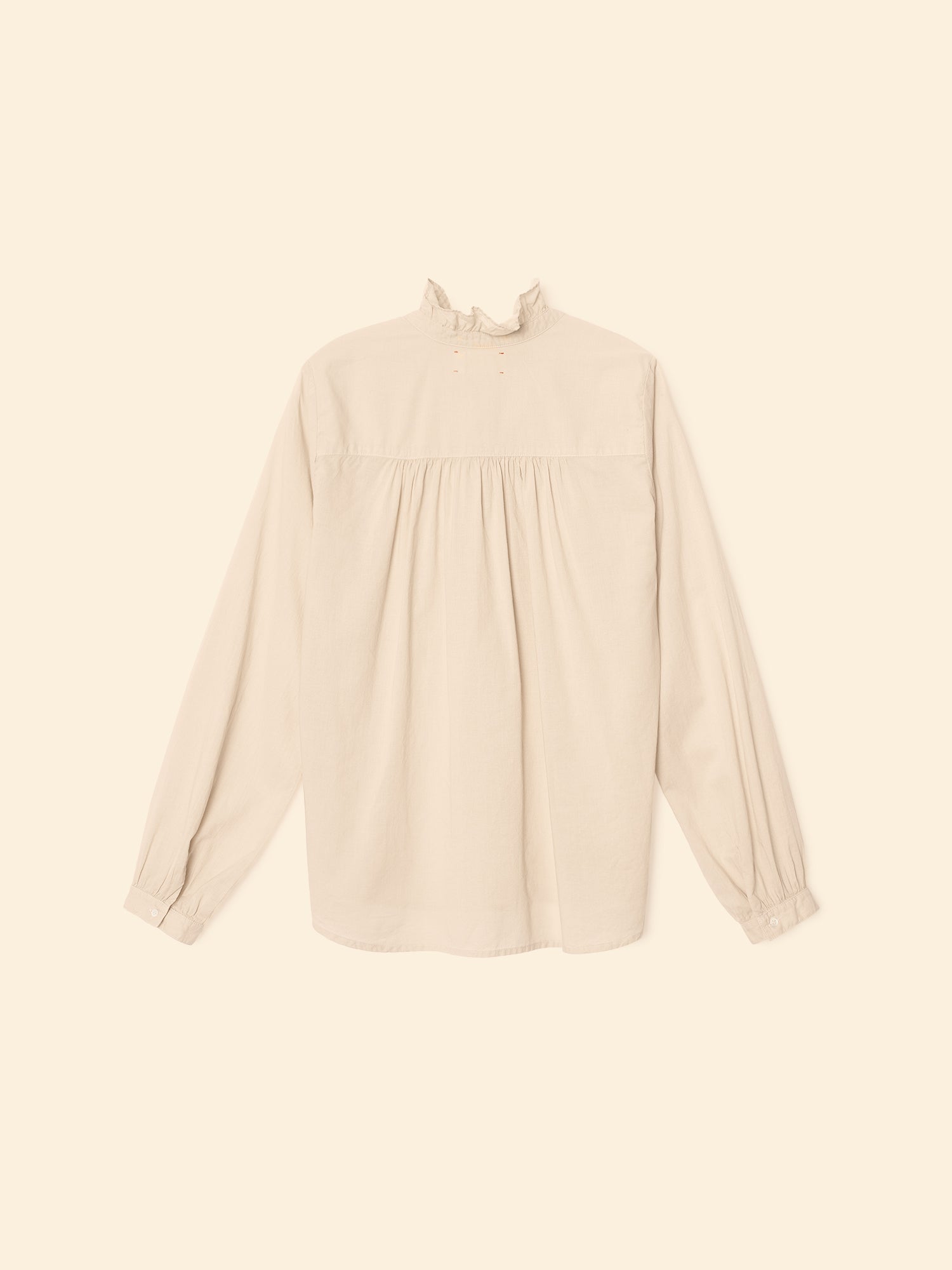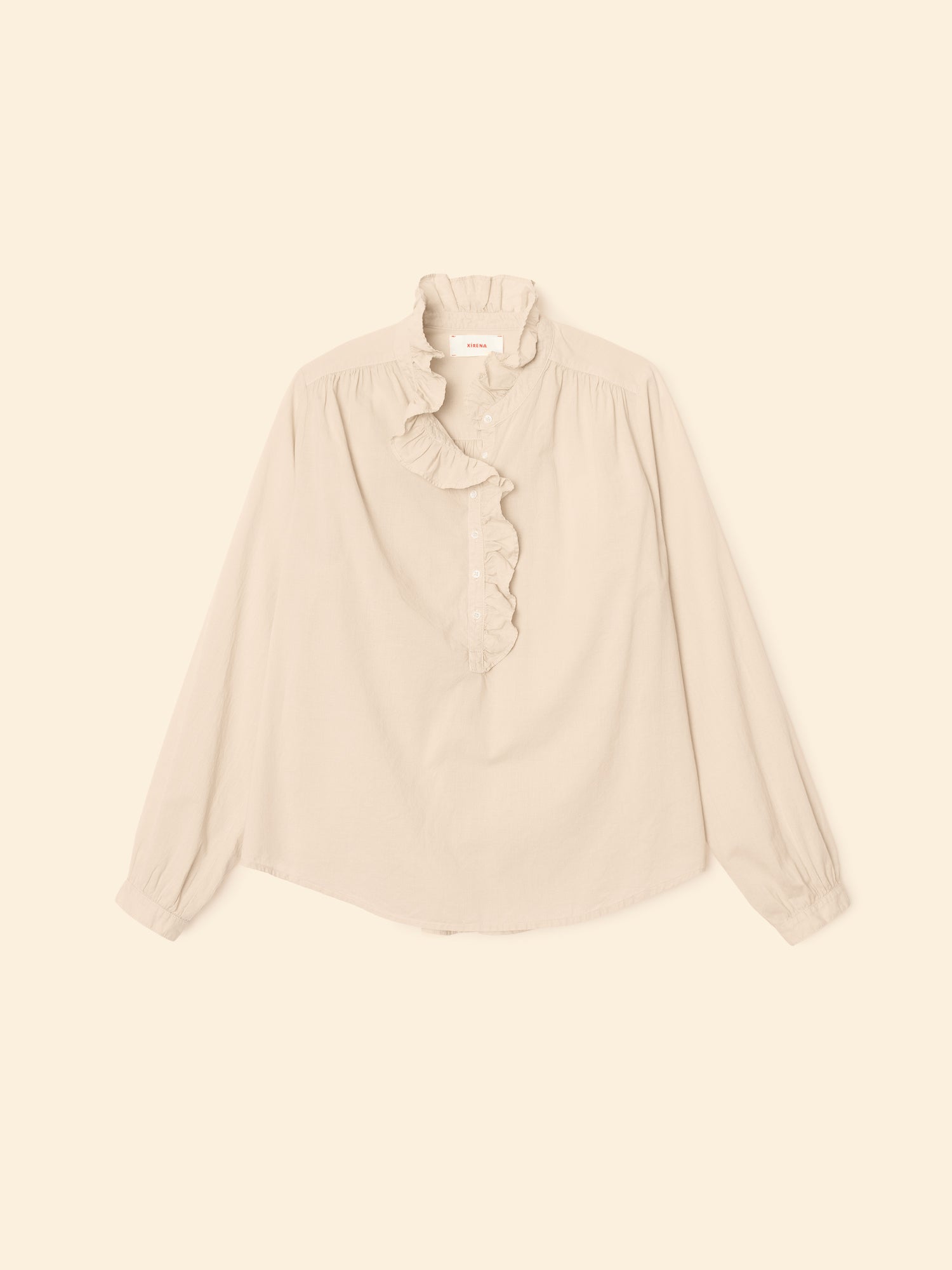 For the Frill of it. Caspian is made in our classic lightweight woven cotton poplin for a lived-in look and feel. Caspian is a ruffle henley with ruffle details all throughout the neck and front placket. This elevated henley also has shirring at the sleeves, front, and back and a high low hem.
