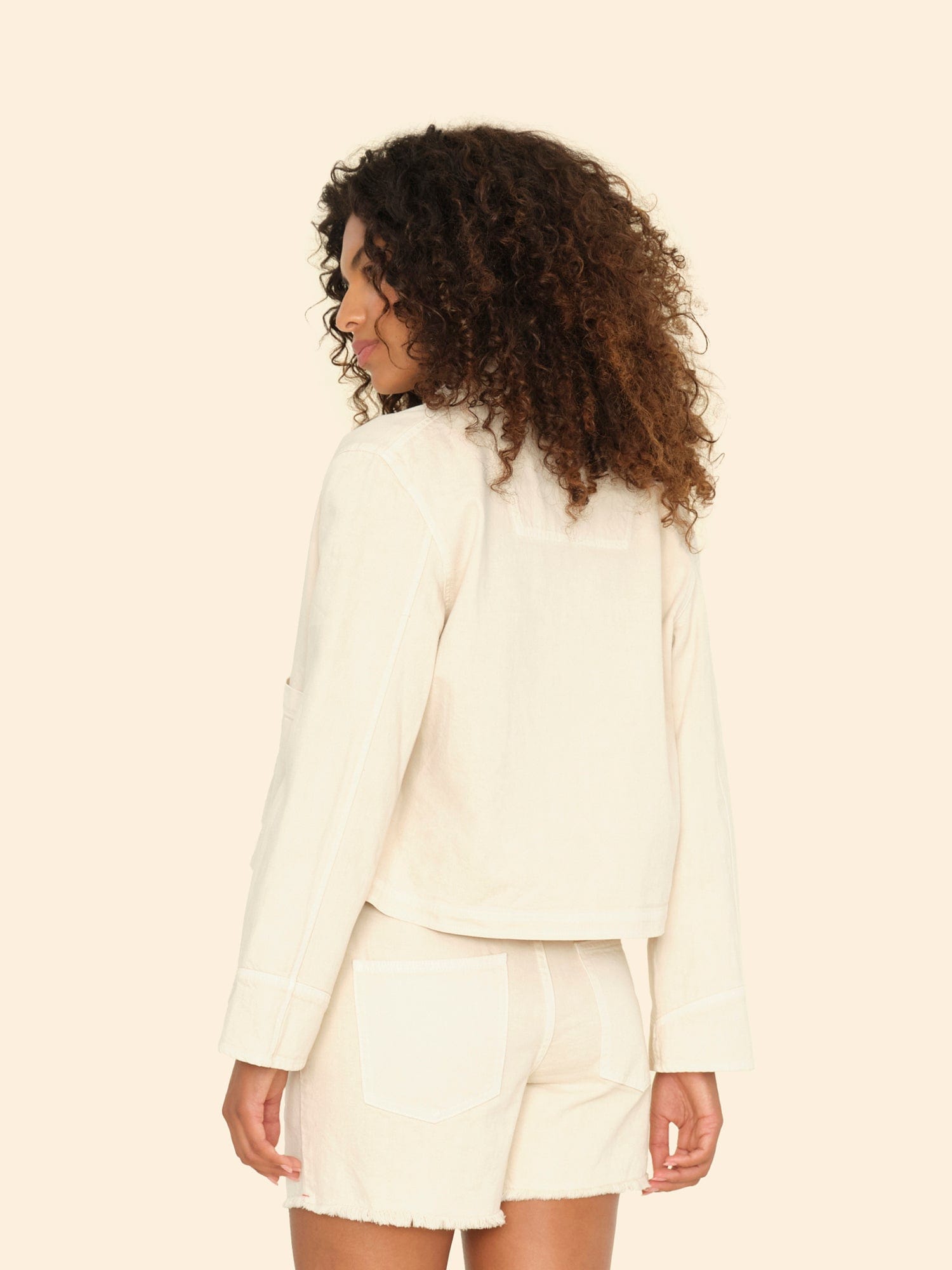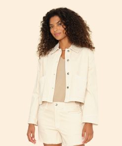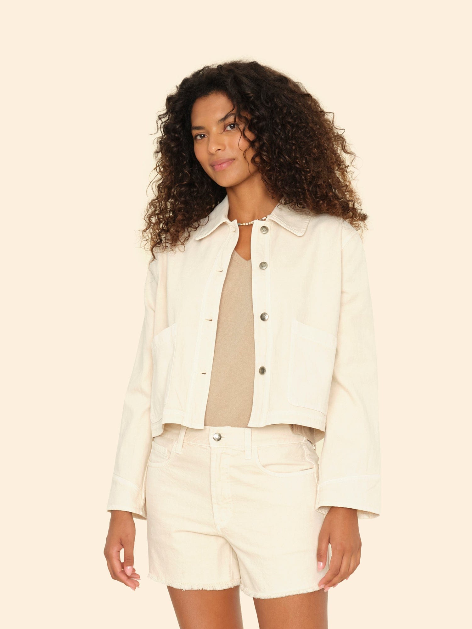 Forever Denim. Jasper is new this season in our mid-weight recycled blend denim. Jasper is a slightly cropped jacket with tack metal buttons and open front pockets.