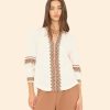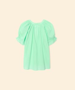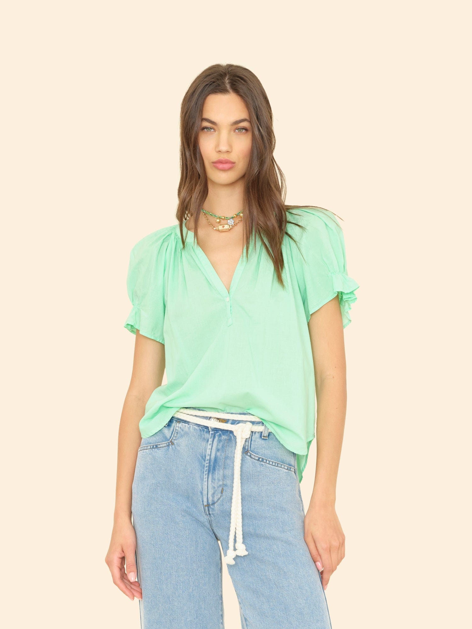 Pretty Please. Astryde is made in our classic lightweight woven cotton poplin for a lived-in look and feel. Astryde is a femme V-neck blouse that features a singular button-closure, short puff raglan sleeves with elastic ruffles, and shirred details throughout.