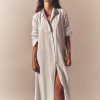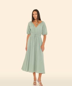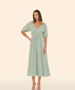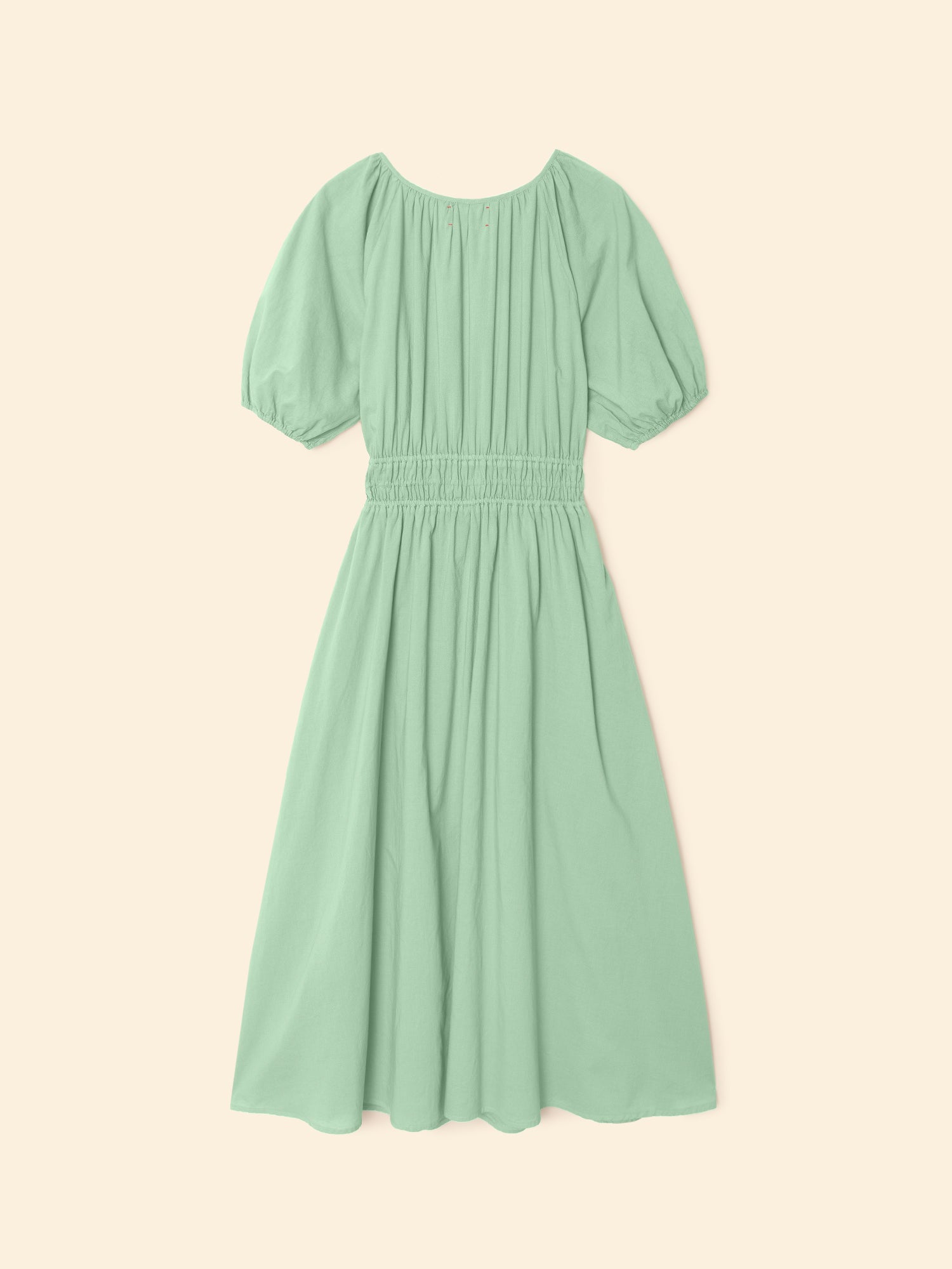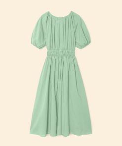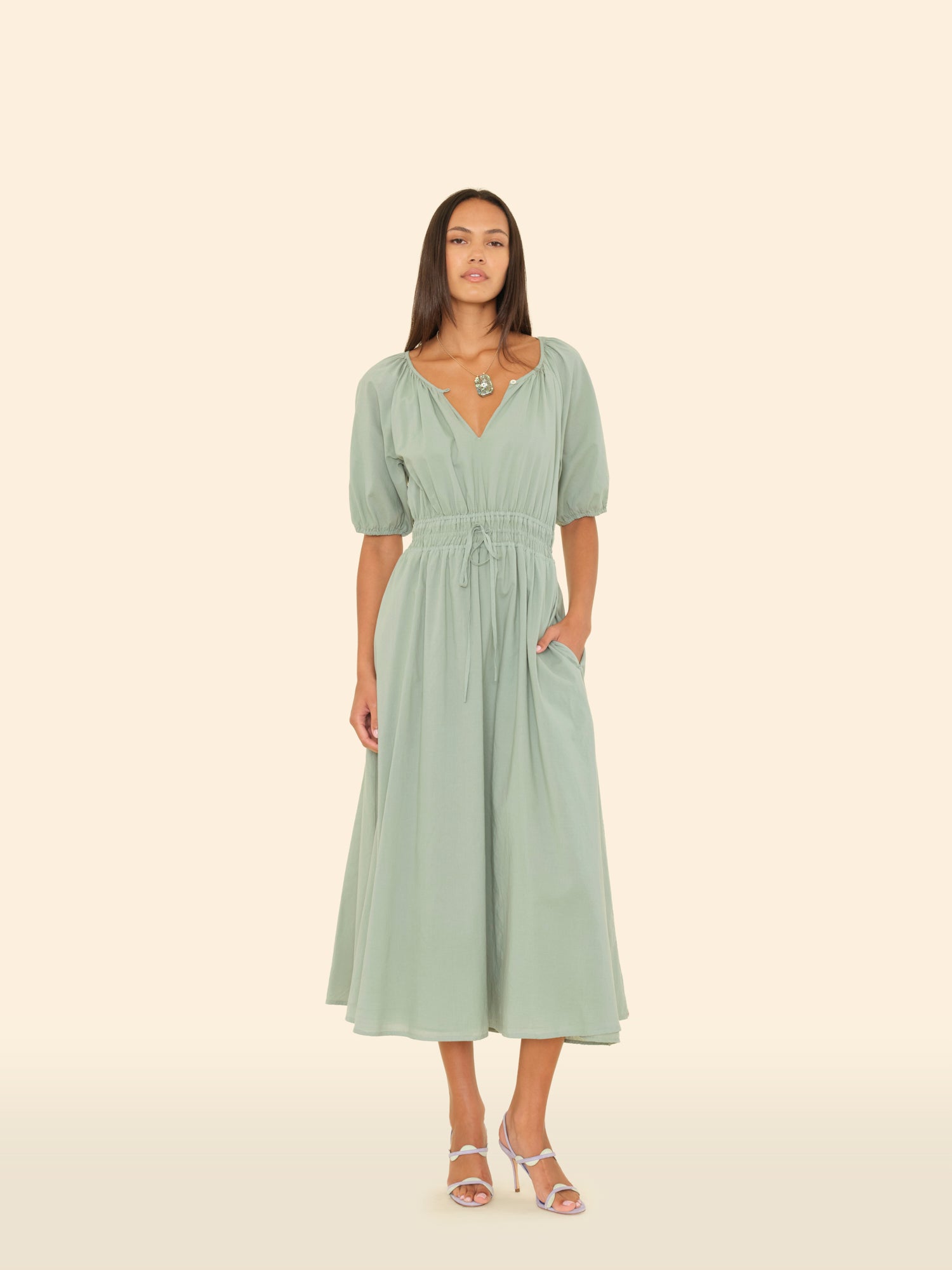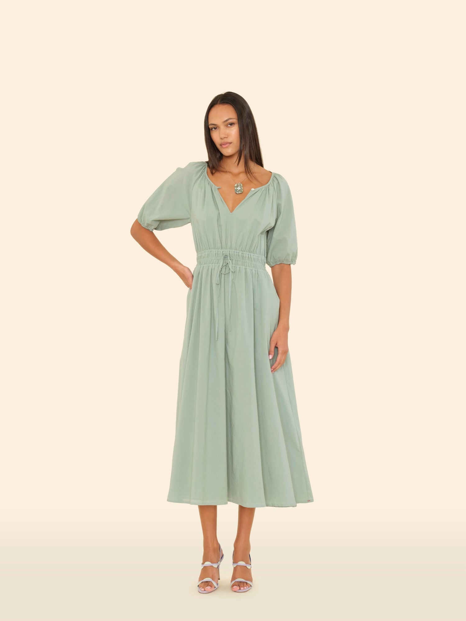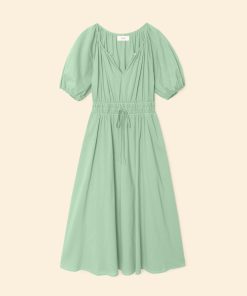 Pretty Please. Emeline is new this season in our classic lightweight woven cotton poplin for a lived-in look and feel. This femme midi dress is lined and features a rouleau button closure, puff sleeves, ruched elasticized drawstring waist, and side seam pockets.