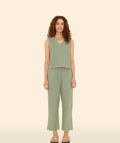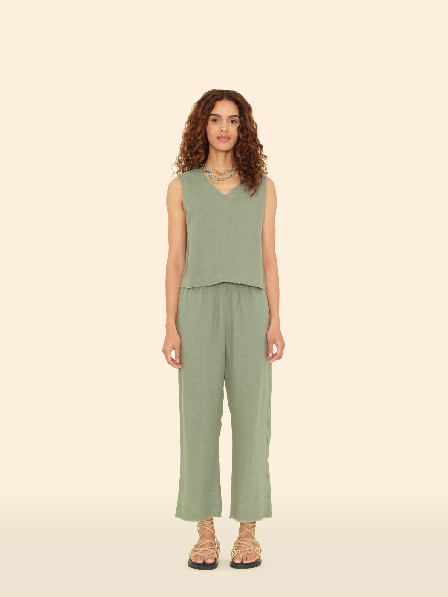 Vacation Mode. Lorenzo is new this season in our lightweight linen. Lorenzo is a cropped pull-on pant with an elasticized waist, side seam pockets, and a raw edge hem.