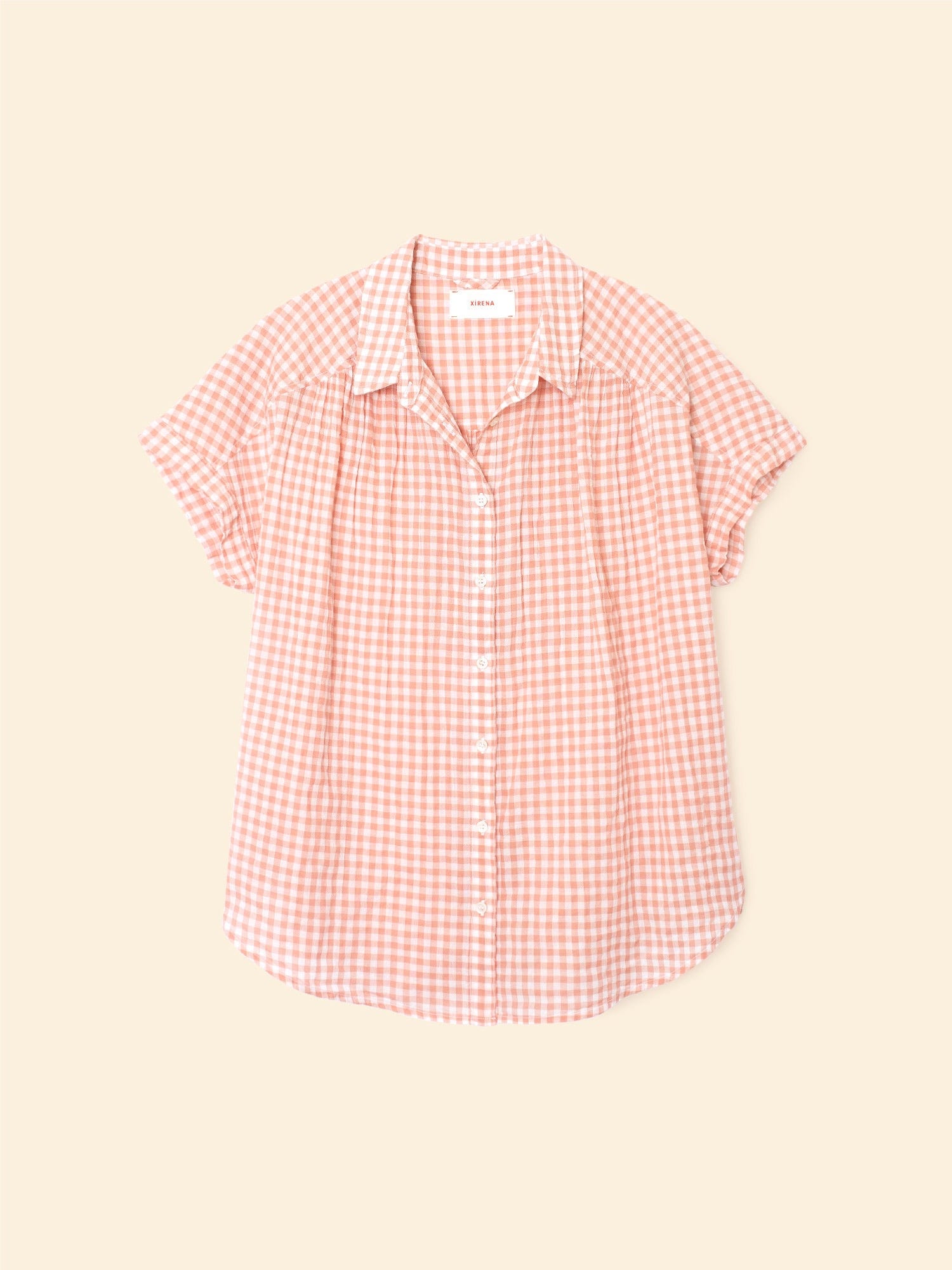 Checkmate. Paxton is updated this season in our cotton gingham check with added stretch for ease of comfort. This short sleeve shirt features a button-front, cap sleeves, shirred shoulder and back yokes, and a high low shirttail hem.