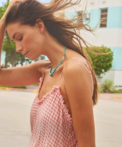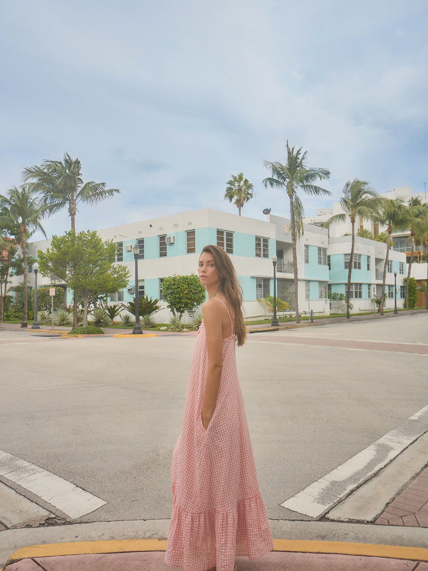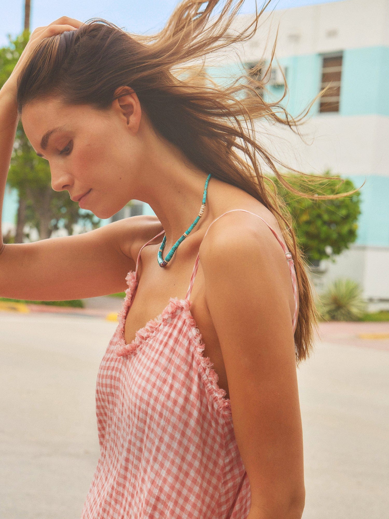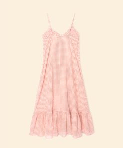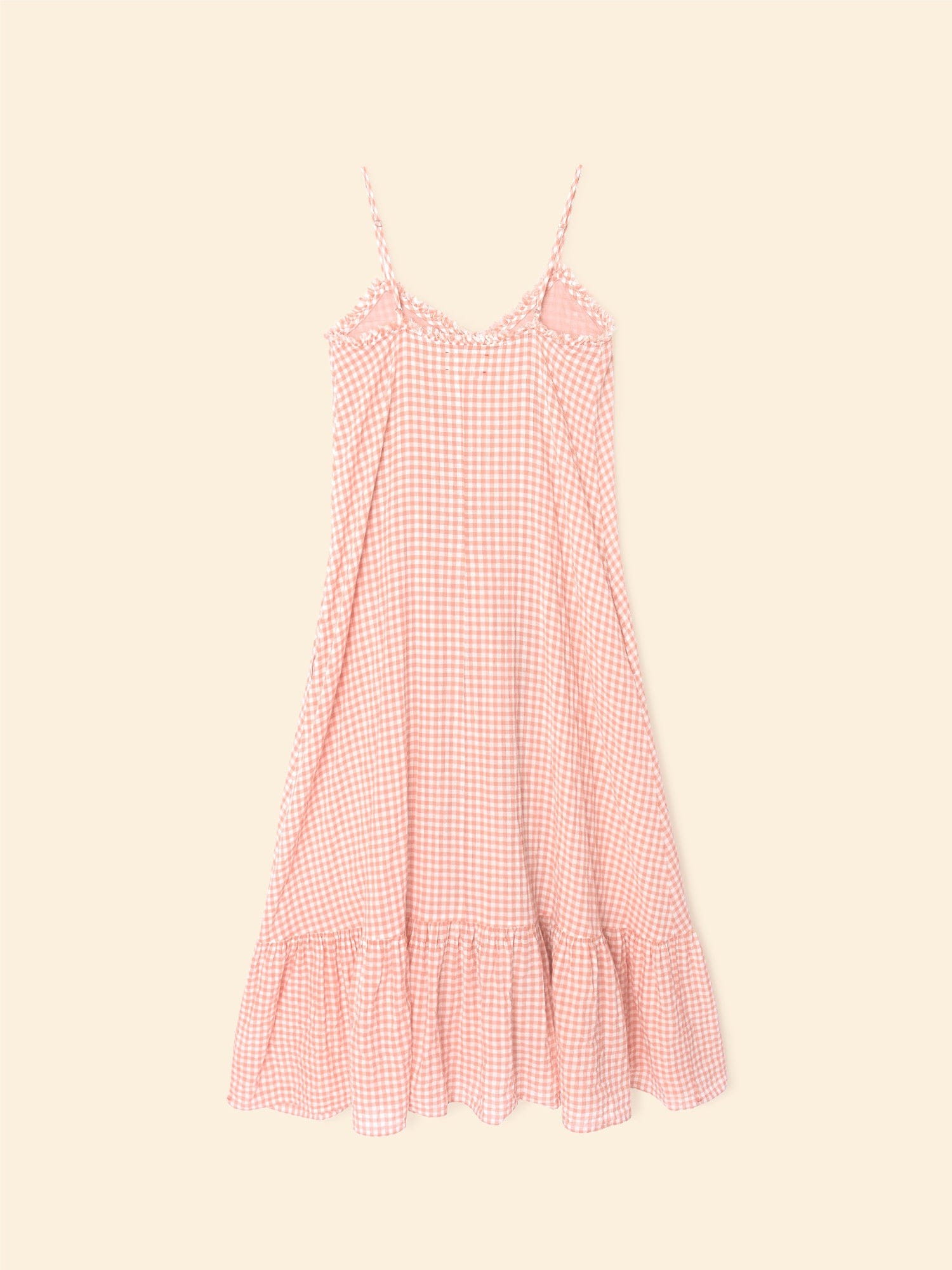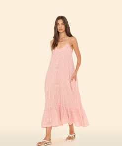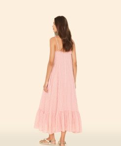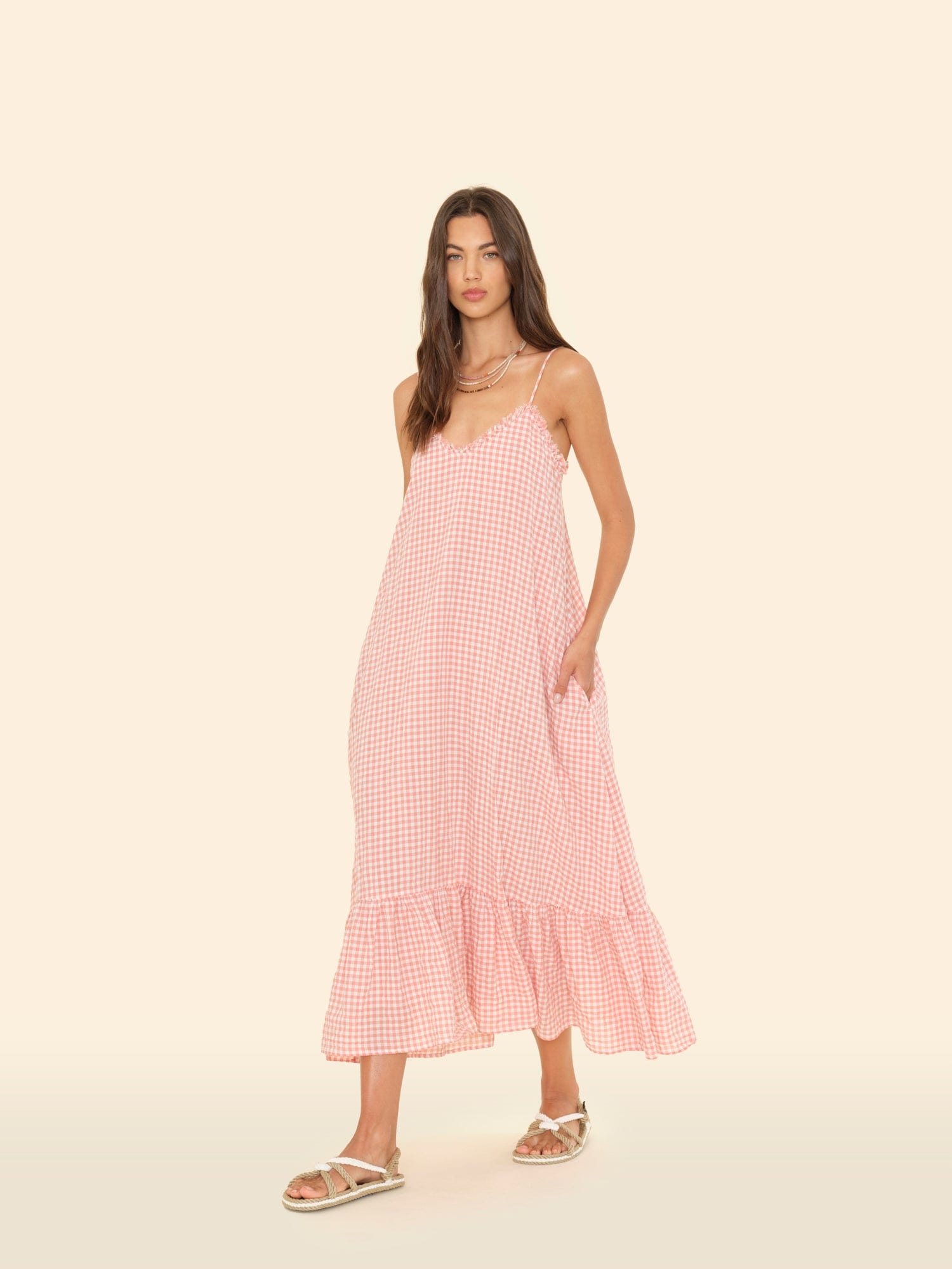Checkmate. Taytum is new this season in our cotton gingham check with added stretch for ease of comfort. This fully lined midi dress features a tiered skirt, spaghetti straps, side seam pockets, and a raw edge ruffle hem.