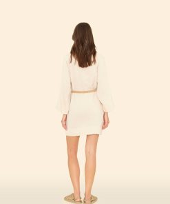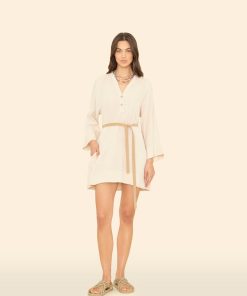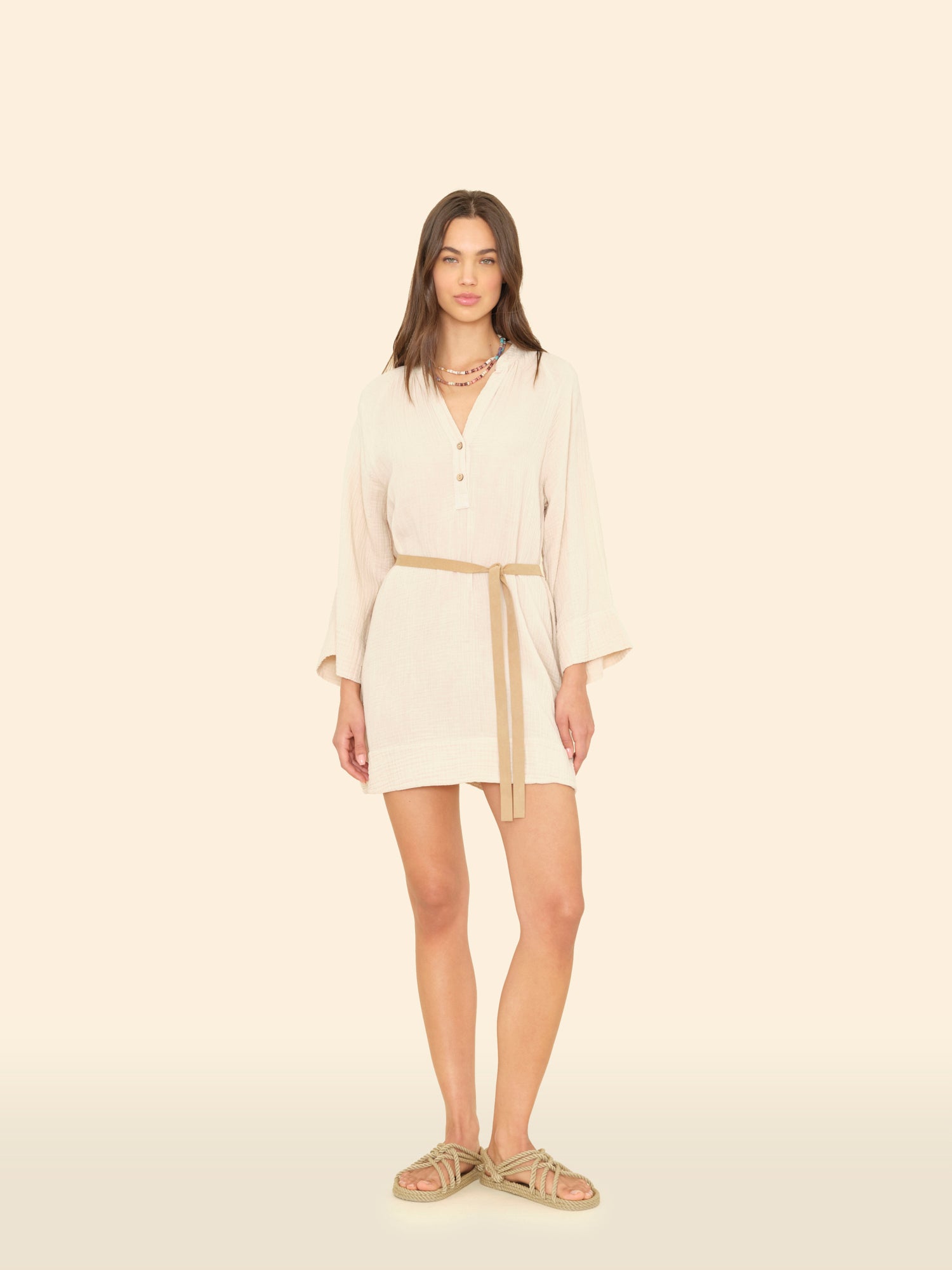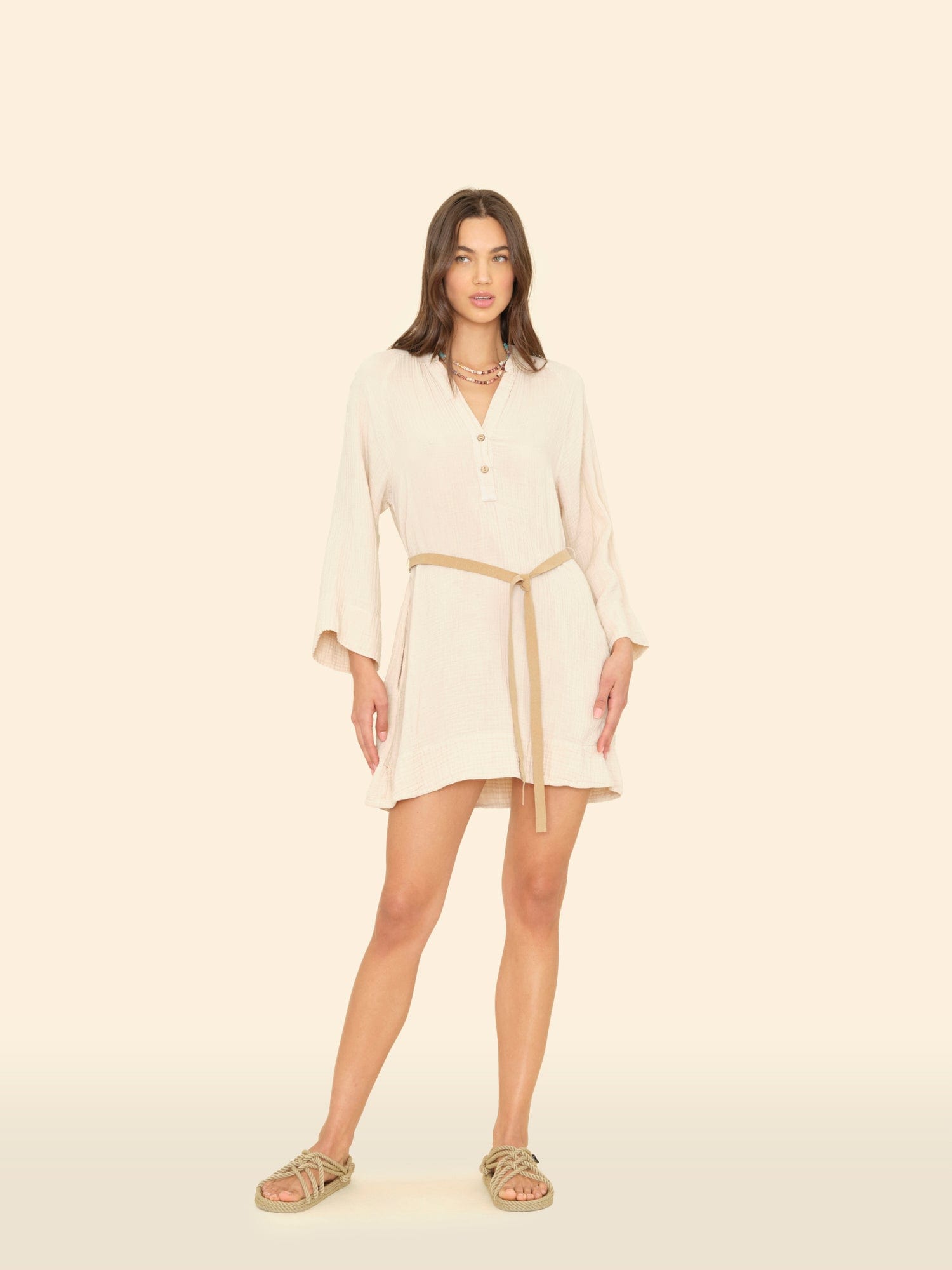 Short and Sweet. Carlotta is new this season in our washed double faced cotton gauze for a soft, gently crinkled feel. Carlotta is a flowy mini dress with a V-neck, partial button-front with coconut buttons, bell sleeves, and a faux suede waist-tie.