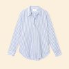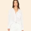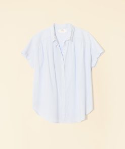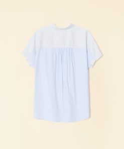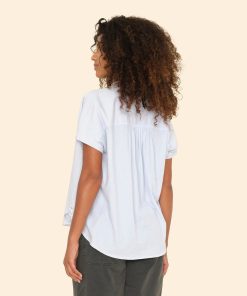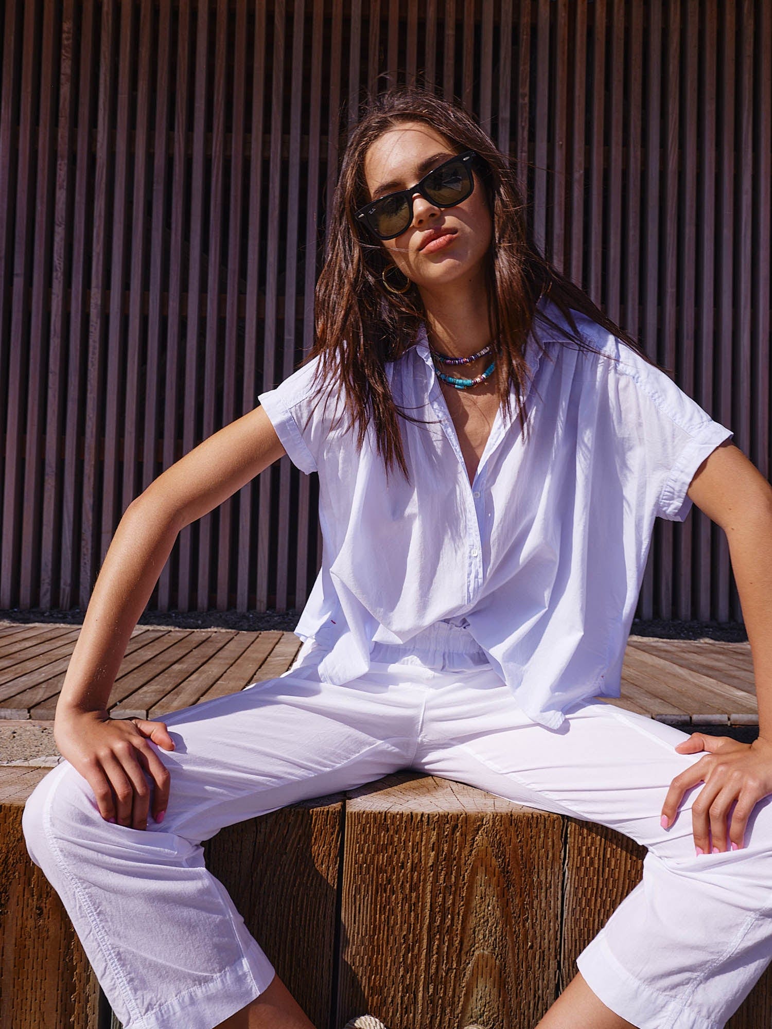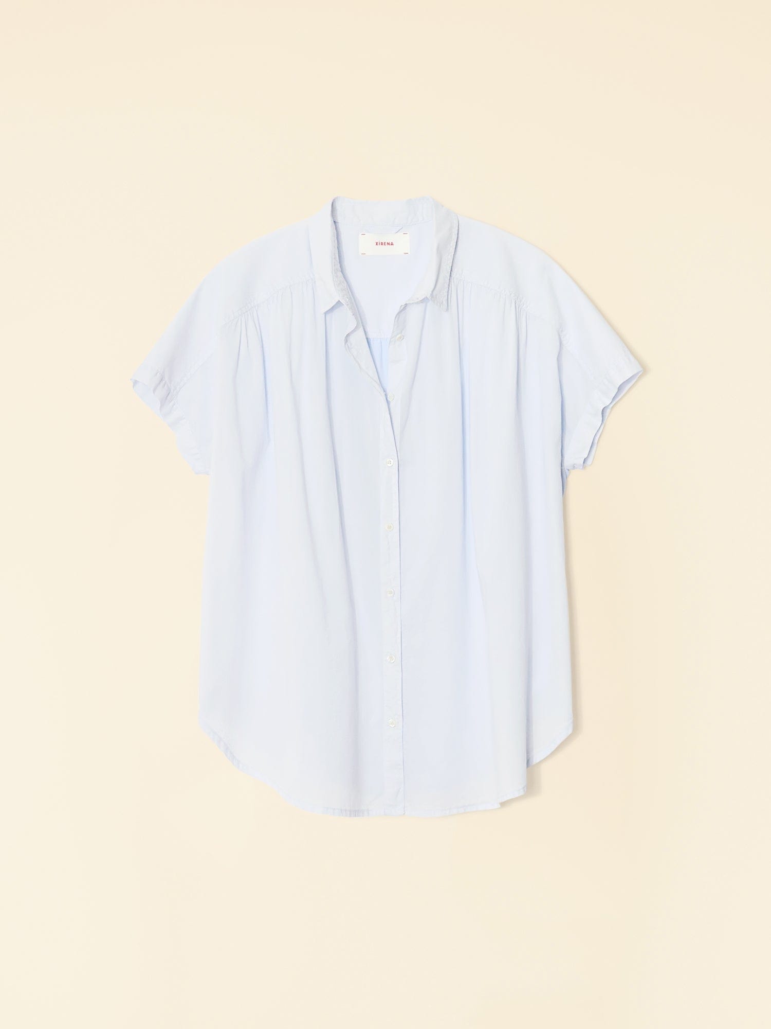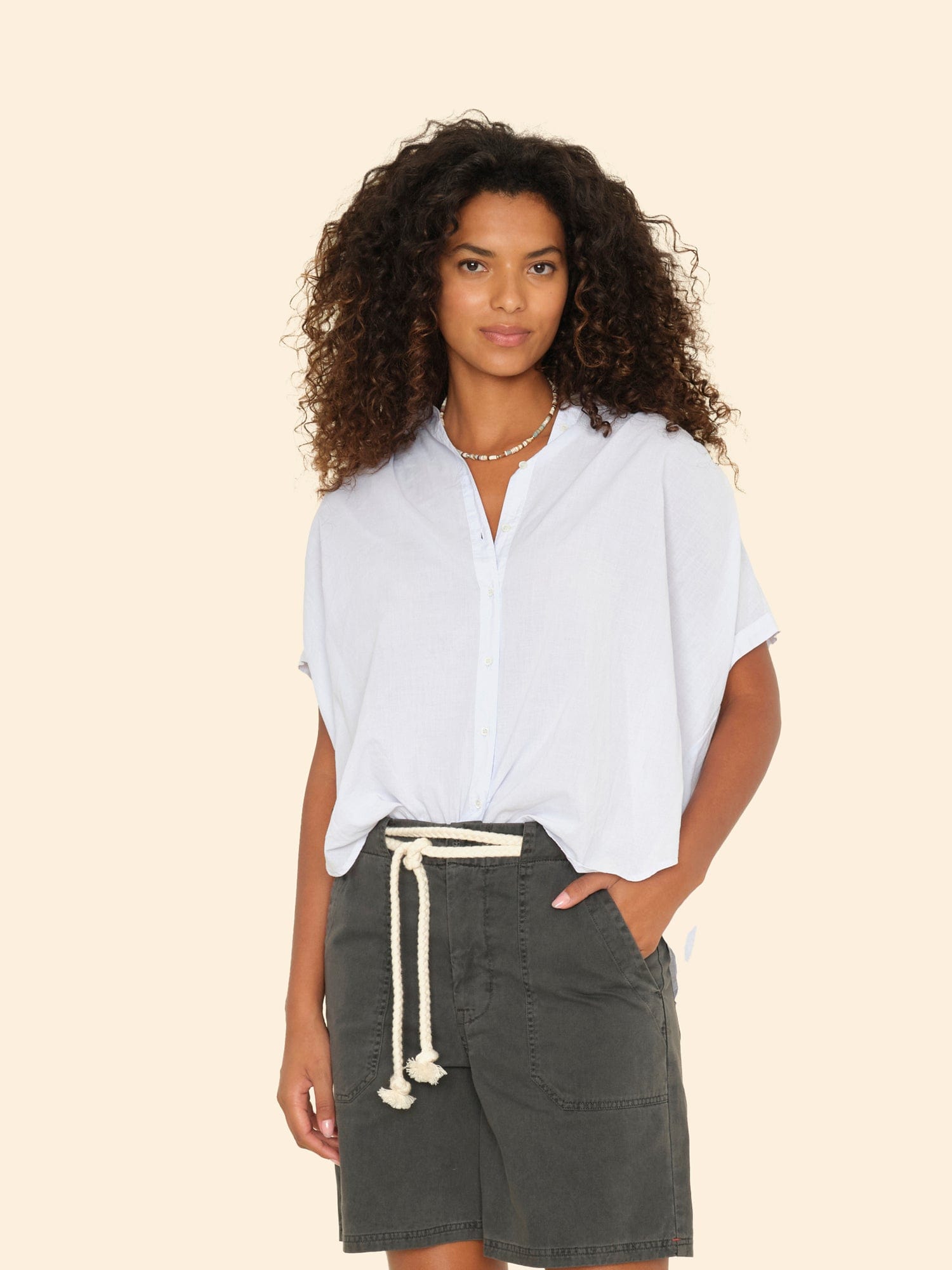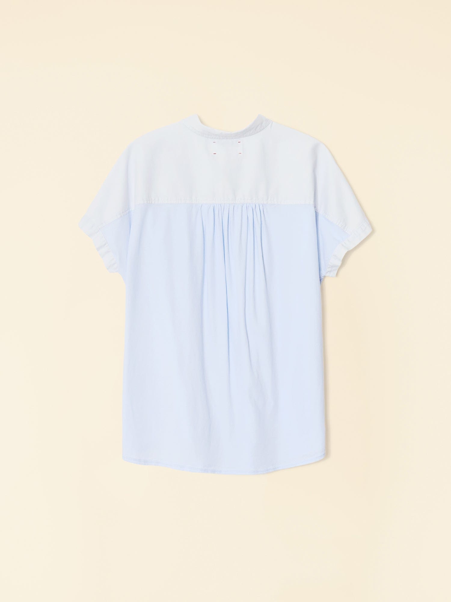 In the Mix. Pax is new this season in our classic lightweight woven cotton poplin with a contrast baby jersey back for an elevated feel. This short sleeve mixed media shirt features a button-front, cap sleeves, shirred shoulder and back yokes, and a high low shirttail hem.