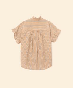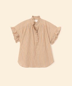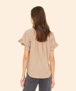 Earn your stripes. Brie is new this season in our crisp cotton pencil stripe. Brie is a henley popover top with ruffle details all throughout the neck, front placket, and sleeves.