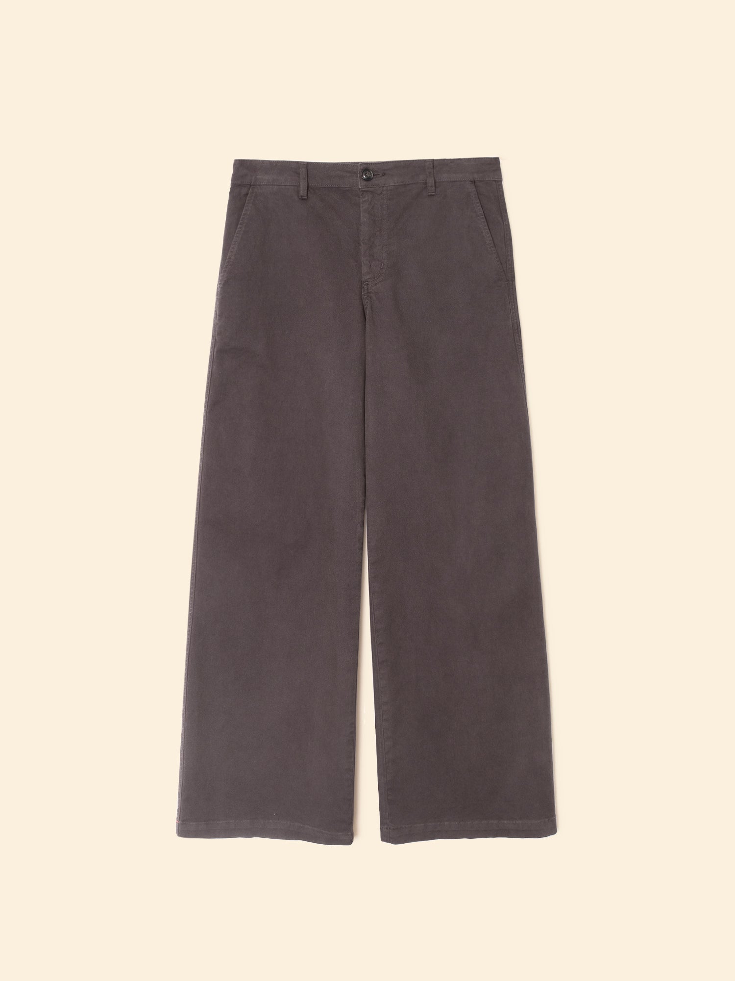 Far and Wide. Legend is new this season in our vintage washed stretch cotton twill. This pull on pant features a wide leg, button closure with zipper fly, slant pockets, and open back pockets.