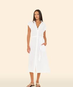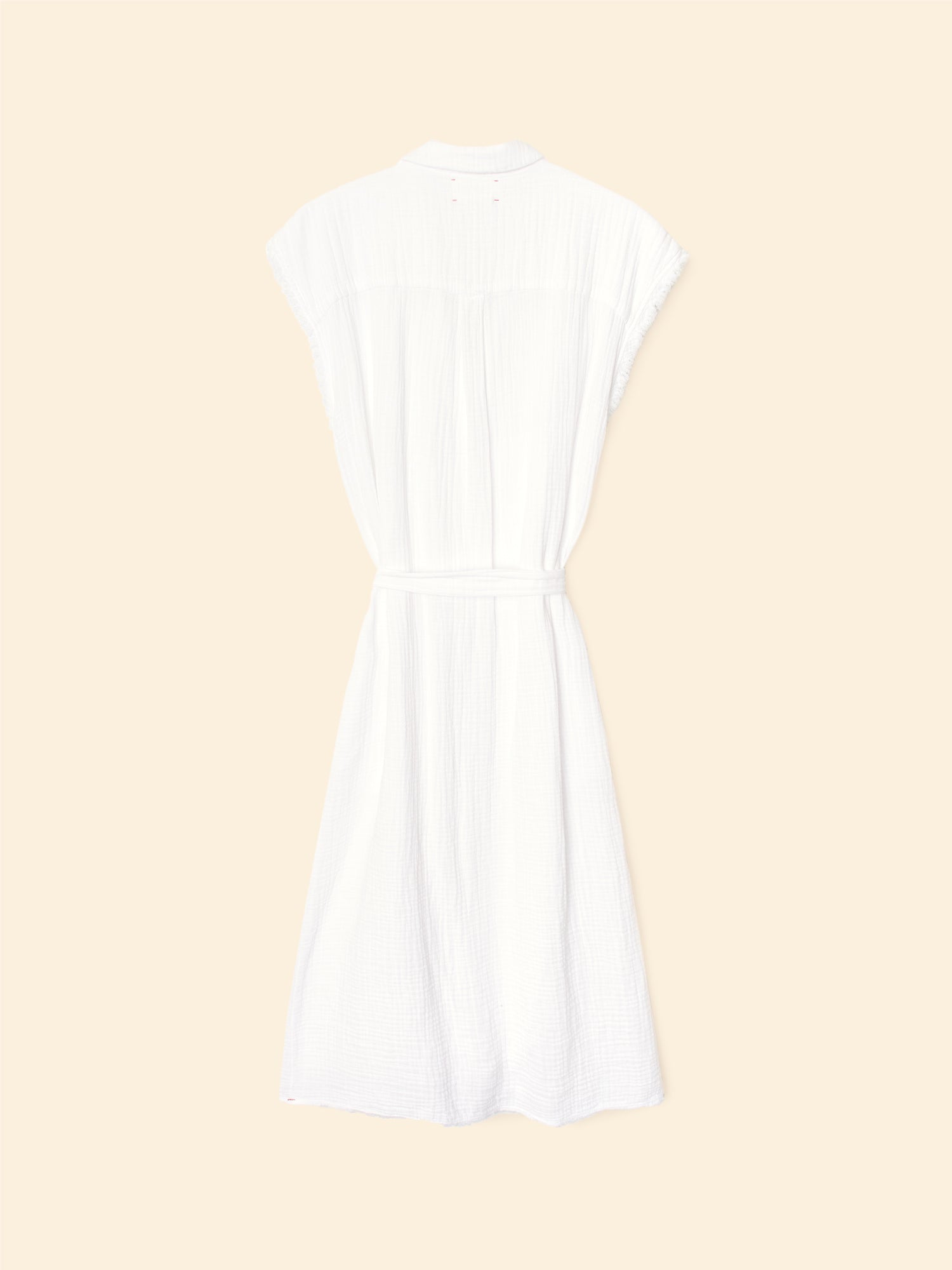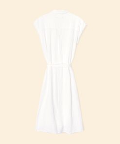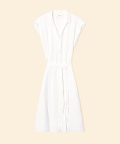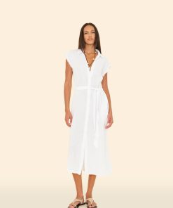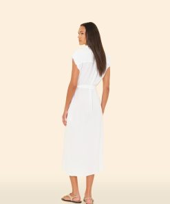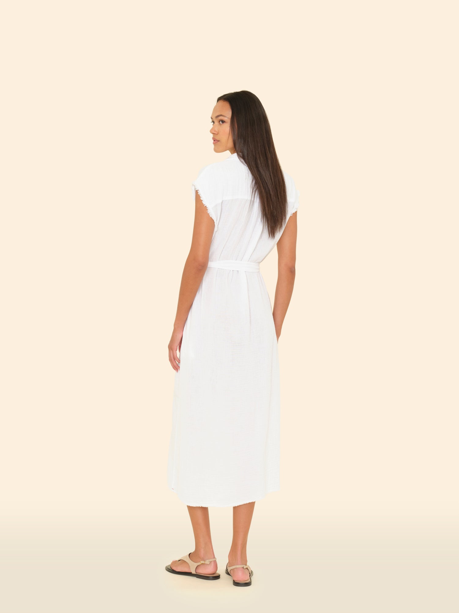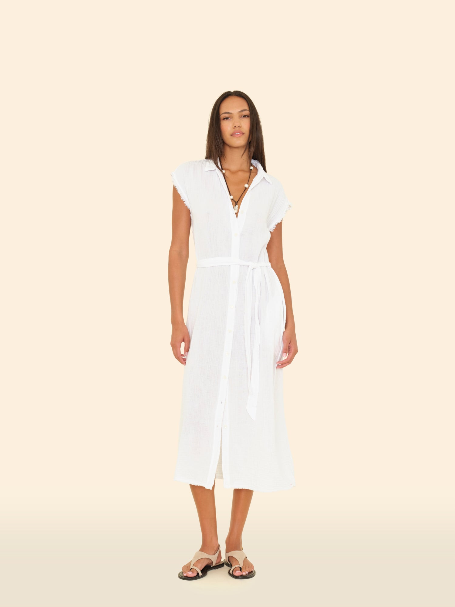 Go with the Flow. Aliza is new this season in our washed double faced cotton gauze for a soft, gently crinkled feel. This button-front midi dress features raw edge cap sleeves and an adjustable tie-belt.