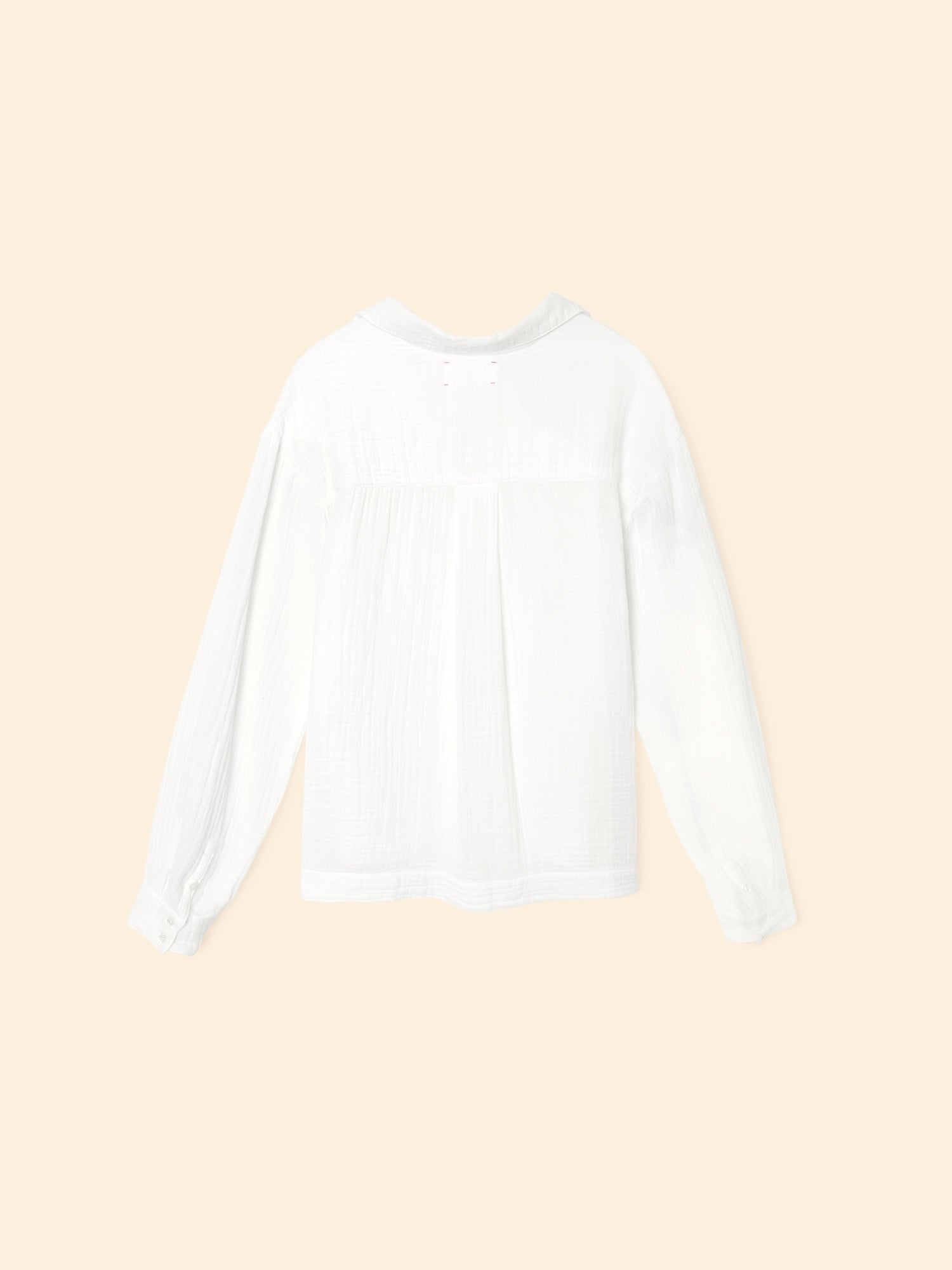 Bare Necessities. Brody is new this season in our washed double faced cotton gauze for a soft, gently crinkled feel. This easy popover top has a Johnny collar, shirred split neck, button cuffs, and a back yoke.
