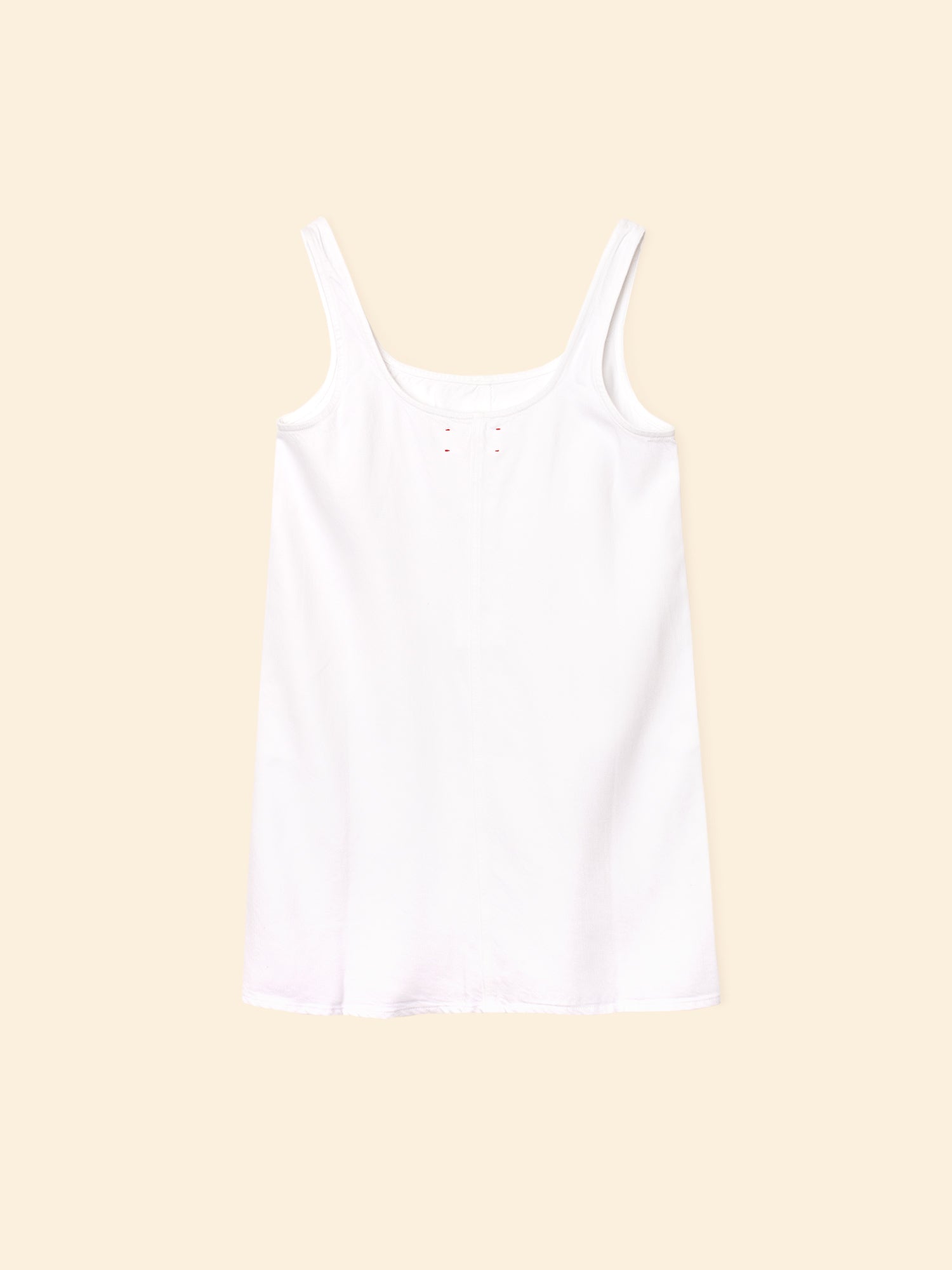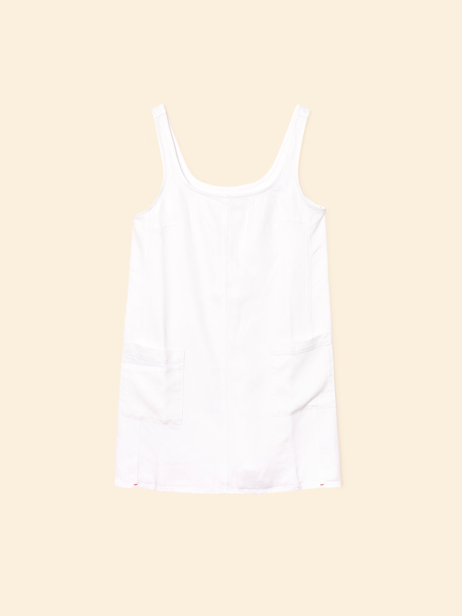 Forever Denim. Carissa is new this season in our drapey, ultra-soft lyocell denim. Carissa is an overall mini dress with a square neck, two front patch pockets, and seam details throughout.
