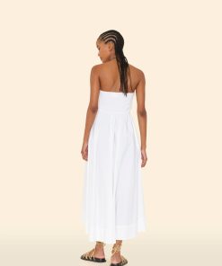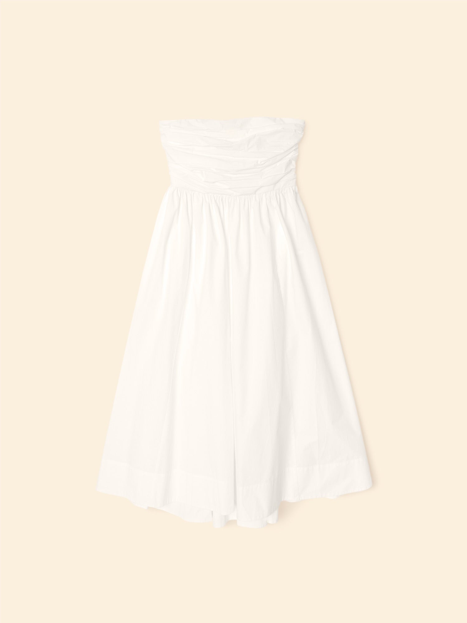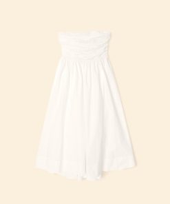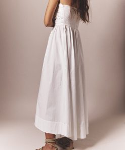 Pretty Please. Clea is made in our new crisp paper poplin with a refined feel. This strapless midi sundress features a gathered bodice with a smocked back, side seam pockets, and high low hem.