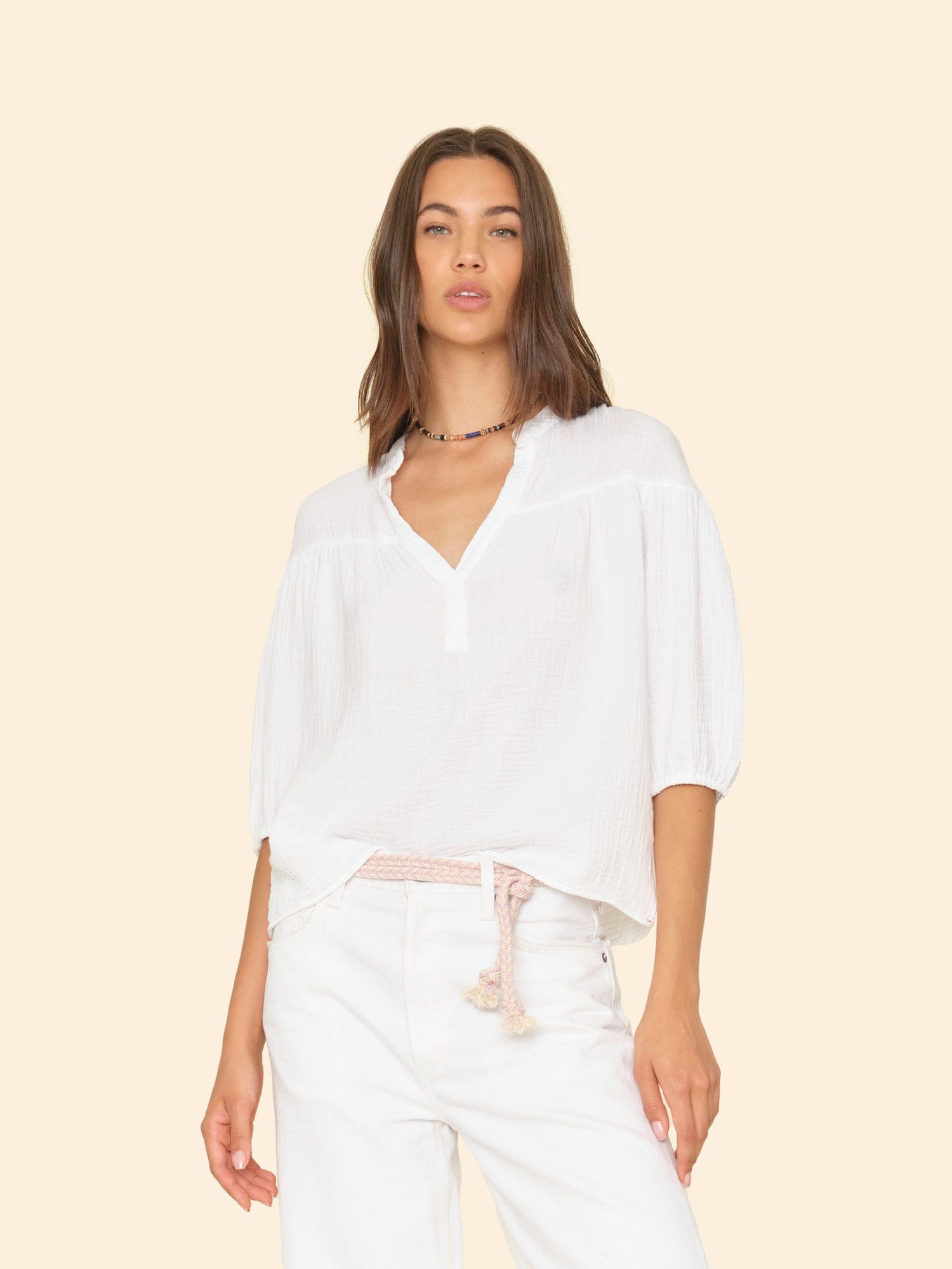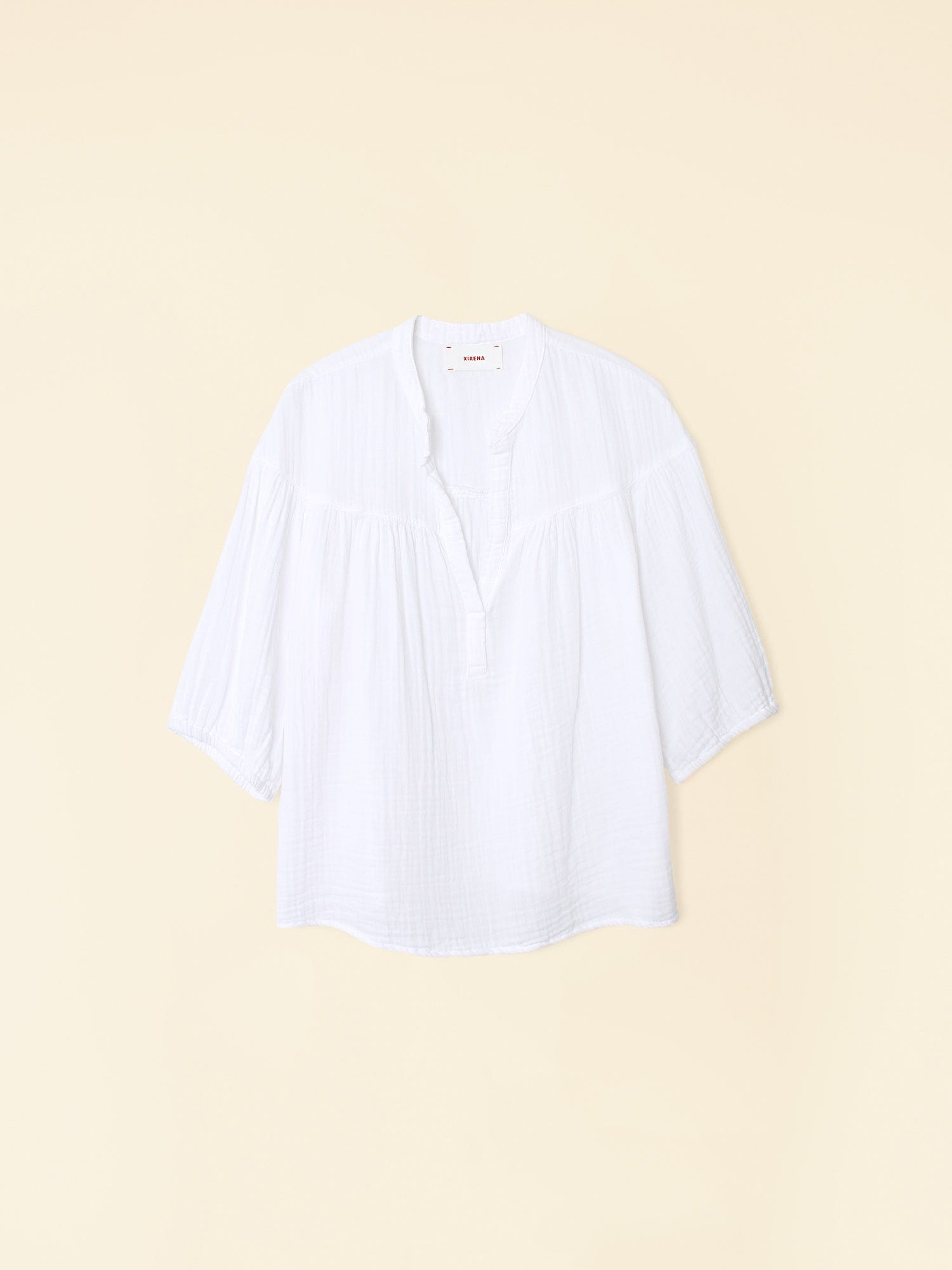Bare Necessities. Clem is made in our washed double faced cotton gauze for a soft, gently crinkled feel. This easy popover has a split V-neck, three-quarter length sleeves, and shirred yoke.