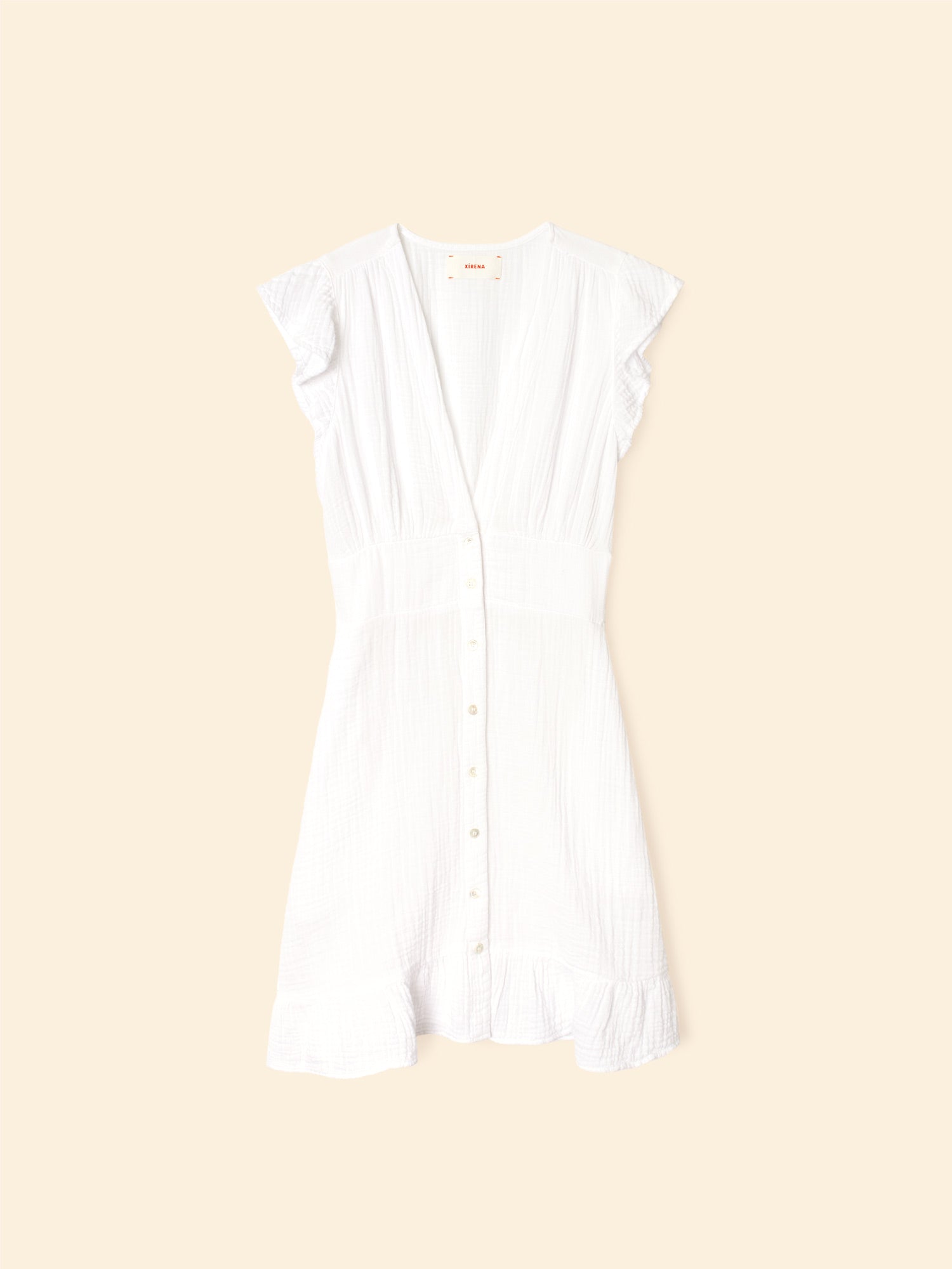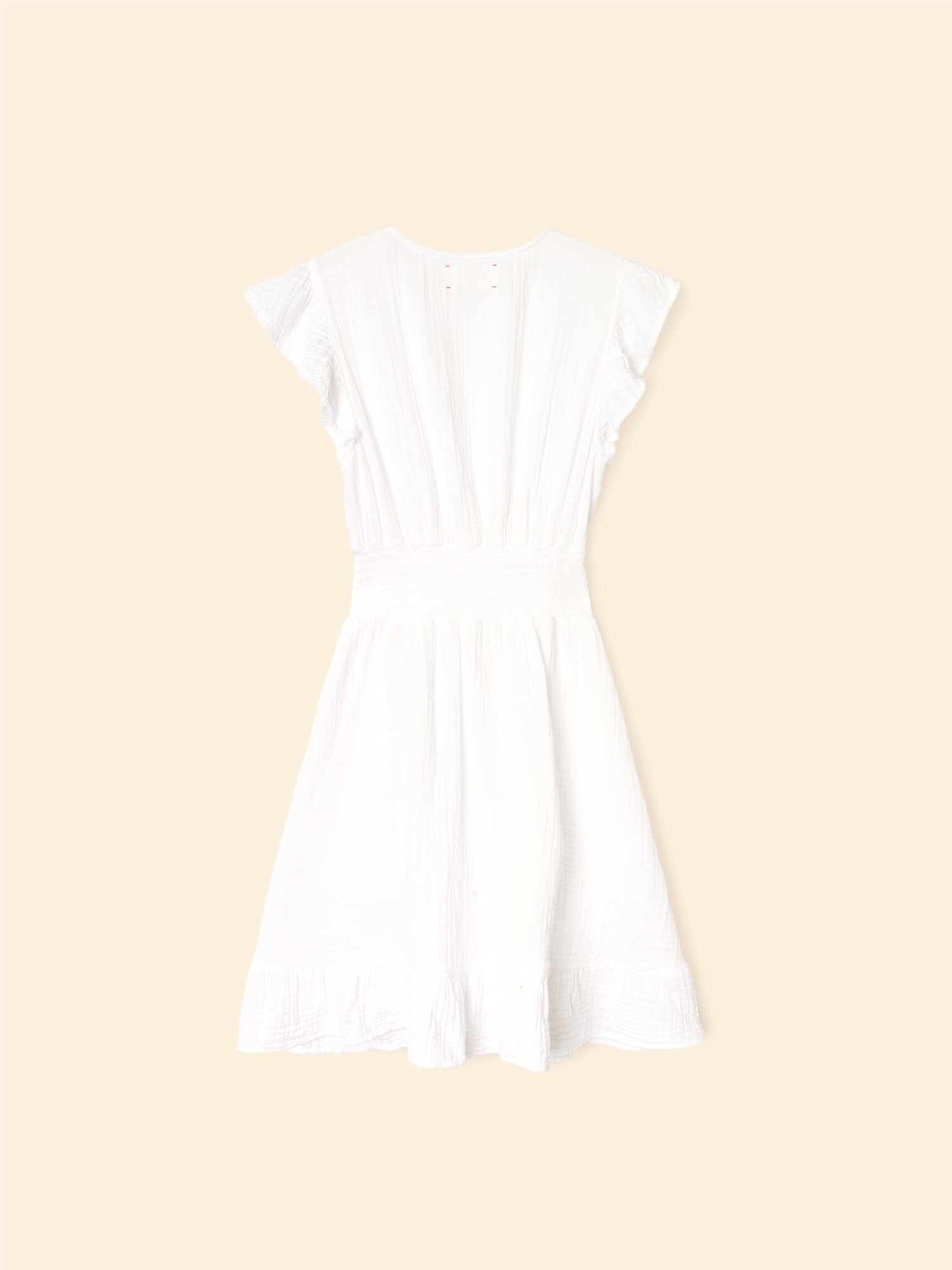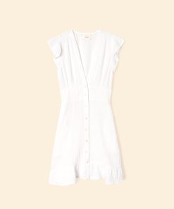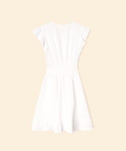 Short and Sweet. Dalton is new this season in our washed double faced cotton gauze for a soft, gently crinkled feel. This button-front mini dress features a deep V-neck, smocked back waist, and ruffle sleeves and bottom hem.