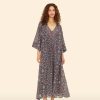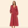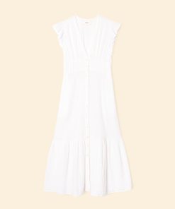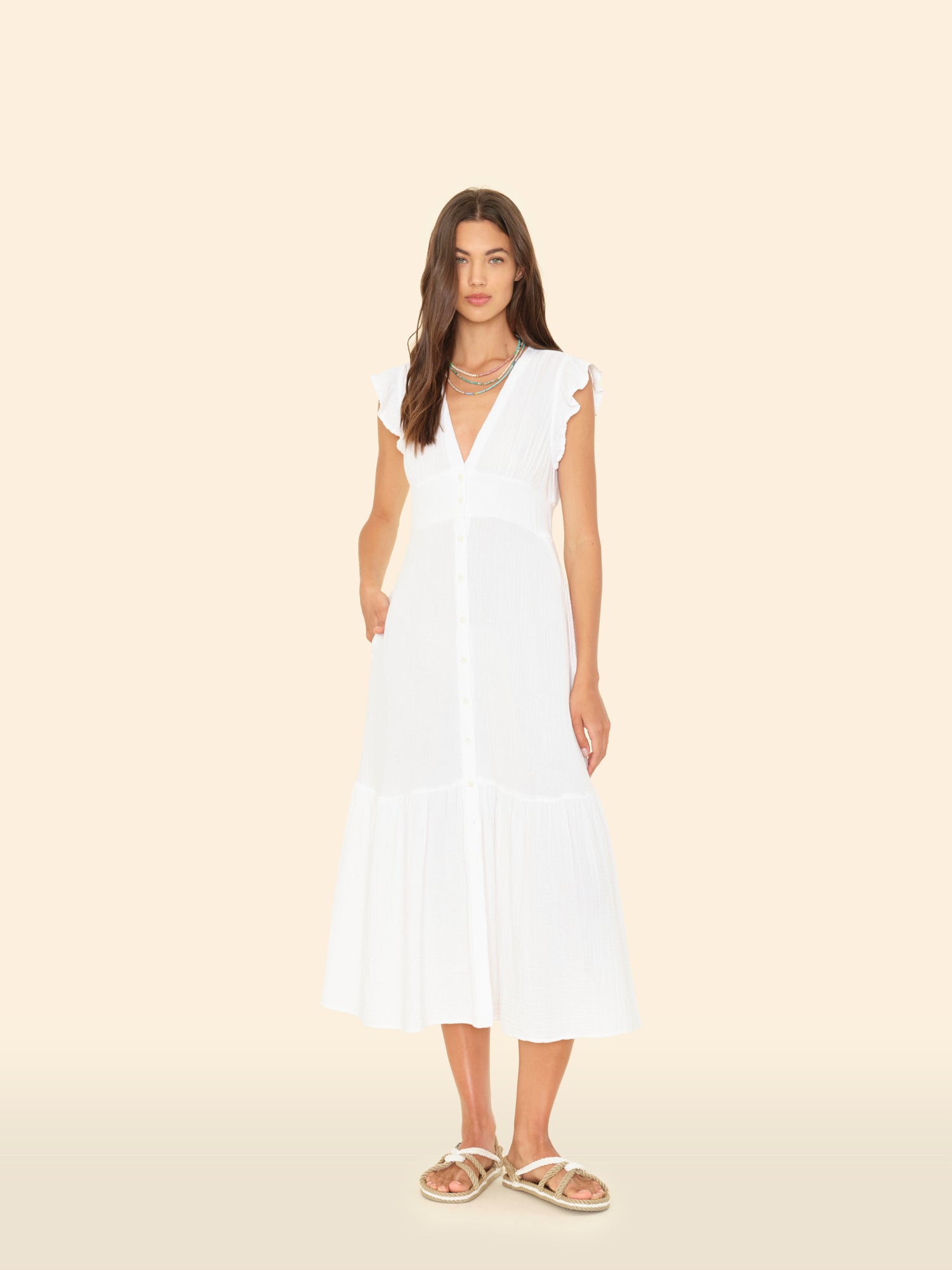 Pretty Please. Davana is new this season in our washed double faced cotton gauze for a soft, gently crinkled feel. This button-front midi dress features a V-neck, ruffle sleeves, side seam pockets, and a flounce ruffle hem.