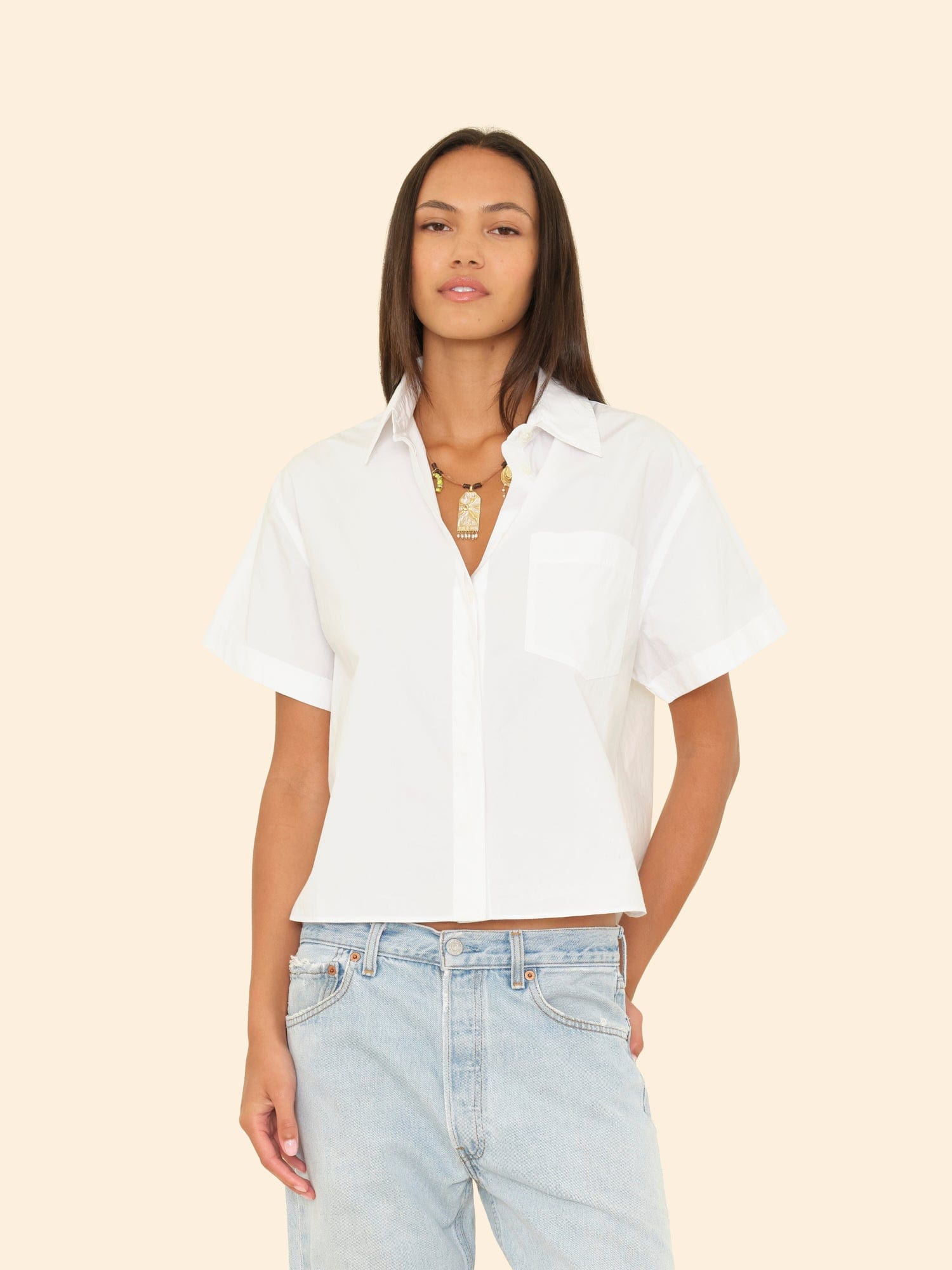 Easy does it. Drake is made in our new crisp paper poplin with a refined feel. This button-front shirt features a hidden placket, rolled sleeves, left chest patch pocket, and a high low shirttail hem.