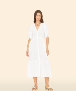 Easy Breezy. Our bestselling Lennox dress is back this season in our washed double faced cotton gauze for a soft, gently crinkled feel. This button-front tiered midi dress is an Xirena favorite, featuring a deep V-neck and puff sleeves.
